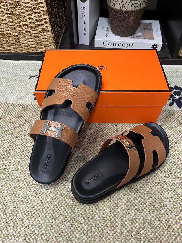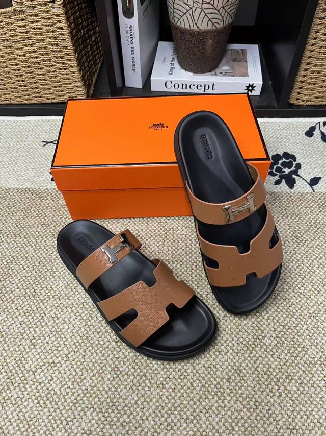Hermes new style slippers, always in stock. Made of cowhide leather with a durable, non-slip rubber outsole. Stylish and elegant, suitable for couples. Sizes: 36-46. (DDD)