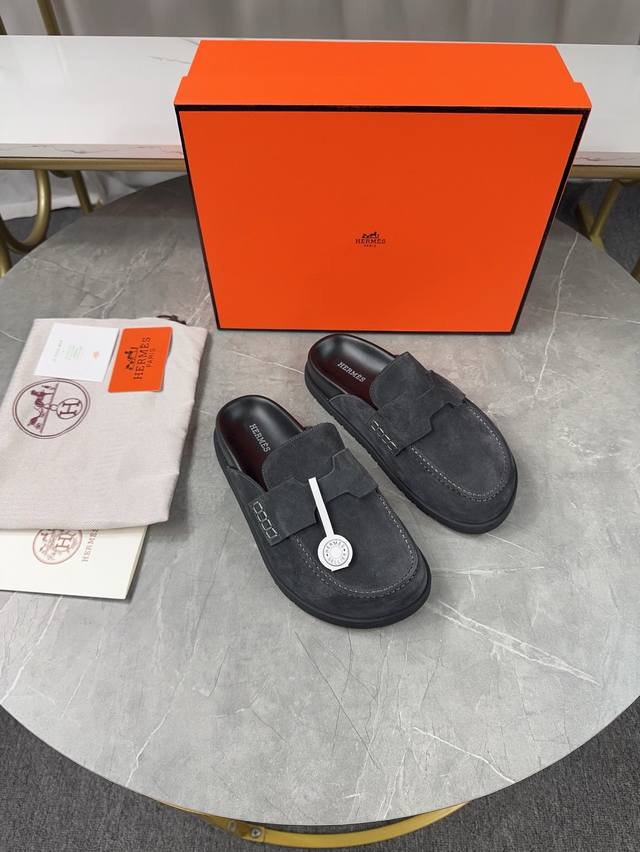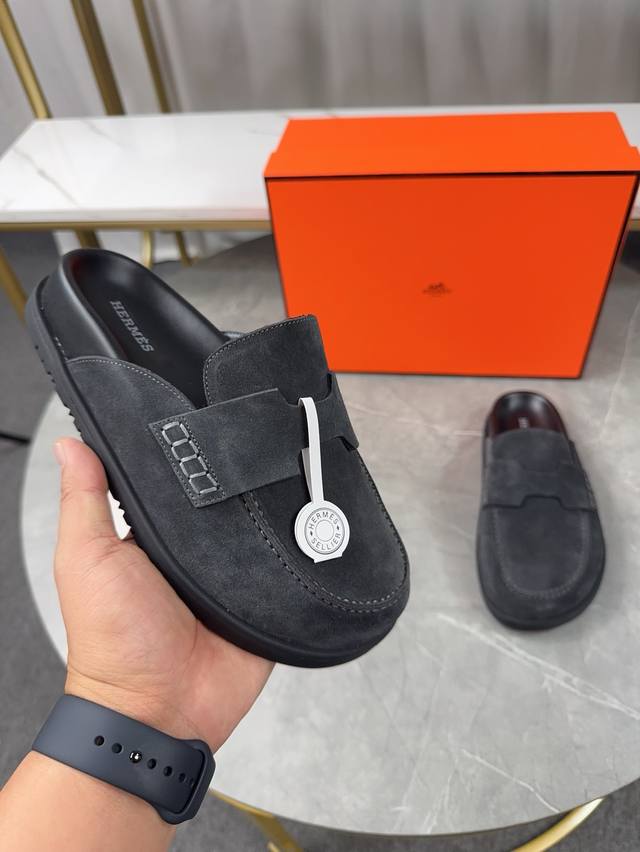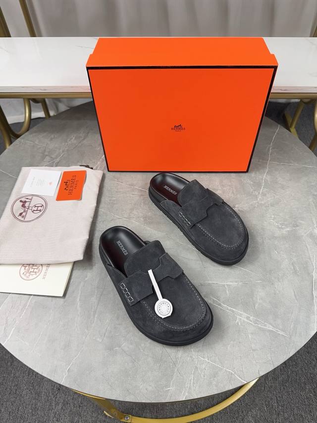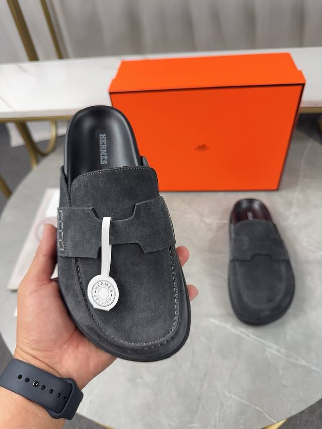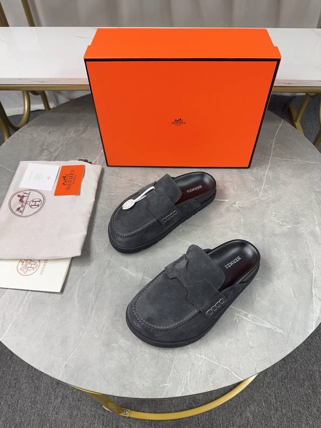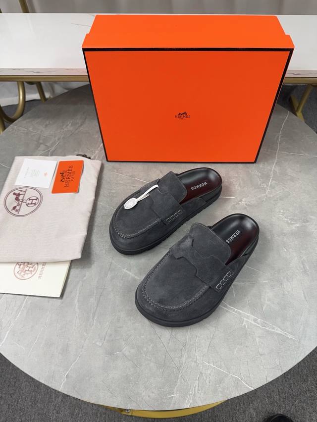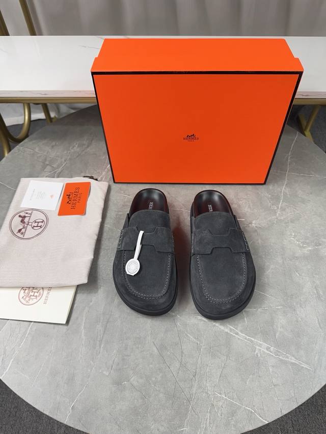 Men's size plus 10. Hermes Birkenstock Mules. A must-have for spring and summer, these versatile slippers offer a casual yet sophisticated feel, excellent comfort, and a playful oversized design. The slip-on design is convenient and practical. Upper: Original high-gloss calfskin. Lining: Water-dyed sheepskin. Outsole: Original TPU platform + rubber sole. Sizes: Women's 35-40, 40-41, -42 (no returns/exchanges); Men's 38-45, 45 (no returns/exchanges).