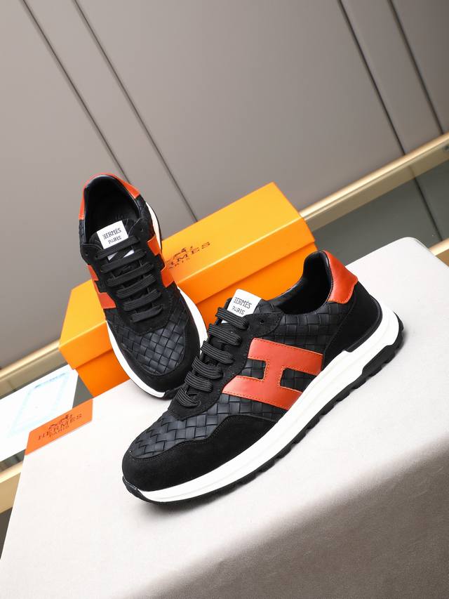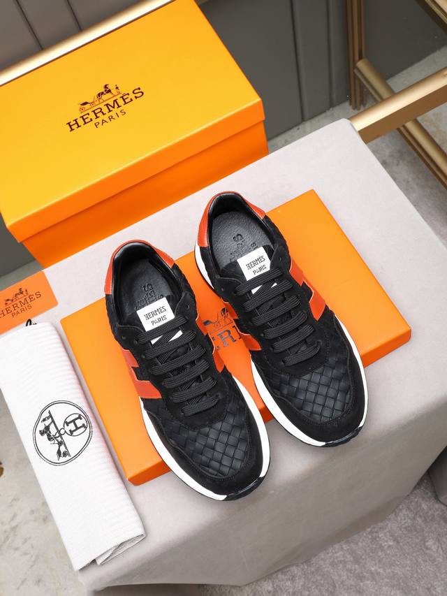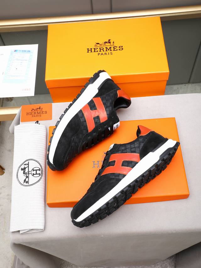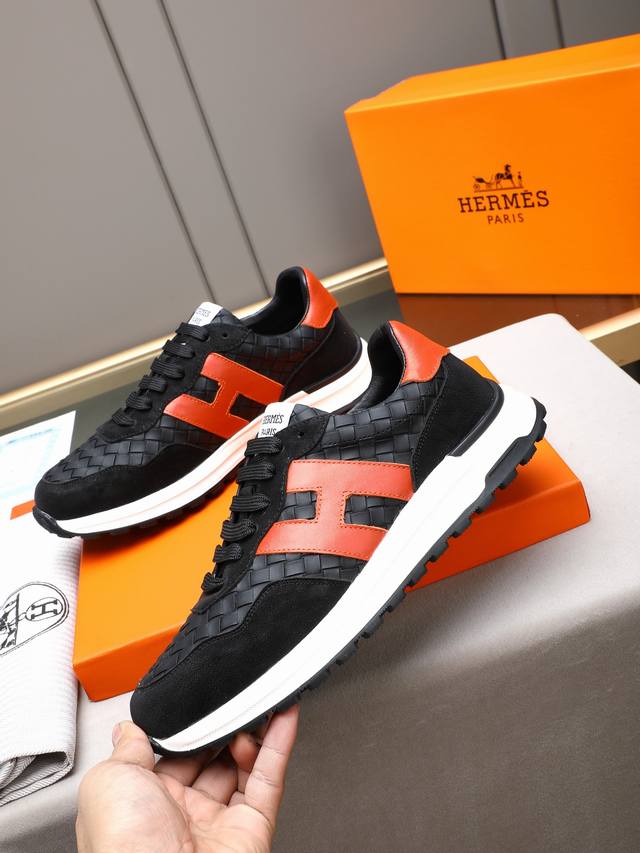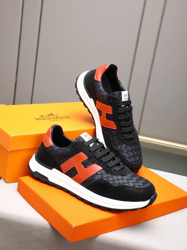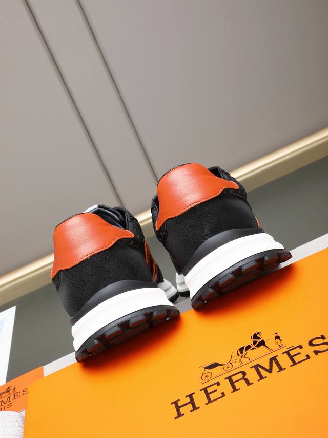 pp Hermes Men's Color-Blocked Sneakers, featuring textured calfskin details. The upper is made of original calfskin, drawing inspiration from the equestrian world and blending technical details with practical functionality. It boasts a breathable sheepskin lining, an original combination outsole, and high-end quality, with every detail perfectly integrated! Sizes: 38-44, 45 (custom sizes available).