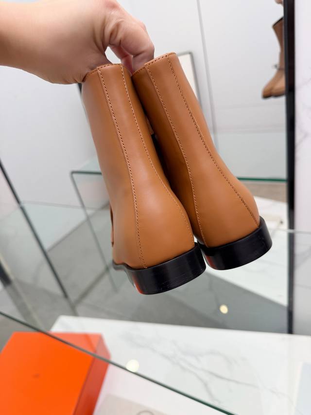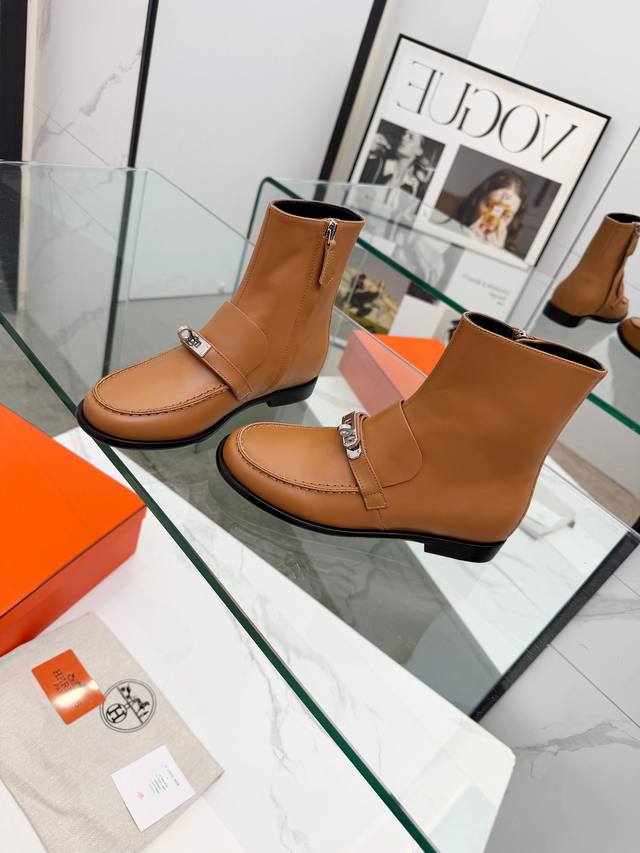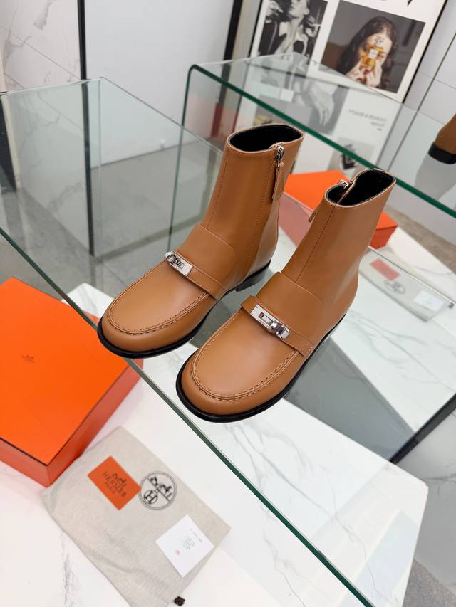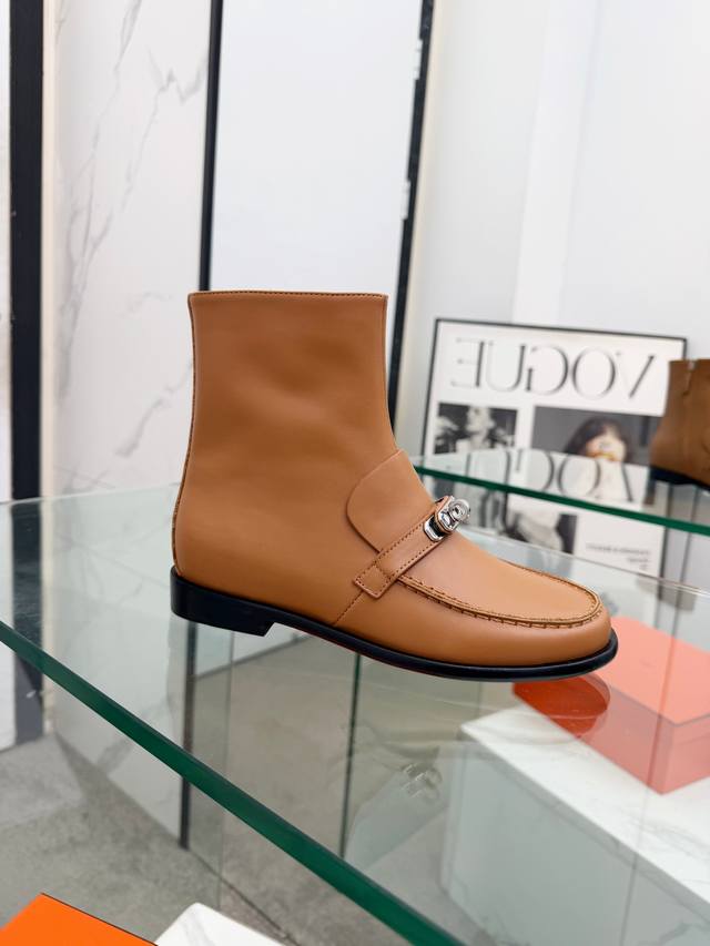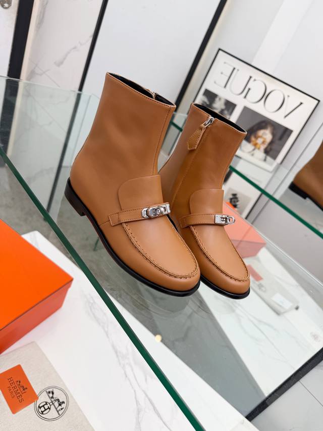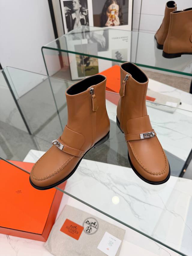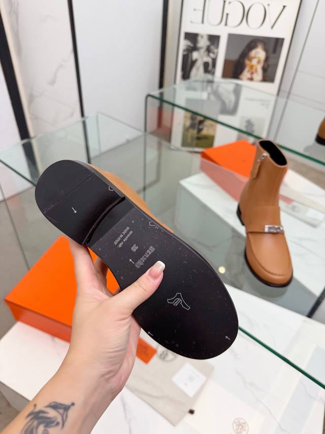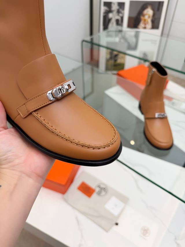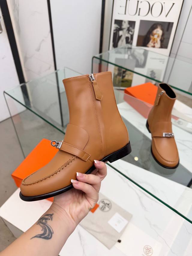 Top-tier Hermes 25Wf Autumn/Winter New Arrival: Kelly Buckle Retro Flat Ankle Boots. Inheriting Hermes' century-old craftsmanship, every detail showcases exceptional quality. The iconic Kelly buckle adorns the boot's surface, shimmering with metallic luster. Smooth lines and exquisite details exude luxury. Continuing the classic legend, it's a symbol of Hermes' taste. Whether on city streets or strolling outdoors, these boots offer stability and comfort. The boot shaft height is just right, fitting the ankle perfectly and flattering the leg lines, making legs appear slimmer and longer. Paired with jeans, they offer a chic and casual look; paired with a dress, they are elegant and charming, easily adapting to various styles and becoming a versatile fashion item for all seasons. Material: Original custom leather. Lining: Sheepskin insole. Sole: Italian imported genuine leather outsole. Size: 35-39, 40-41 (custom sizes available).