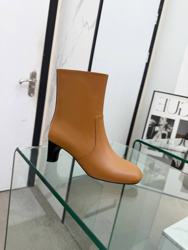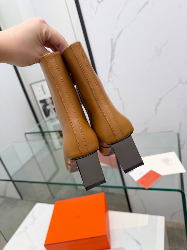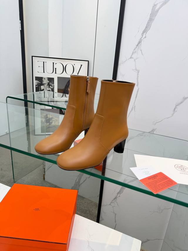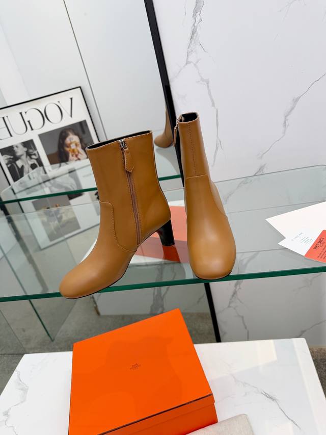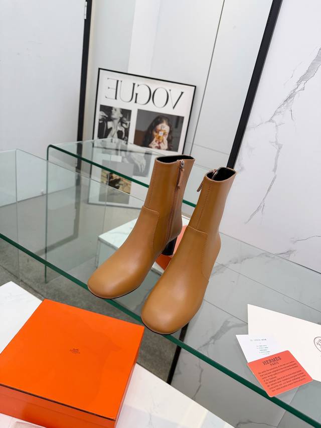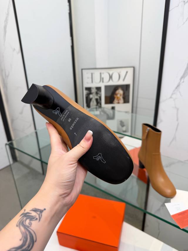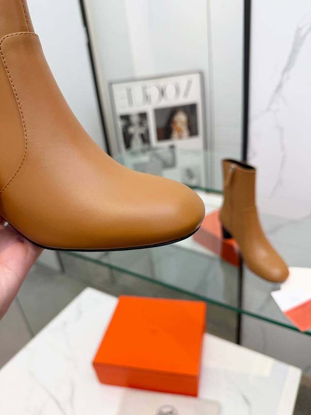 Top-tier replica Hermes 2025 Fall/Winter new Lisa chunky heel side zipper ankle boots with Hermes logo, high heel, round toe, and Martin riding boots. Material: Imported calfskin upper + water-dyed sheepskin lining + Italian genuine leather outsole. Heel height: 5.5cm. Size: Women's sizes 35-41. Sizes 40 and 41 are custom-made and non-refundable.