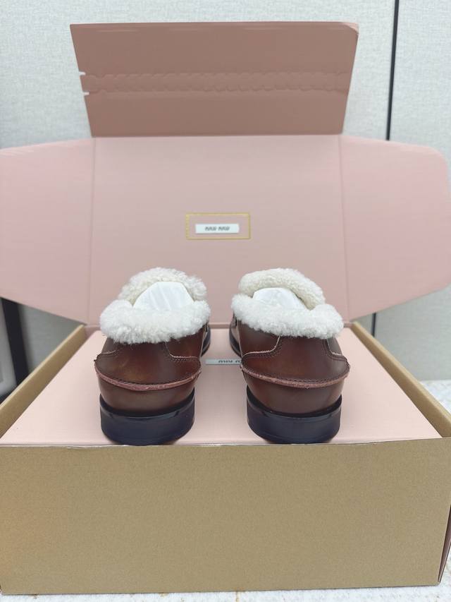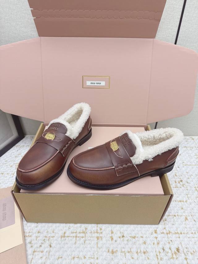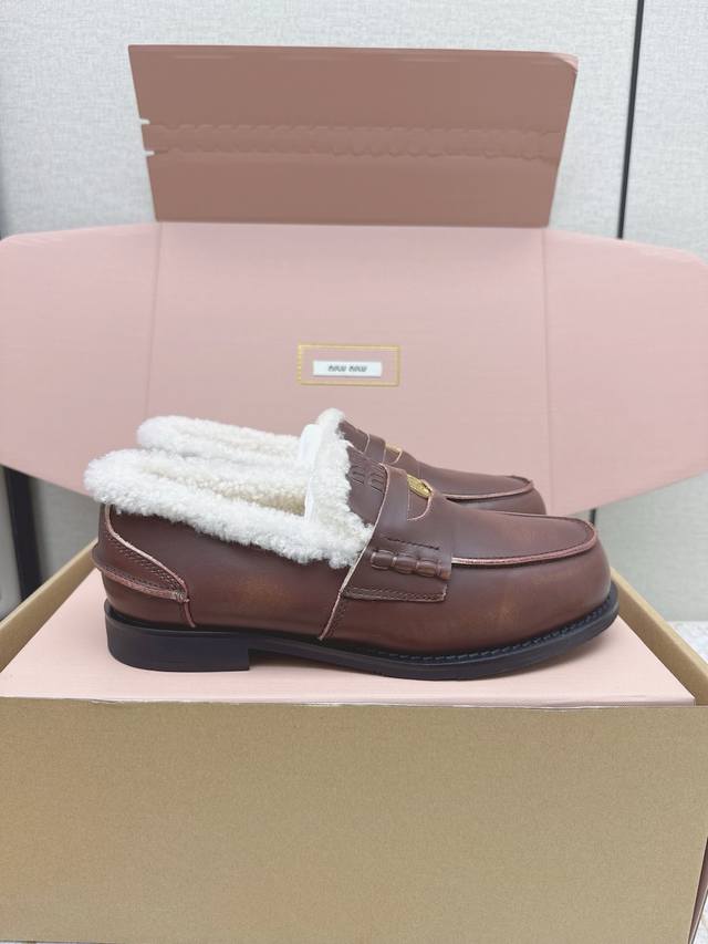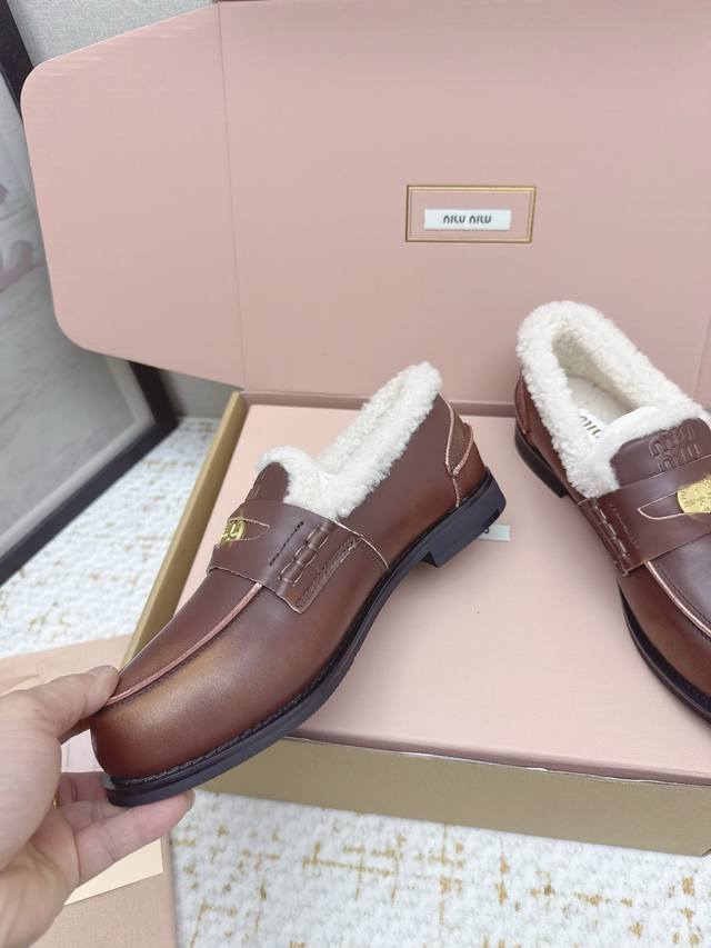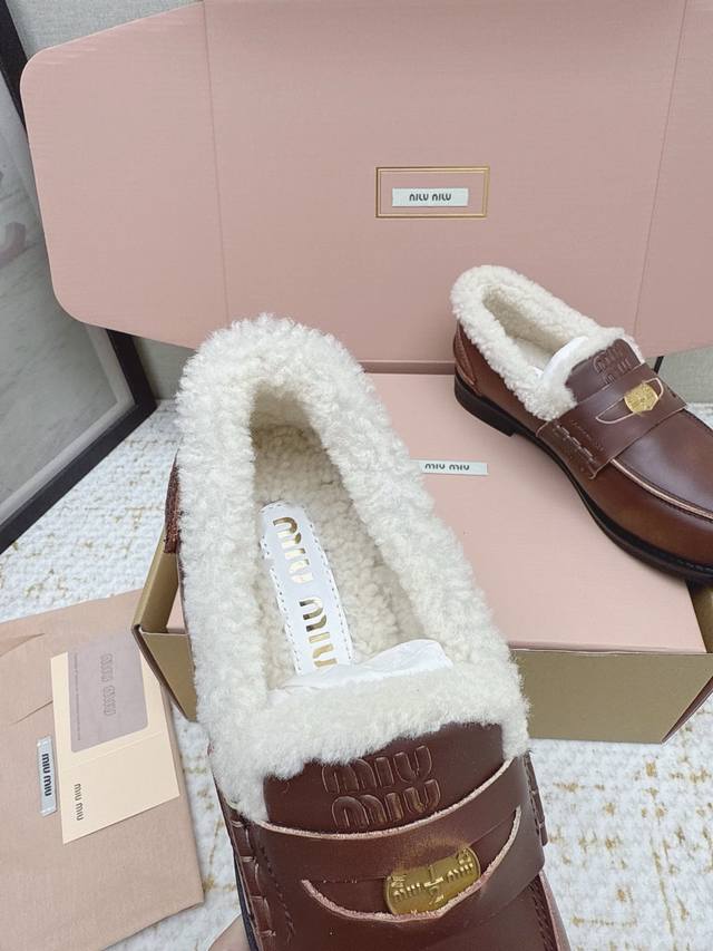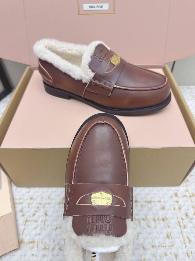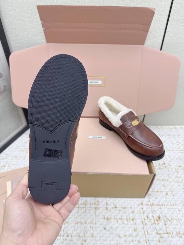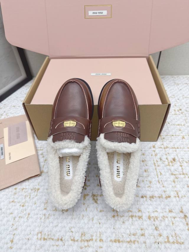 High-quality factory version Miu Miu Fall/Winter latest coin loafers, fluffy shoes. Many celebrities and fashion bloggers have been raving about them. They look so warm and the new coin design is absolutely irresistible. Besides the coin detail , the overall shoe shape is very elegant and not bulky. The toe is slightly upturned, and they look amazing on! Upper: Split-edge deerskin, distressed cowhide. Lining: Imported European genuine wool. Outsole: Original molded anti-slip outsole. Size: 35-40. Size 40 is custom-made and non-refundable.
