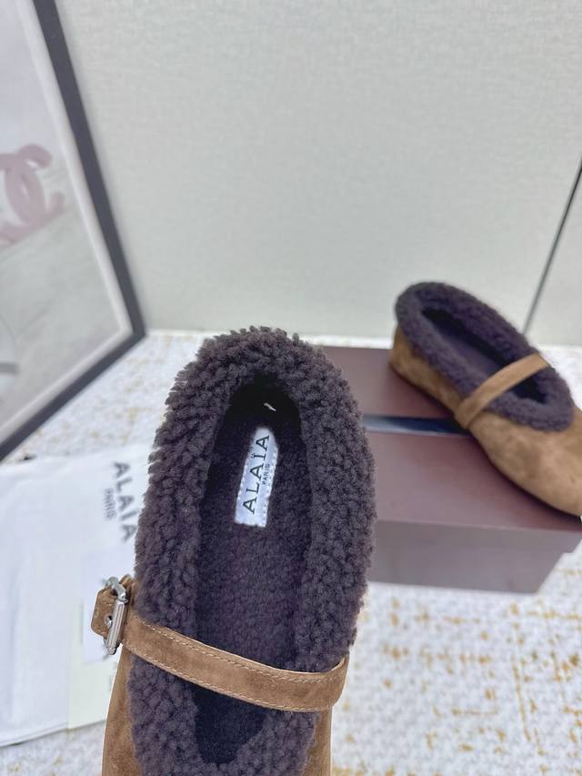 High-quality factory-made Alaia 25Ss Autumn/Winter New Arrival Flat Mary Jane Furry Shoes with Lambswool for Warmth! Original 1:1 Imported Lambswool. A must-have fashion item for autumn and winter from a niche trendy brand. The upper is made of high-quality fur material, soft and delicate to the touch. Every step feels like walking on a warm blanket, allowing you to feel cozy warmth even in the cold winter. The furry texture not only keeps you warm but also adds a touch of fluffy cuteness that makes you want to look at it again and again. The classic Mary Jane shoe shape has a retro charm. The rounded toe is playful and youthful, perfectly shaping the foot and making your feet look small and delicate. Whether paired with a sweet dress or a smart trousers, it can easily become the finishing touch to the overall look, warm and versatile for autumn and winter!