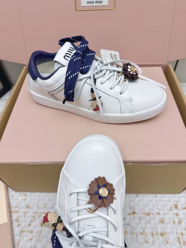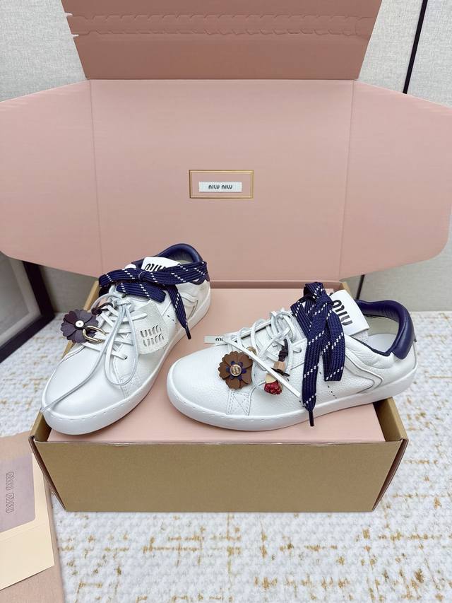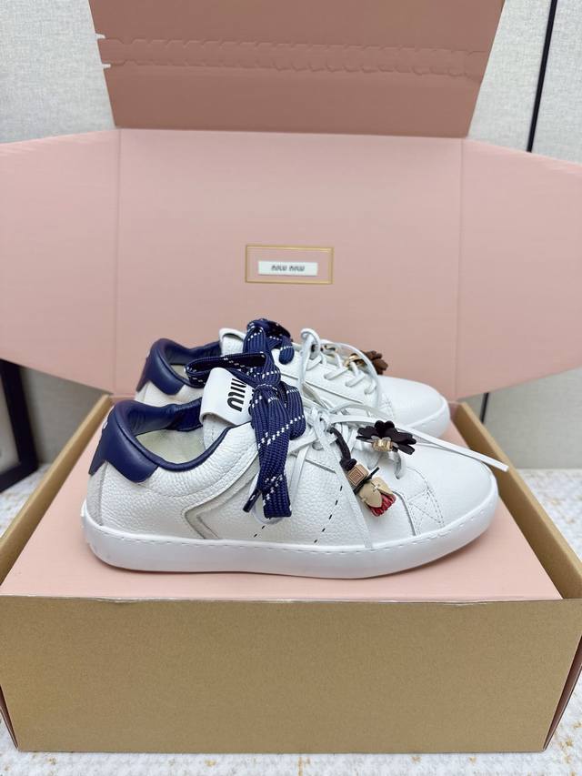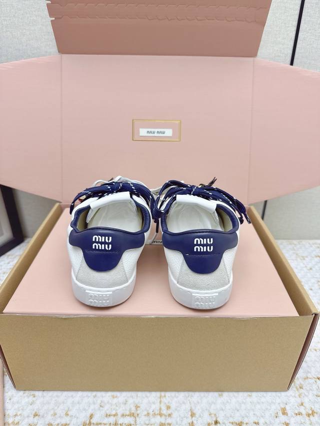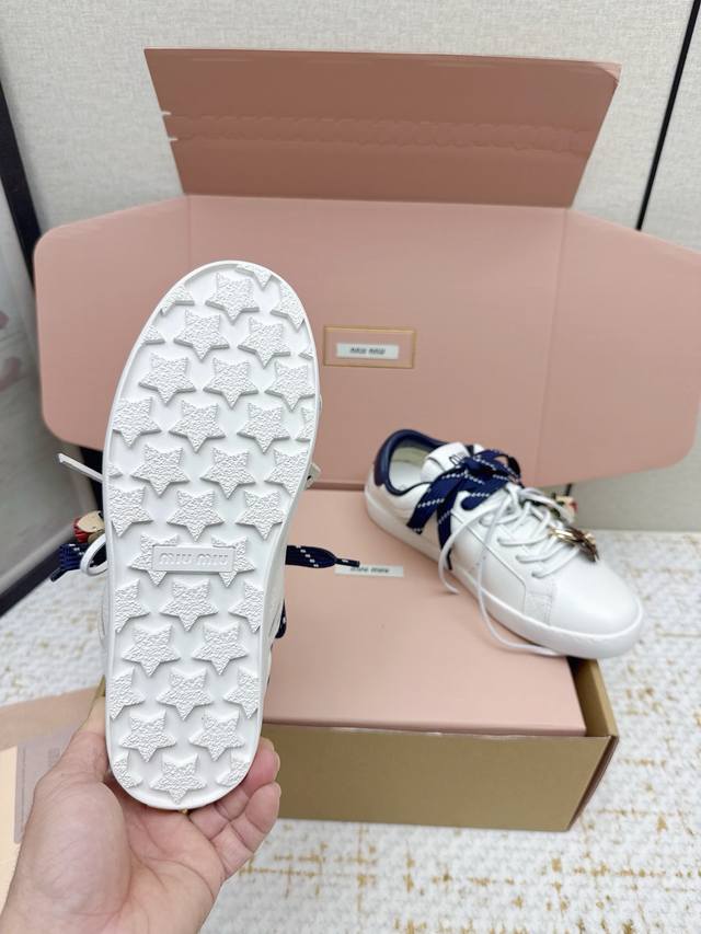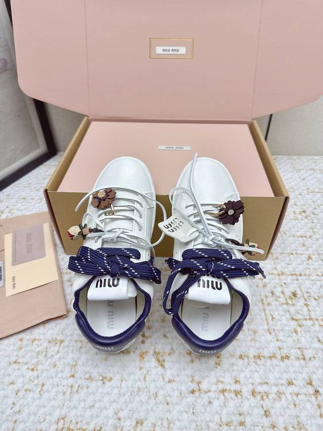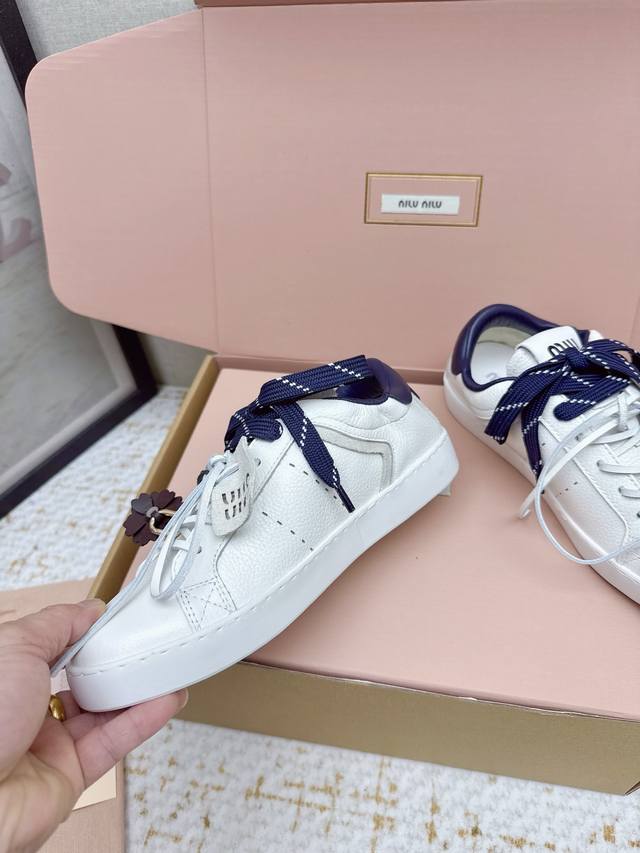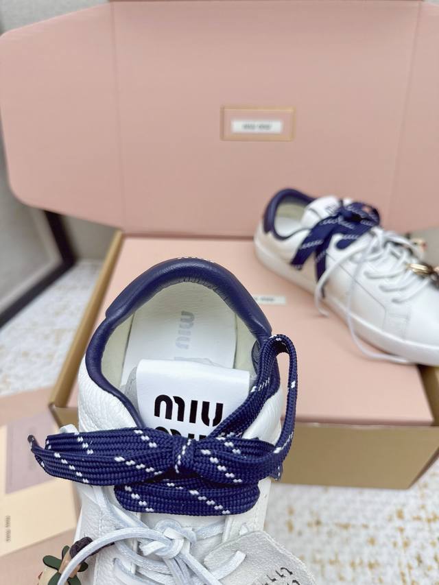 High-quality factory-made Miu Miu 26Ss thin-soled biscuit sole spring/summer new British style lace-up white sneakers. Unique color-rubbing technique from the runway. Detailed close-up of the series' details. New season's trendy elements