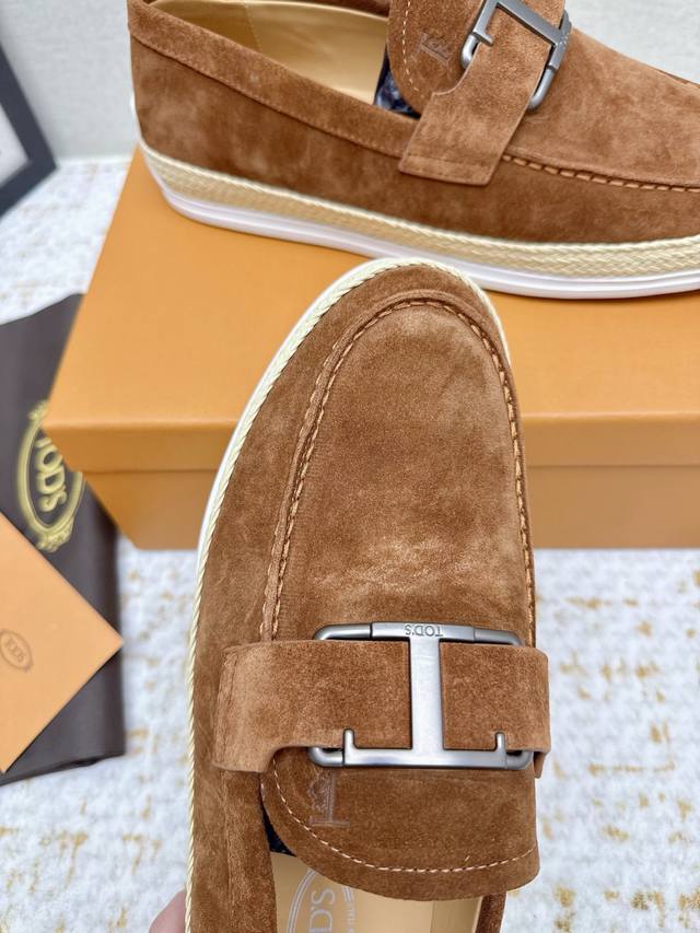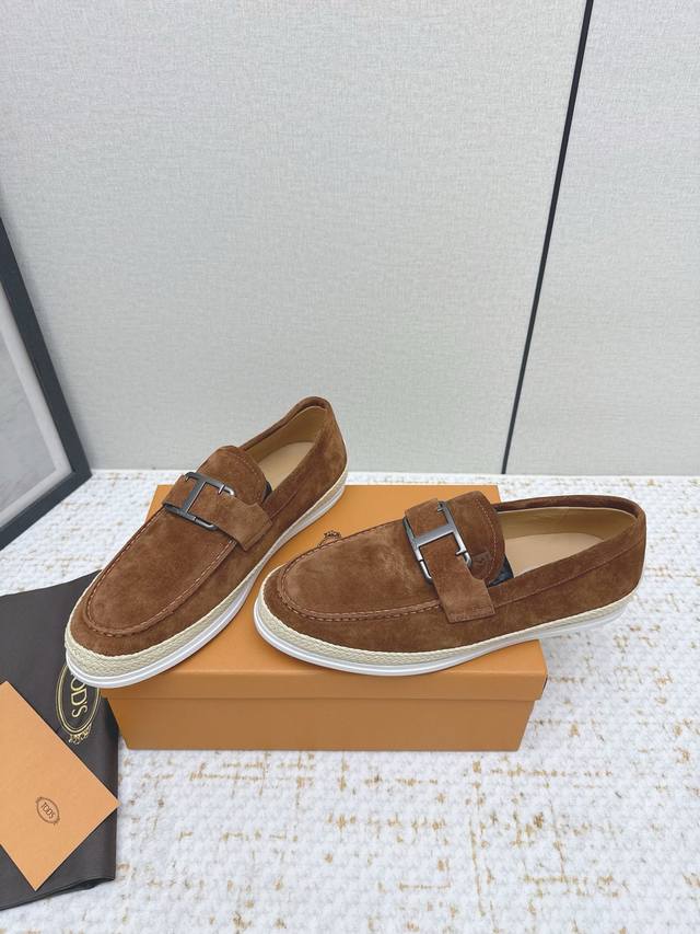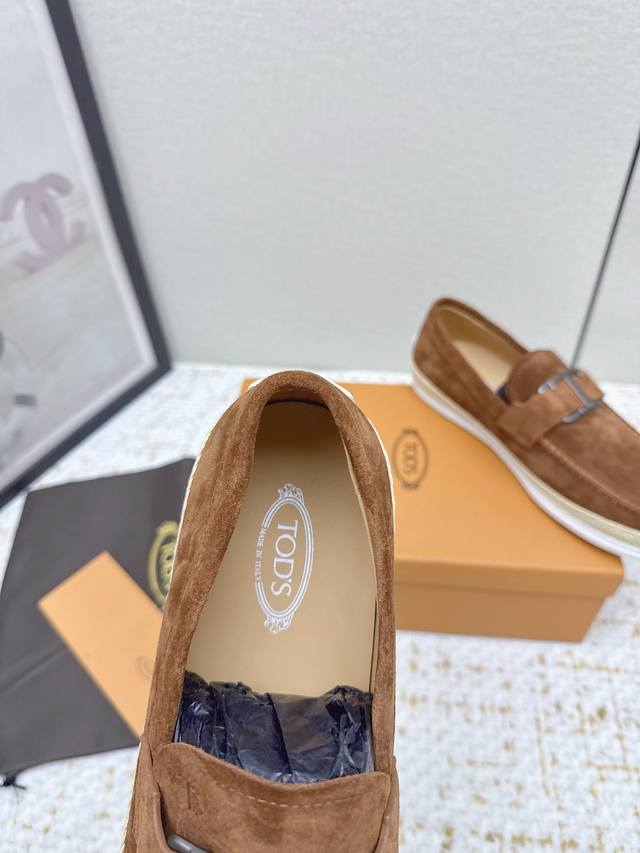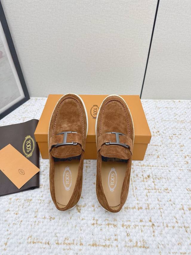 Tods loafers. These loafers are crafted from fine sheepskin leather, with a premium cowhide lining, adorned with a metal logo buckle, and feature a rubber outsole with pegs at the heel. Casual and versatile, they are a timeless classic. Sizes #39-45, sizes 38 and 46 can be custom-made.