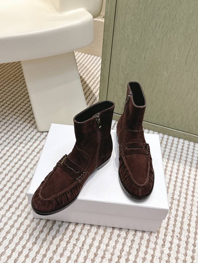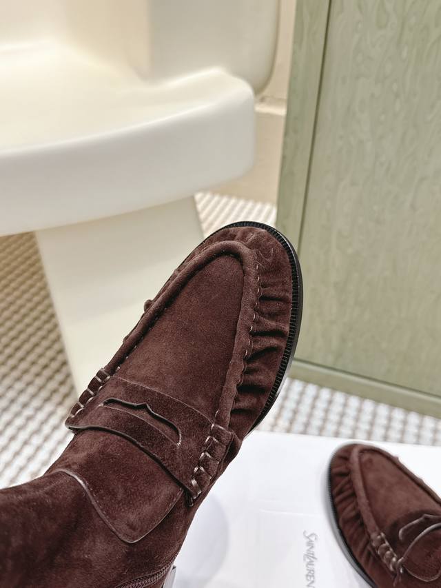 High-quality Yves Saint Laurent 25Ss new arrival YSL small logo high-top loafers. The iconic small logo is the soul of these shoes, presented with a low-key yet refined style. Unlike the ostentatious large logo, it is quiet yet eye-catching, outlining YSL's unique fashion with simple lines, subtly revealing the brand's profound heritage. The classic almond-shaped design of the toe cleverly flatters the foot shape, visually lengthening the foot line and highlighting elegance and delicacy. Whether paired with simple wide-leg pants or a playful mini skirt, it can easily showcase different styles, becoming the finishing touch to any outfit. Material: Original custom leather; Lining: Sheepskin insole; Outsole: Italian imported genuine leather; Size: 35-39, 40, 41, 42, 43 (customized).