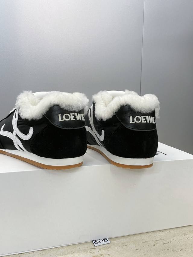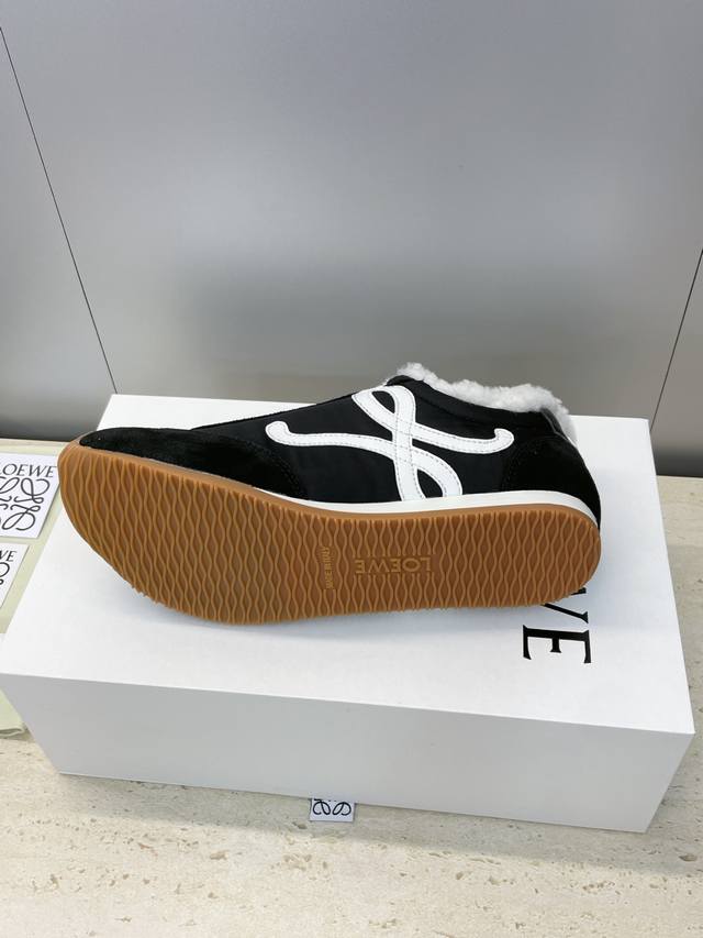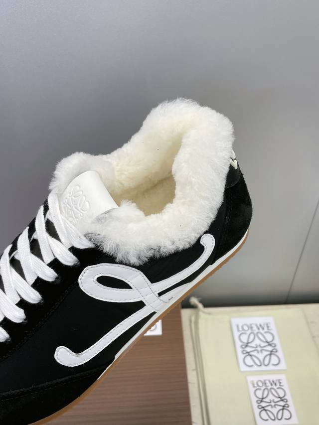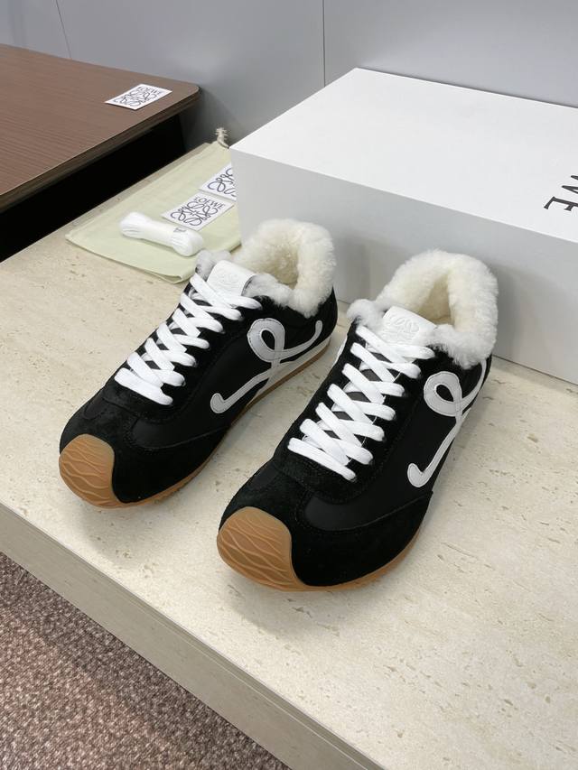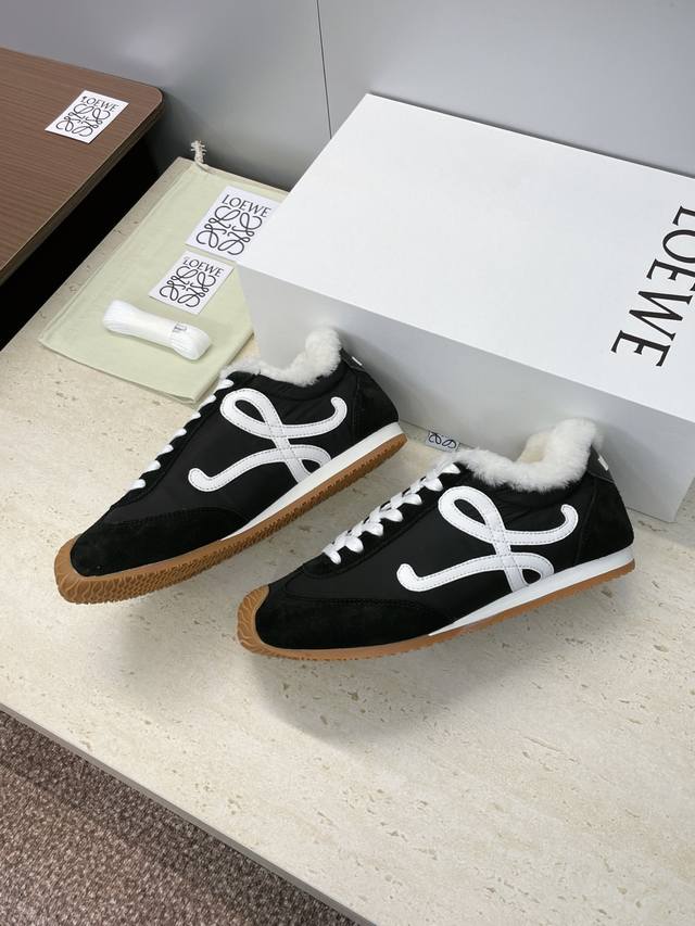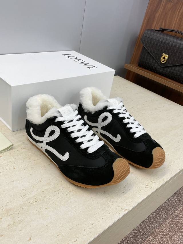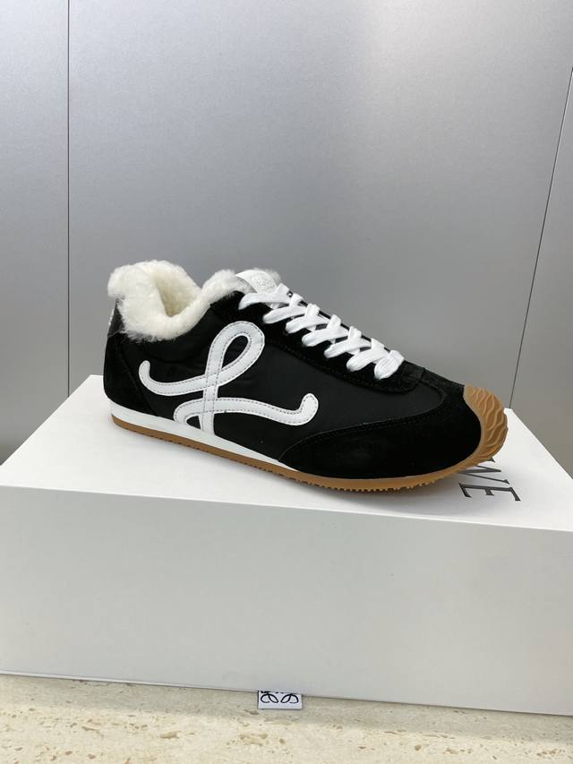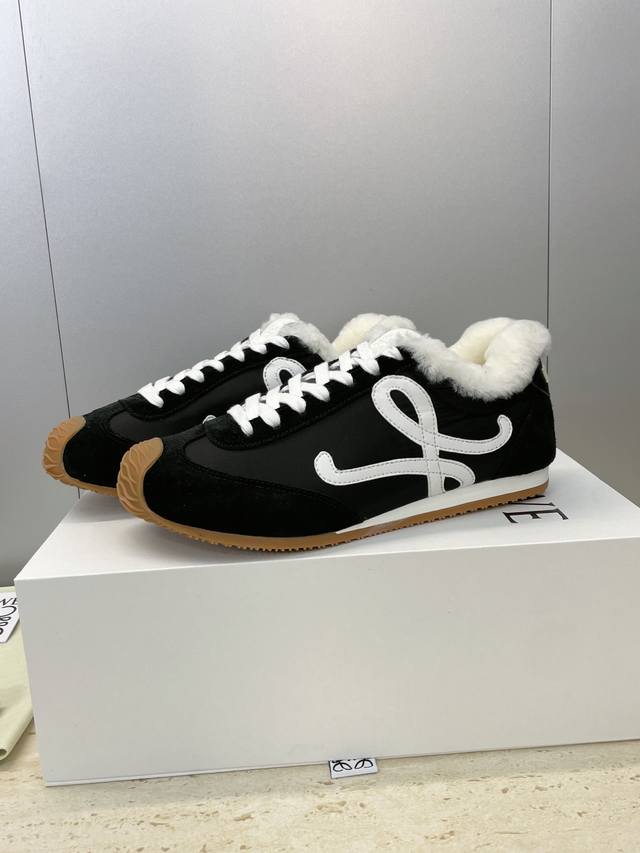Factory direct price, women's and men's sizes available. Loewe 2025 Autumn/Winter New Ballet Runner 2.0 Couple Style Thick-Soled Lace-Up Warm Furry German Training Shoes, Celebrity Style, Letter Logo, Color Block, Forrest Gump Casual Sports Running Shoes, Top-Tier Version on the Market. Material: Imported suede upper, imported calfskin, environmentally friendly breathable nylon fabric + lamb's wool lining + original molded Eva anti-slip outsole. Size: Women's sizes 35-40 (40 is custom-made, no returns or exchanges); Men's sizes 39-45 (45 is custom-made, no returns or exchanges).