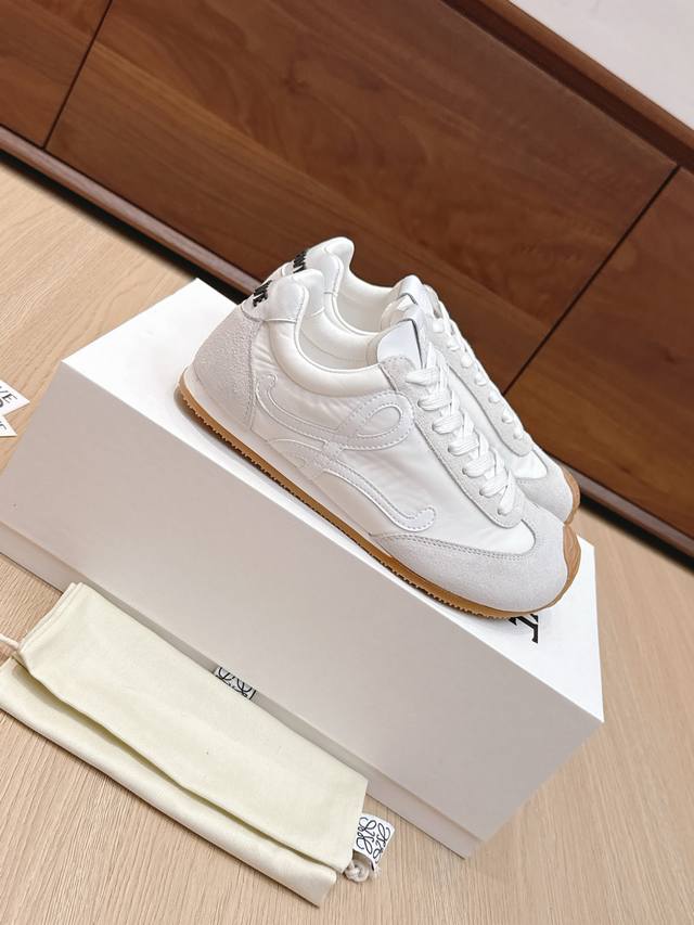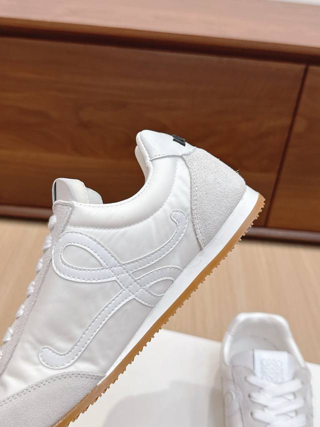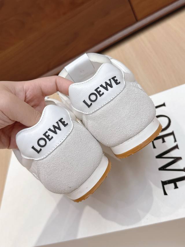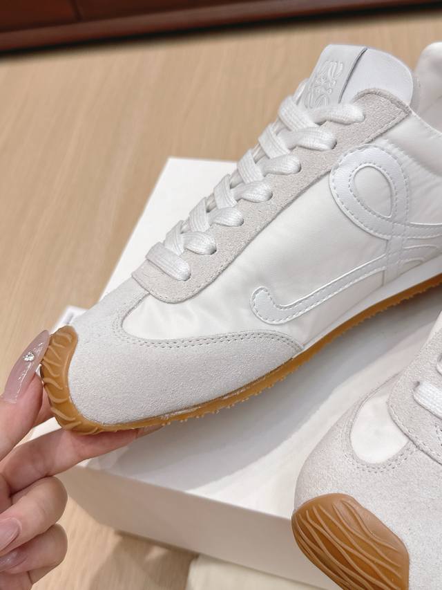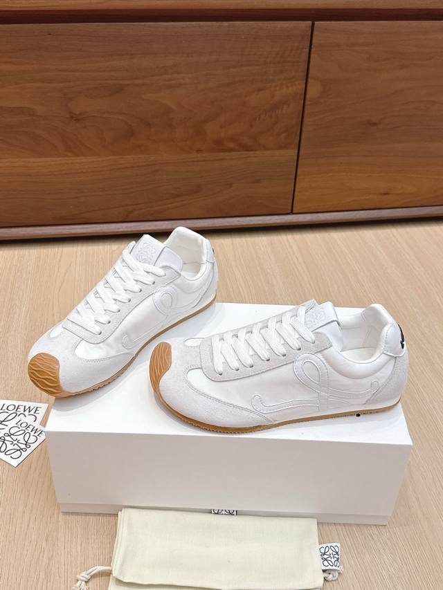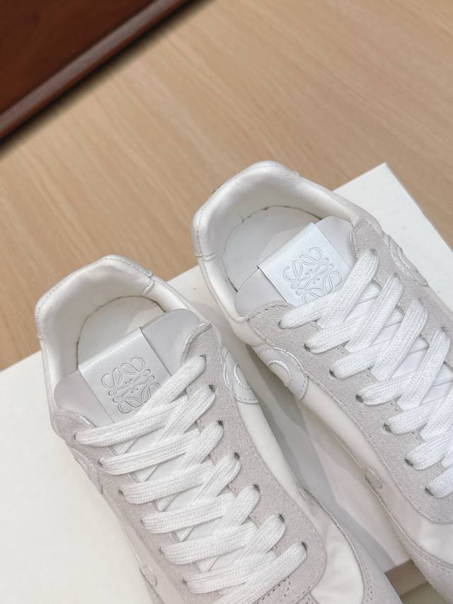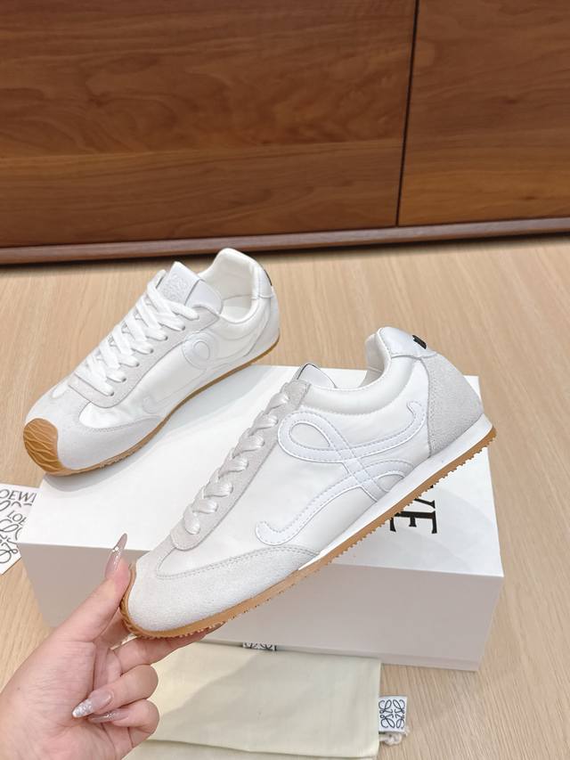 High-quality Loewe Ballet Runner 2.0 sneakers, featuring a more playful toe design and a novel, soft, and comfortable heel. These sneakers are hailed as the most comfortable walking shoes of the year, making walking feel like walking on flat ground! Sneakers recommended to be true to size. The shoes have a simple and clean low-top design, with the brand logo's initials on the side. Most importantly, once you wear these shoes, you'll fall in love and won't want to choose any other athletic shoes. Material description: The upper is made of imported cow suede, calfskin, and windbreaker fabric, requiring skilled stitching. Original custom molded outsole! Comes with complete packaging. Comfortable, simple, and versatile Loewe Ballet Runner 2.0, inspired by ballet shoes and 1970s footwear, with a touch of retro style! Original box packaging! Size: 35-45M