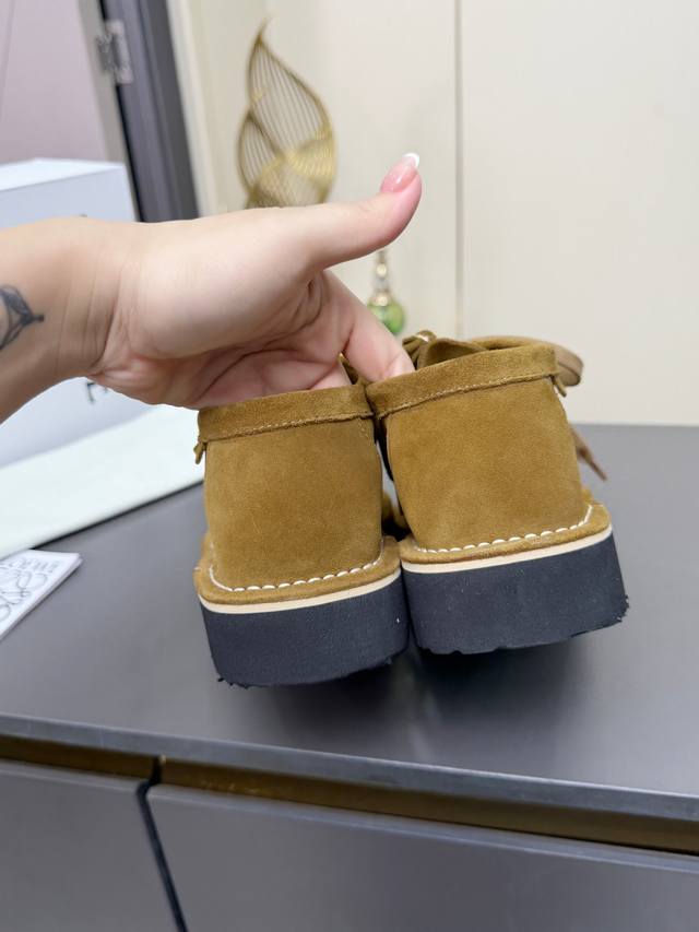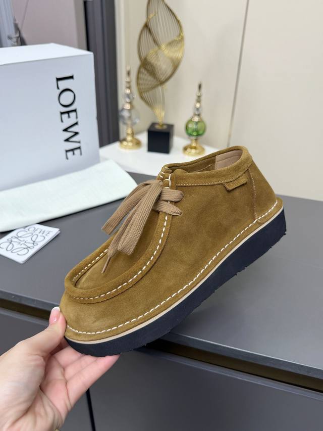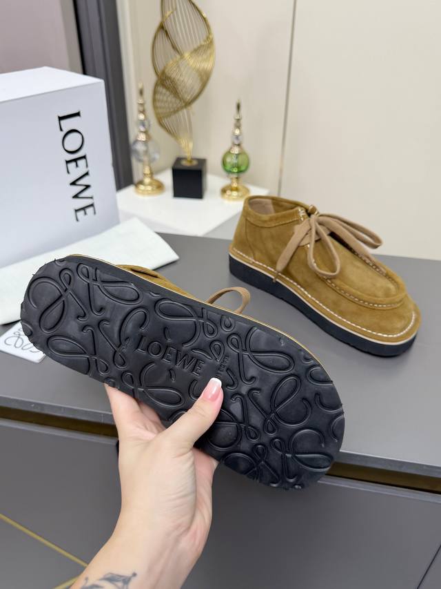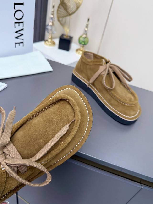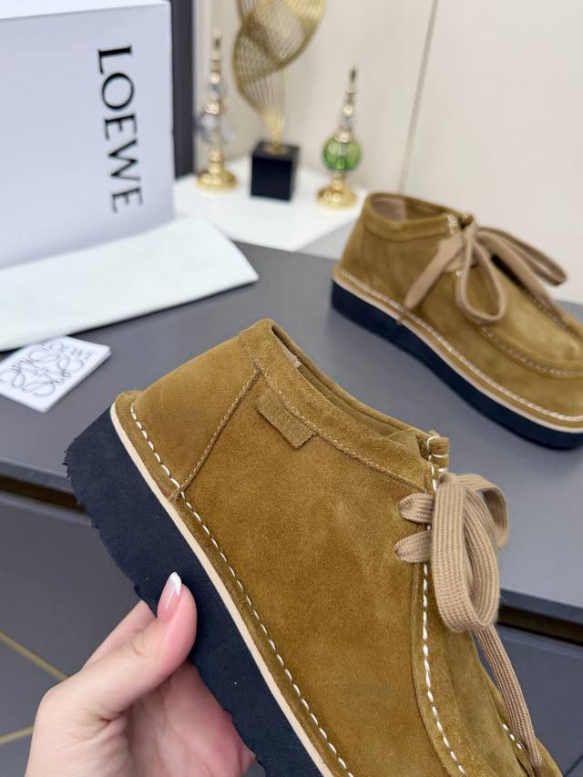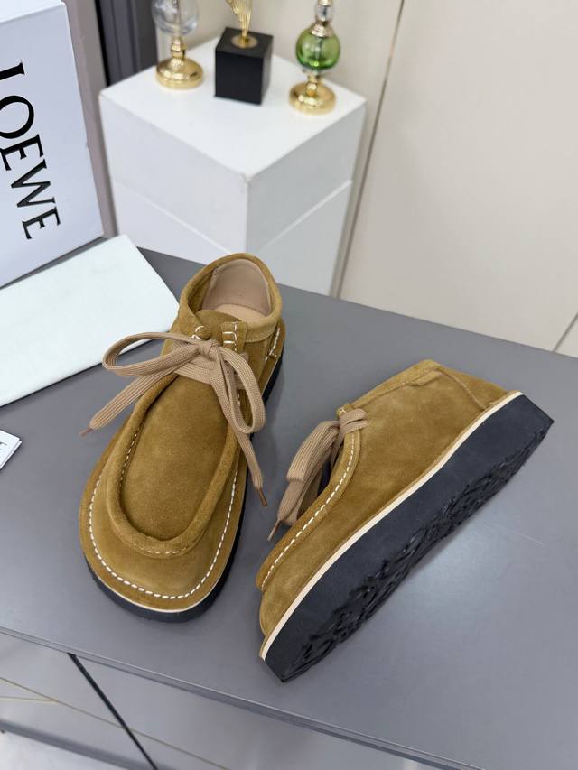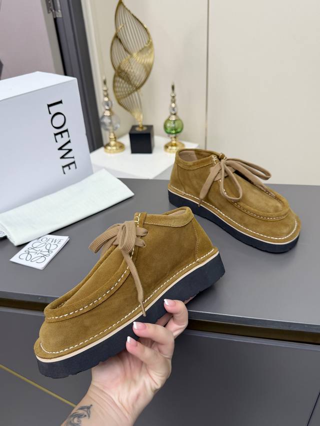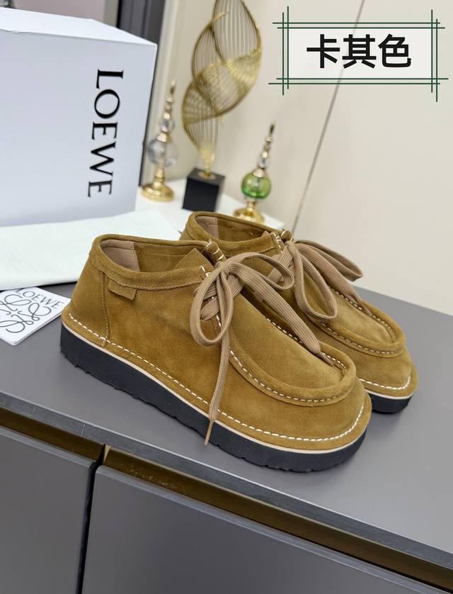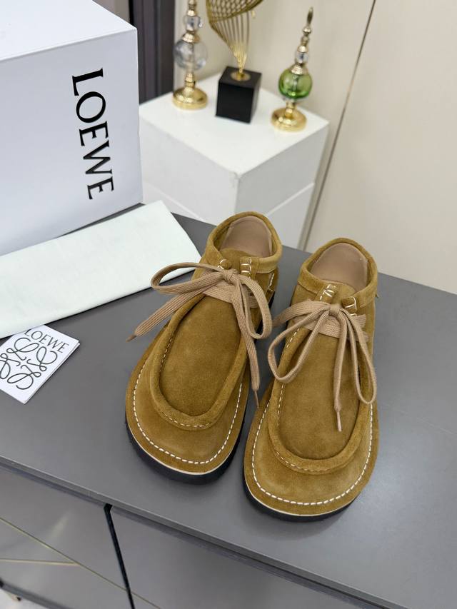 Loewe 's latest kangaroo shoes, featuring a thick sole and lace-up design in a retro British style. From design to quality, they offer a luxurious wearing experience. The upper is made of imported high-gloss suede, with a delicate texture and natural velvety sheen, exuding understated elegance. Paired with a lightweight Eva foam outsole, the 3cm heel height is just right, subtly elongating the figure while providing unparalleled comfort. Original purchase and development, with meticulous attention to detail, a must-have. A uniquely fashionable and trendsetting style, highly recommended for stocking up. The shoe shape is superb, the leather is soft and extremely comfortable, very comfortable to wear and easy to match. Material: Imported high-gloss suede. Lining: No lining. Outsole: Original Eva foam outsole. Sizes: Women's 35-40, factory price.