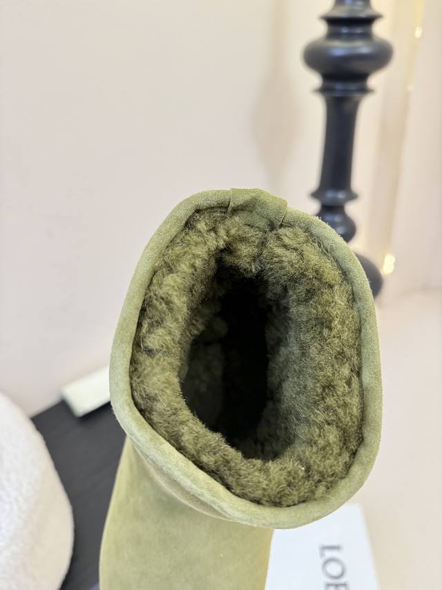 Original purchase, development and production. This Lago snow boot suede boot is decorated with shearling lining, paired with a thick round asymmetrical toe and an ultra-light rubber sole. The Anagram embossed TPU outsole is decorated with the Loewe label on the side