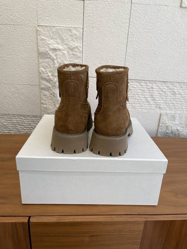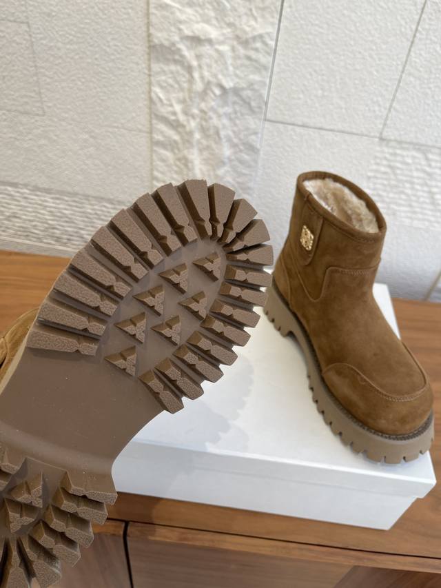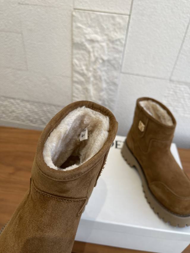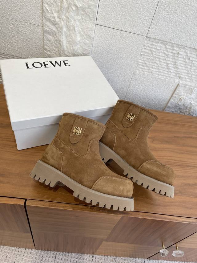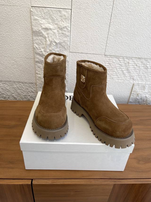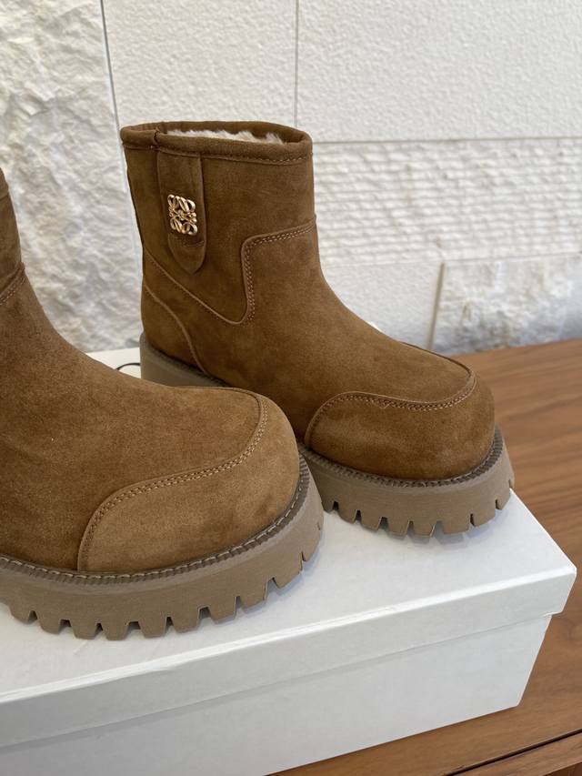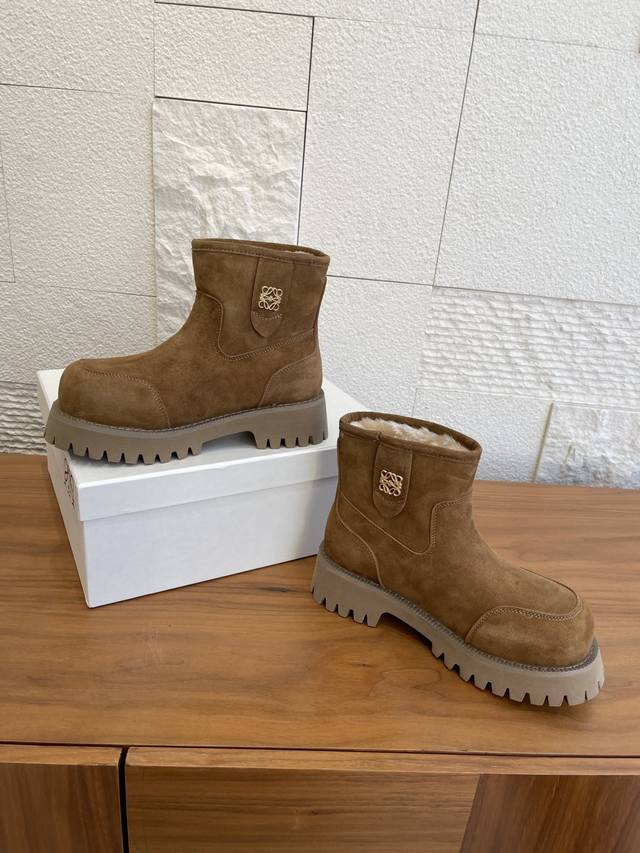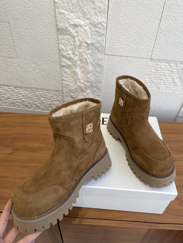 Top Version: Loewe 2025 Autumn/Winter New Thick-Soled Snow Boots. These Loewe snow boots are made of brown suede leather, with a delicate texture and comfortable wear. The gold hardware logo plaque on the side is highly recognizable and is a classic element of the brand. The serrated rubber sole is slip-resistant and stylish, and the thick sole design subtly adds height. They are versatile and can be paired with both trousers and skirts, easily creating a relaxed autumn/winter look. Material: Imported cow suede; Lining: Imported plush; Outsole: Original molded rubber outsole; Size: 35-41 (40-41 are custom-made and non-refundable).