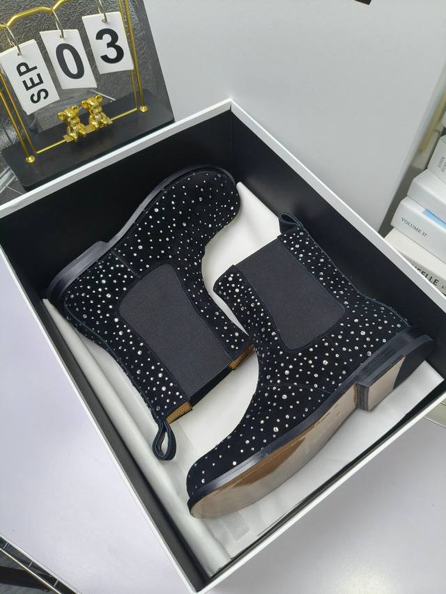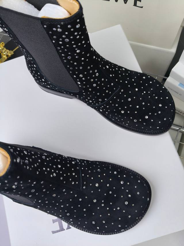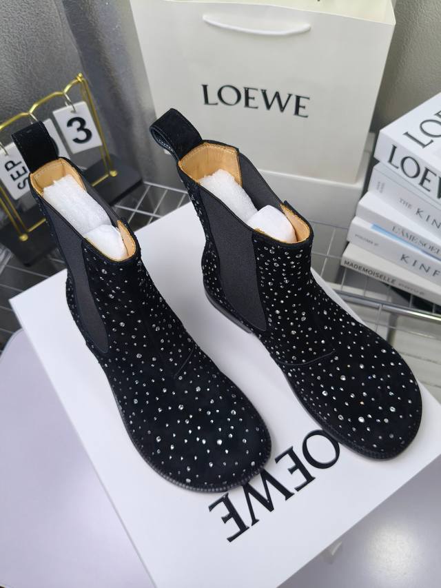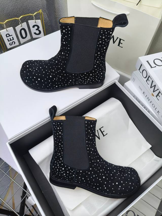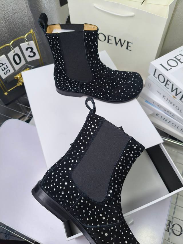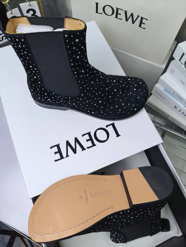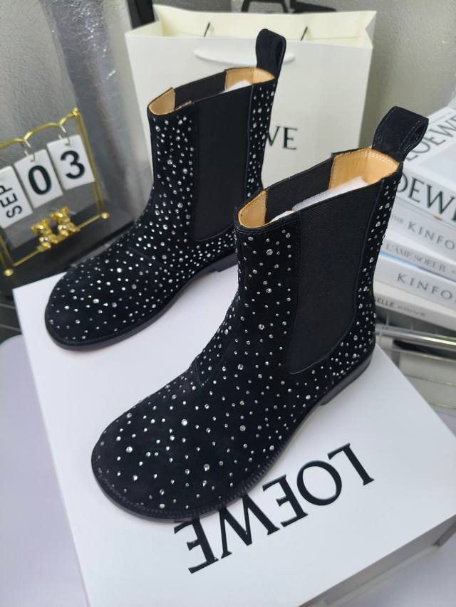 Loewe Autumn/Winter New Ankle Boots Hot new style, featuring the original last shape, fashionable and unique, comfortable, and with amazing colors. Material: Imported sheepskin with imported rhinestones. Lining: Water-dyed cowhide. Insole: Water-dyed cowhide . Outsole: Original genuine leather. Packaging: Original full packaging. Sizes: 35-40, 40.41 (Made to order).
