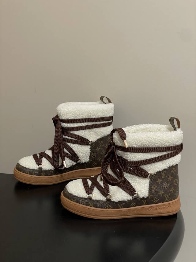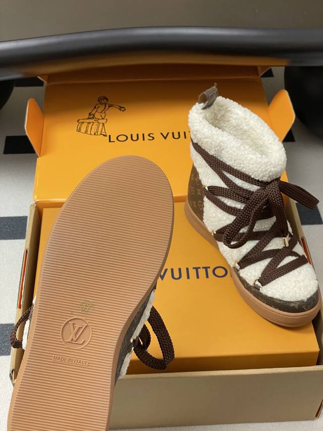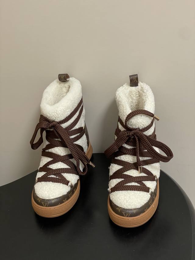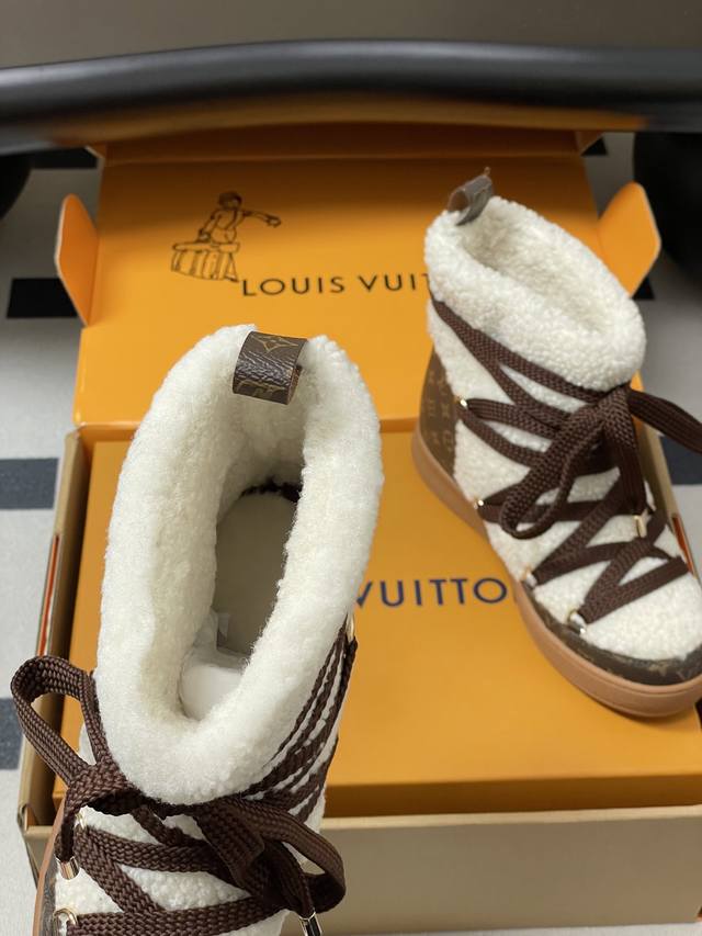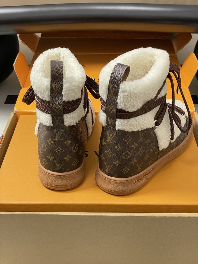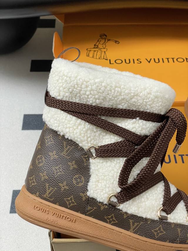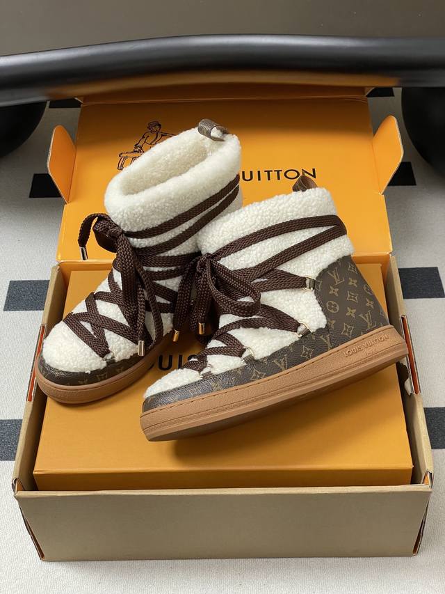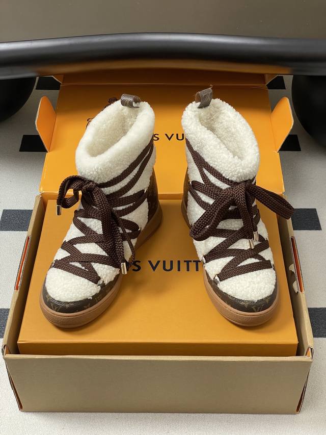 25Ss Autumn/Winter New Louis Vuiteeon Lv Cloud Lace-up High-Top Wool Sneakers Classic Monogram Leather Lace-up Thick-Soled Snow Boots Wool Ankle Boots Short Boots DDD This Lv Cloud lace-up high-top sneaker features a warm and eye-catching design constructed from comfortable sheepskin and classic Monogram canvas, adding a trendy member to the Lvski collection, seamlessly transitioning between skiing and city street style. Cross laces adorn glossy eyelets, and the rubber outsole displays the Louis Vuitton logo. Seamlessly transitioning between winter holidays and urban life. DDD Upper: Custom Monogram Leather Sheepskin DDD Insole: Wool DDD Outsole: Original Mold TPU Rubber Outsole DDD Sizes: 35-39 40.41 Custom-made, no returns or exchanges DDD