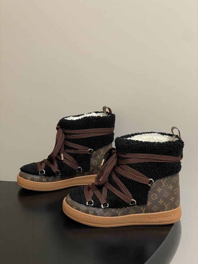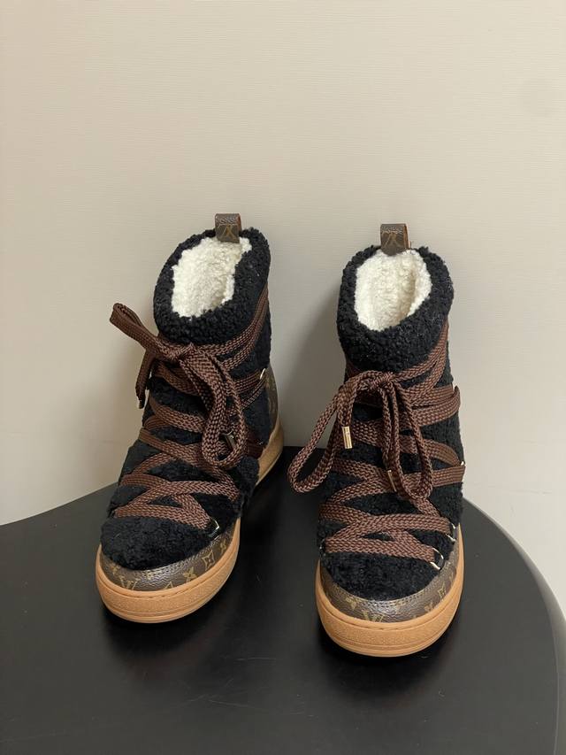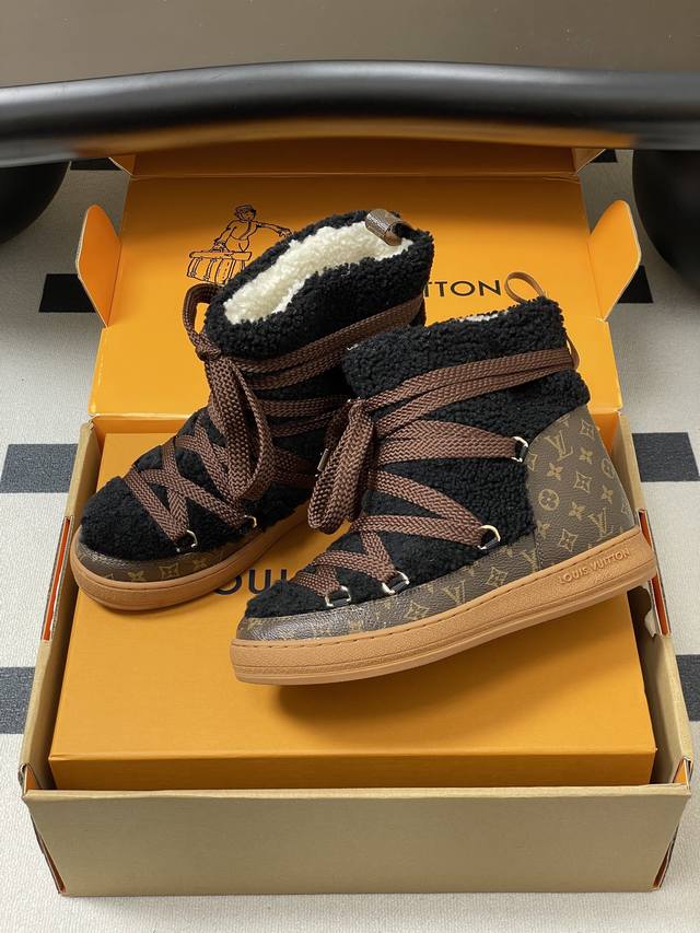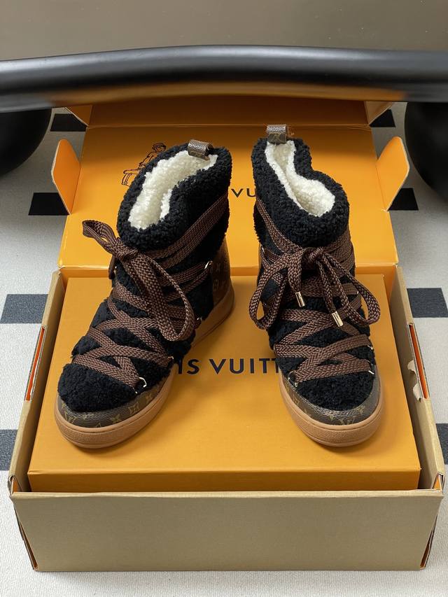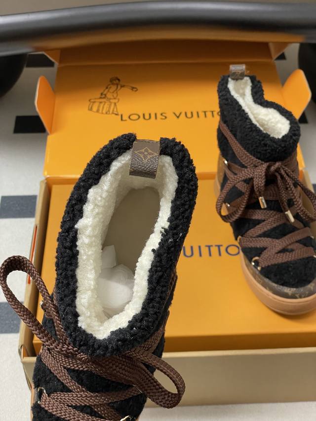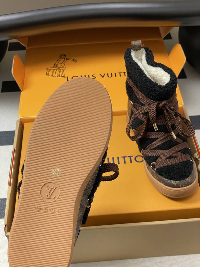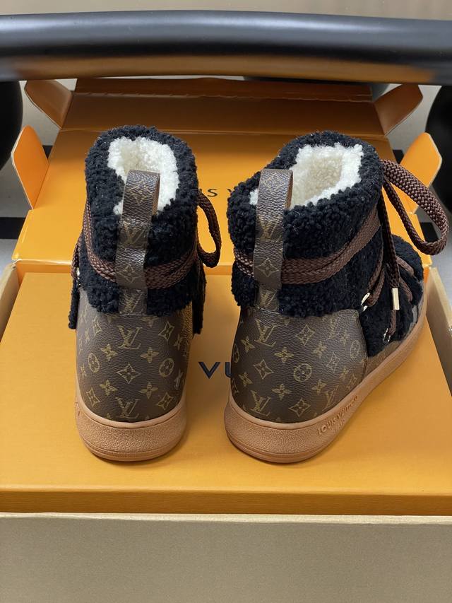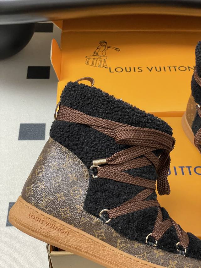25Ss Autumn/Winter New Louis Vuiteeon Lv Cloud Lace-up High-Top Wool Sneakers Classic Monogram Leather Lace-up Thick-Soled Snow Boots Wool Ankle Boots Short Boots DDD This Lv Cloud lace-up high-top sneaker features a warm and eye-catching design constructed from comfortable sheepskin and classic Monogram canvas, adding a trendy member to the Lvski collection, seamlessly transitioning between skiing and city street style. Cross laces adorn glossy eyelets, and the rubber outsole displays the Louis Vuitton logo. Seamlessly transitioning between winter holidays and urban life. DDD Upper: Custom Monogram Leather and Lambswool DDD Insole: Wool DDD Outsole: Original Mold TPU Rubber Outsole DDD Sizes: 35-39 40.41 Custom-made, no returns or exchanges DDD