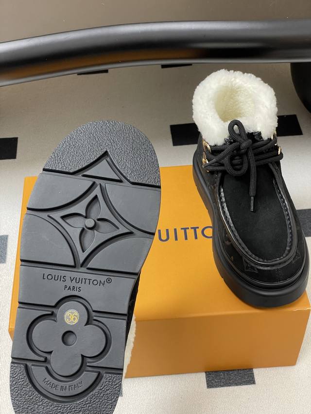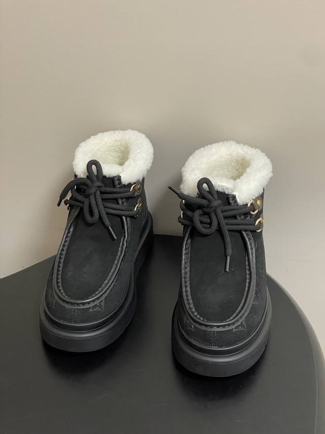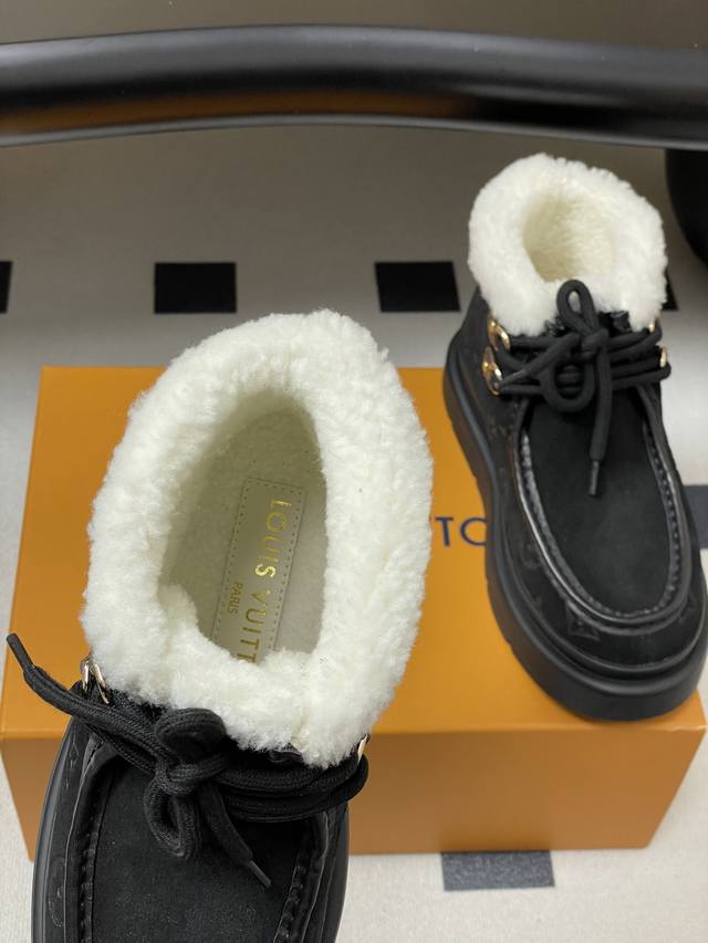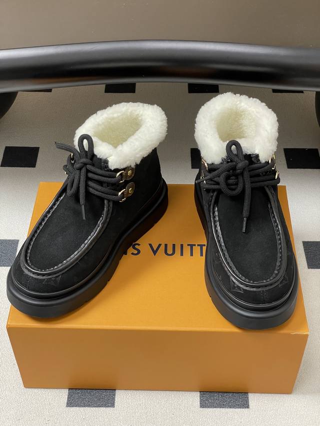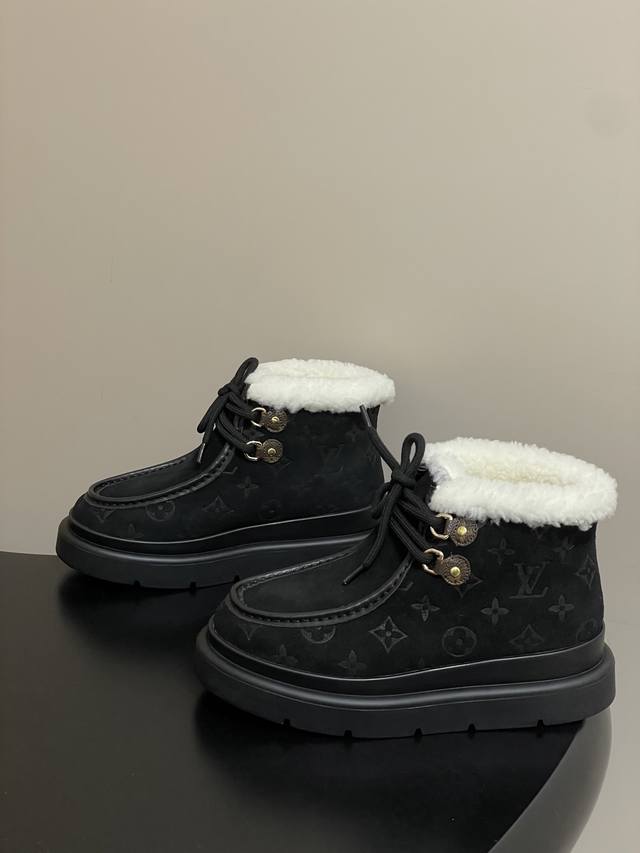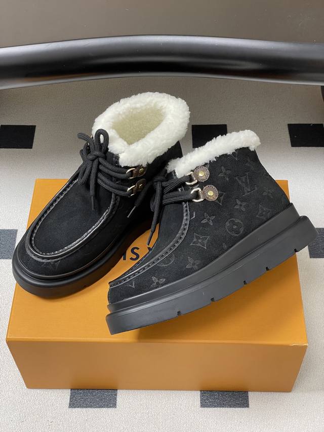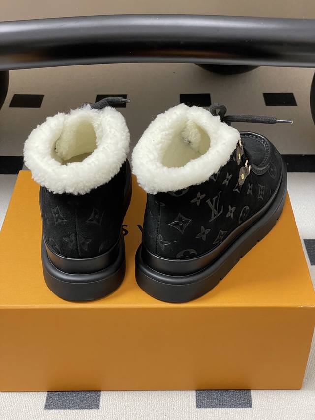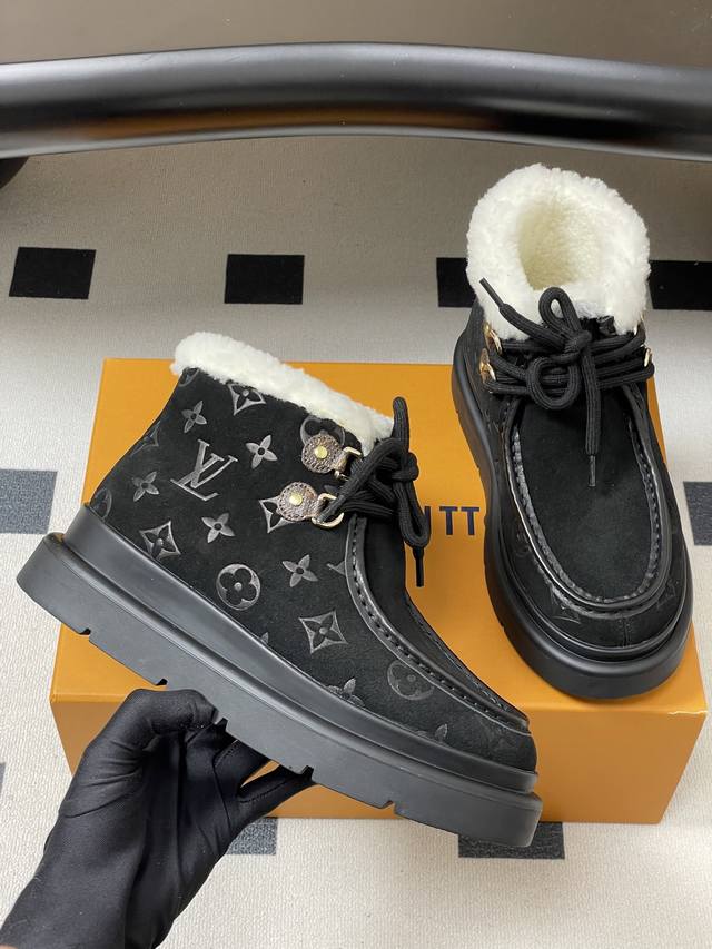 25Ss Autumn/Winter New Louis Vuiteeon Lv Letter Embossed Lace-up Platform Snow Boots Wool Ankle Boots DDD This Cortina ankle boot is from the Lvski collection, combining a suede cowhide upper with a comfortable sheepskin lining. The Monogram pattern upper and leather laces adorned with the Lv Circle logo create sophisticated details. It features a non-slip rubber outsole, allowing for a seamless transition between winter vacations and city life. DDD Upper: High-gloss cowhide DDD Insole: Wool DDD Sole: Original molded TPU rubber outsole DDD Heel height: 5cm DDD Sizes: 35-39 40.41 Custom-made, no returns or exchanges DDD