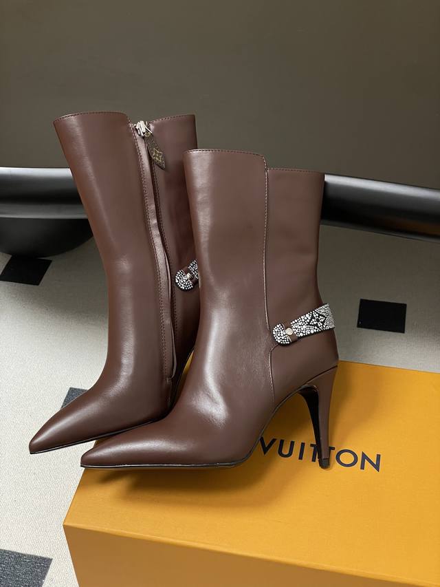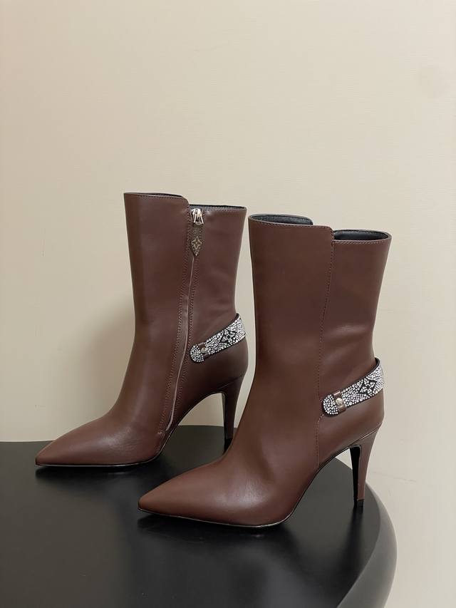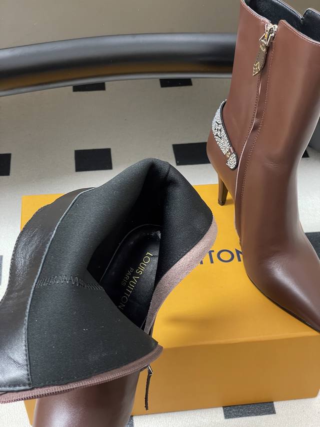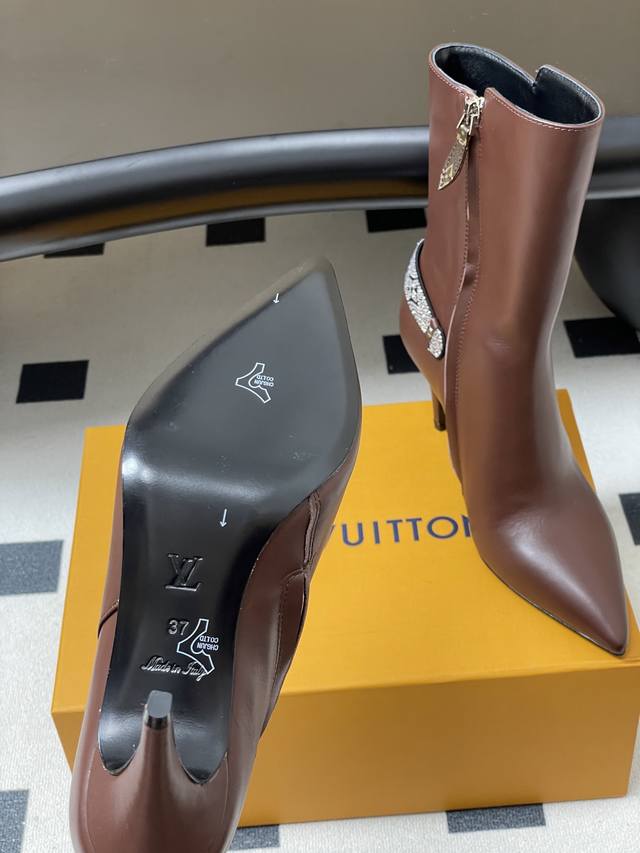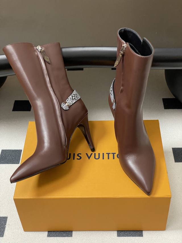 25Ss Early Autumn New Louis Vuitton Lv Legacy Ankle Boots Pointed Toe High Heeled Short Boots with Side Zipper and Monogram Belt DDD This Legacy ankle boot is crafted from smooth cowhide leather, paired with a Monogram canvas strap reminiscent of the handles of the brand's traditional trunks, paying homage to Louis Vuitton's travel heritage. Engraved metal studs accentuate the pointed toe and high heel silhouette. DDD Upper: Calfskin/Suede DDD Insole: Sheepskin DDD Sole: Italian Leather Outsole DDD Heel Height: 9.5cm DDD Sizes: 35-39 40, 41, 42 Made to order, no returns or exchanges DDD