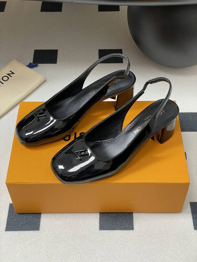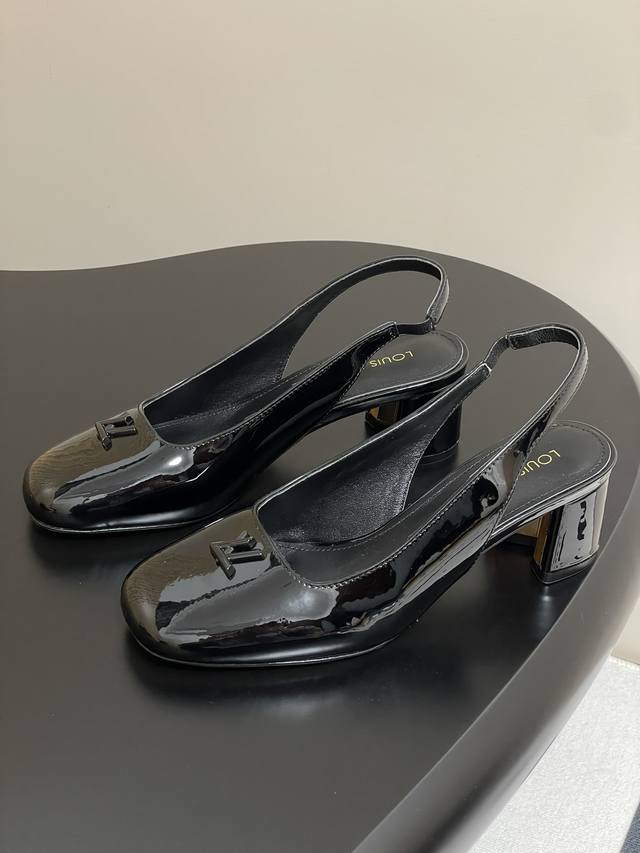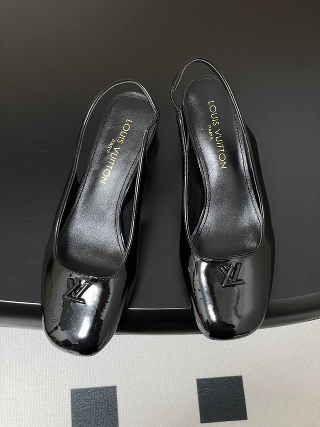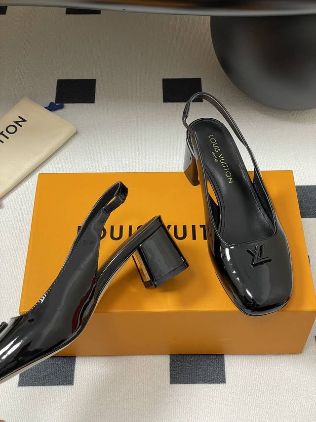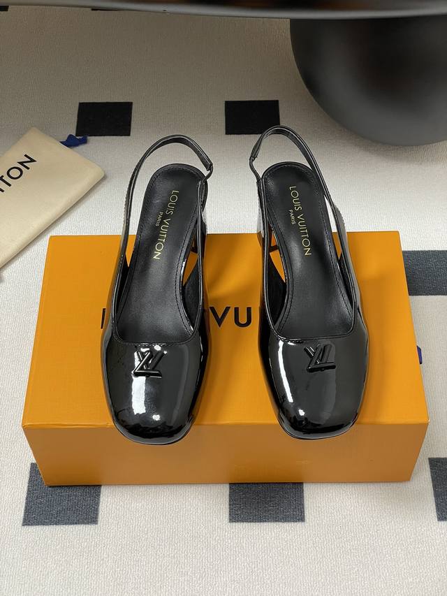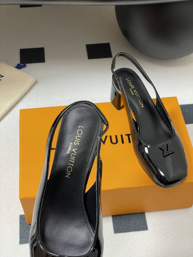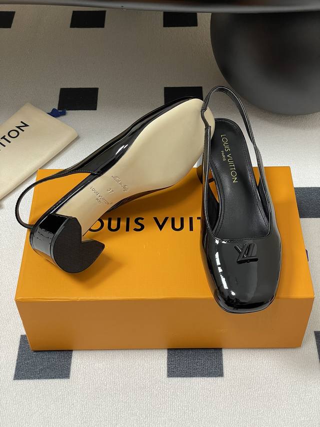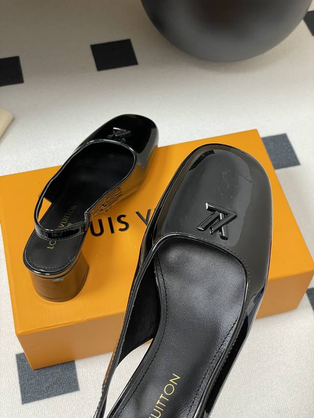 25Ss Early Spring New Louis Vuitton Lv Swing High Heels - Hottest Newest Metal Heel Mary Jane Openback Chunky Heel Sandals with Letter Logo. Made with soft leather for easy on and off, these shoes feature clean lines that exude elegance. The V-shaped openwork square heel and its lustrous lining create a distinctive look, while the Lvtwist decoration on the toe adds a touch of sophistication. The cute round toe with the Lv logo is exquisite and beautiful, and the chunky heel provides exceptional comfort. A classic and versatile piece! Original molded V-shaped metal heel! Upper: Calfskin patent leather; Insole: Sheepskin; Sole: Italian Grade A genuine leather; Heel height: 5.5cm; Sizes: 35-39; Sizes 40 and 41: Custom-made, no returns or exchanges.