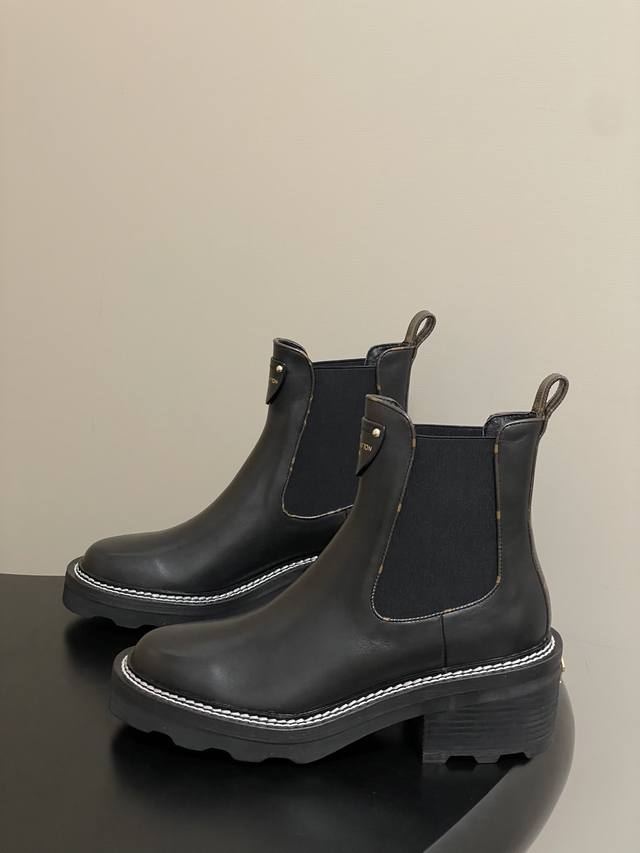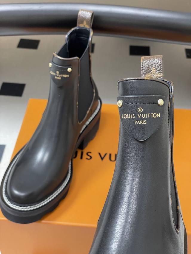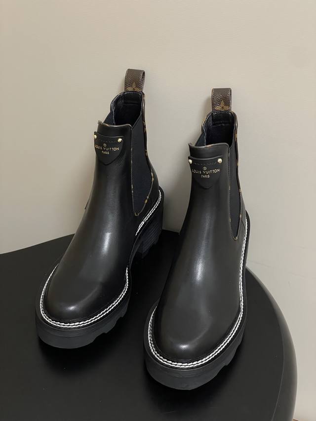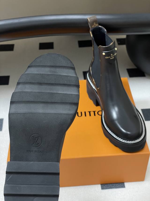 A classic fall/winter Louis Vuitton LV Beaubourg ankle boots with elasticated triangle logo and thick sole. These LV Beaubourg ankle boots feature a Chelsea-style cowhide upper, a lightweight thick sole, Monogram canvas trim, and contrasting stitching that outlines the elastic side panels and piping, creating a subtle balance of strength and softness. Upper: Cowhide leather with a floral print. Lining: Cowhide leather. Sole: Genuine leather welt with molded rubber outsole. Sizes: 35-39, 40, 41, 42. Made to order, no returns or exchanges.