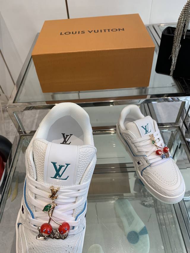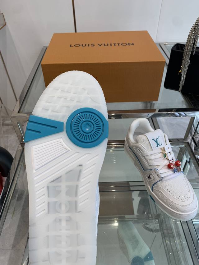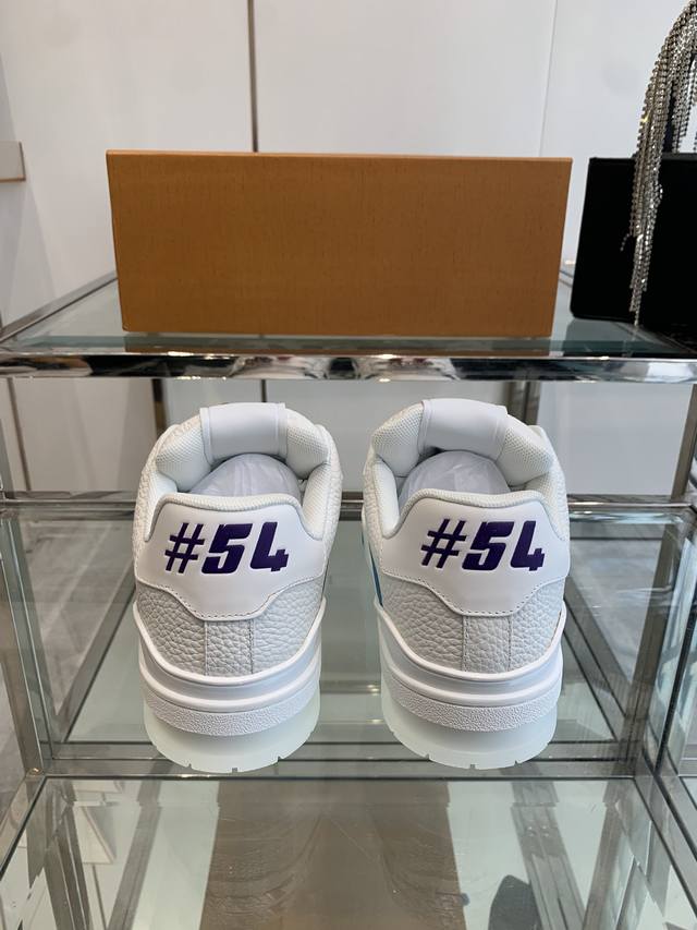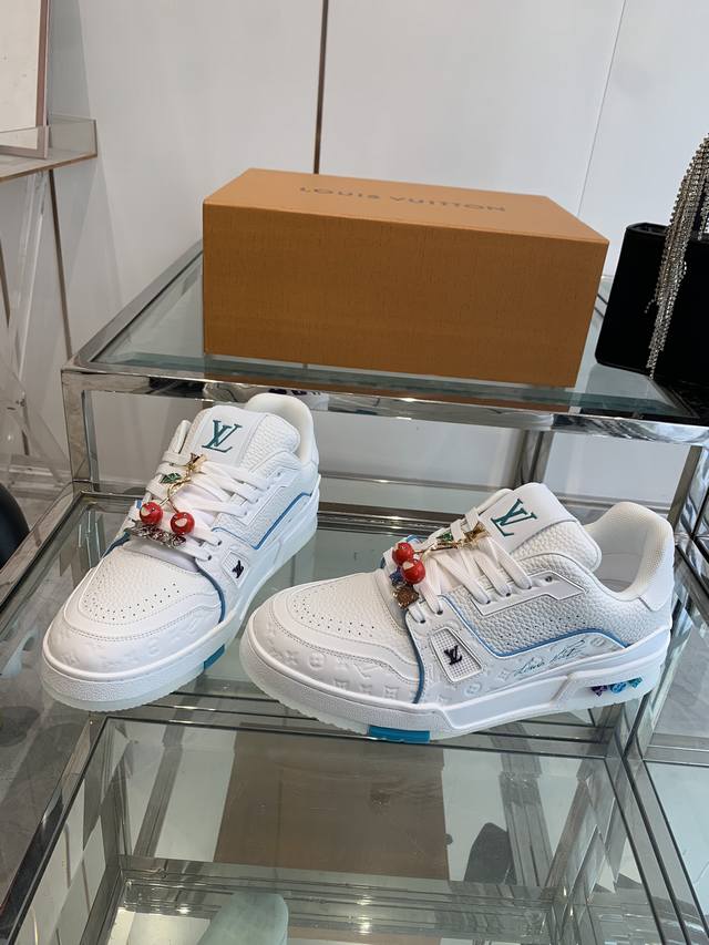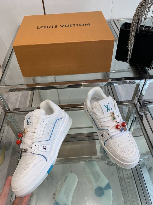 Accessories 120 New Version Louis Vuitton Trainer Sneakers, Skateboard Shoes, Couple Style. Original purchase and production. This Louis Vuitton Trainer sneaker features an intricate upper crafted from cowhide leather, requiring hours of meticulous stitching to complete. The classic design is inspired by Virgil Abloh, showcasing the style of retro basketball shoes. Material: Original custom top-grain cowhide leather. Lining: Original custom breathable mesh lining. Outsole: Original molded two-tone TPU outsole. Sizes: 35-44.
