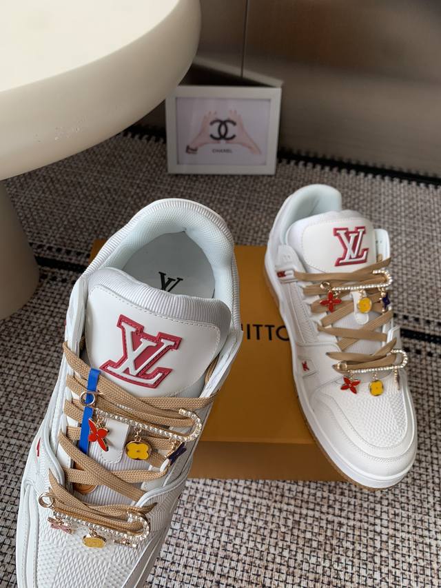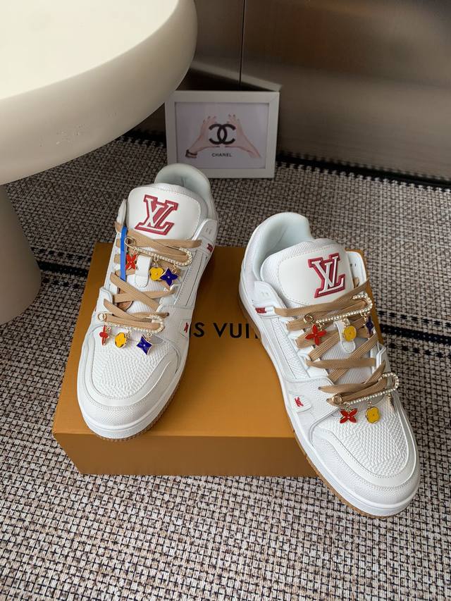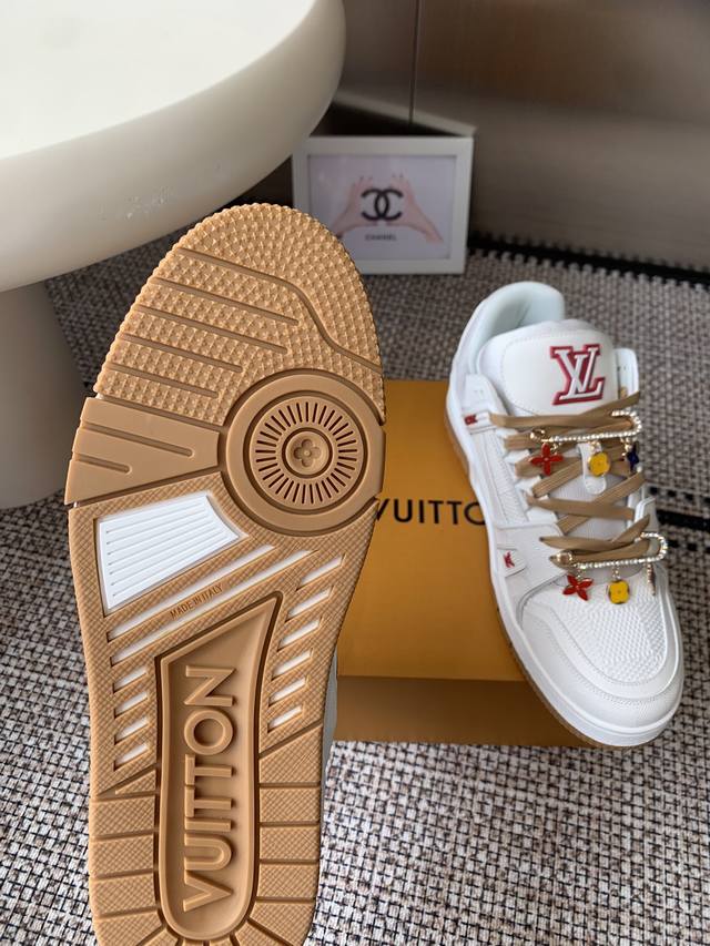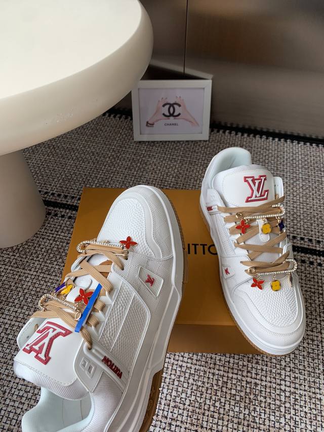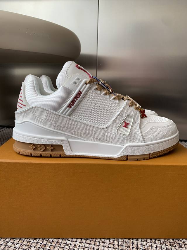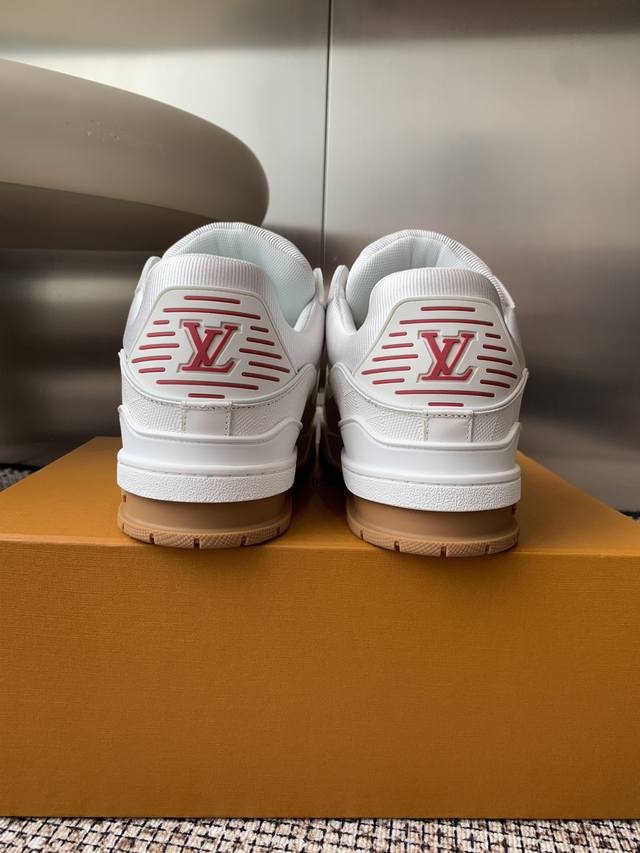 . Originally purchased, developed, and crafted. This Lv Trainer sneaker features an intricate upper crafted from cowhide leather, requiring hours of meticulous sewing. The classic silhouette, designed by Virgil Abloh, reflects retro basketball inspiration.