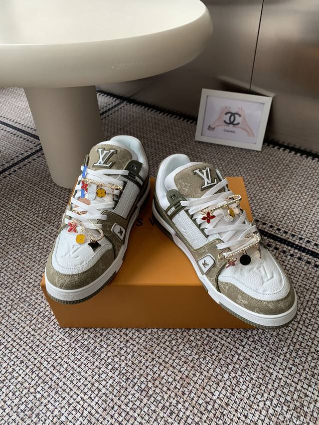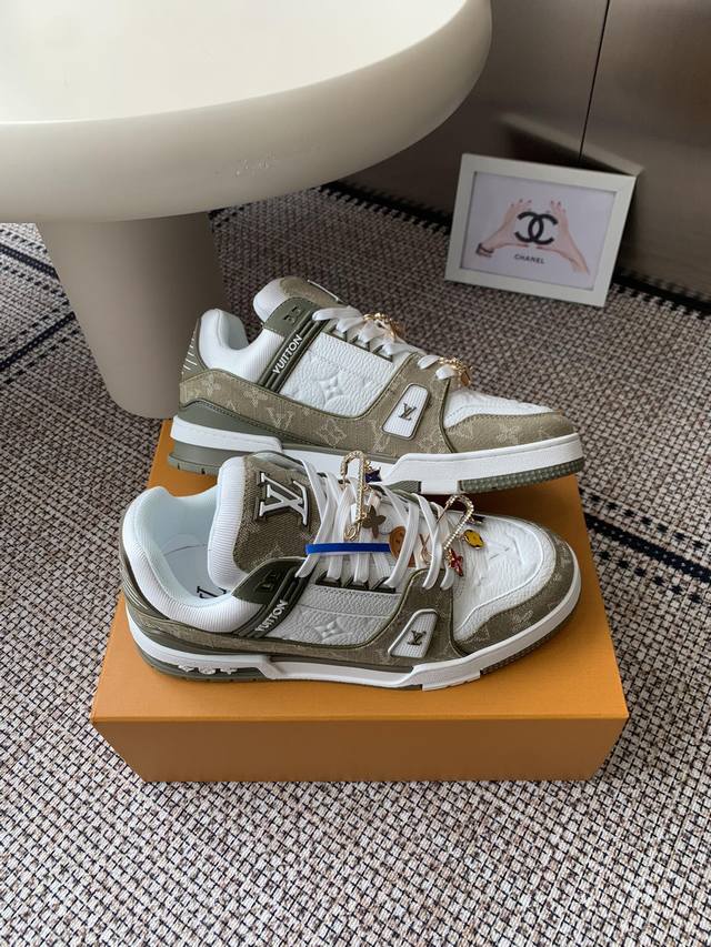 Originally purchased, developed, and crafted, this Lv Trainer sneaker features an intricate upper crafted from cowhide leather, requiring hours of meticulous sewing. The classic silhouette, designed by Virgil Abloh, reflects retro basketball shoe inspiration.