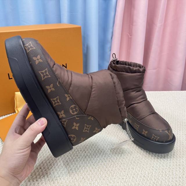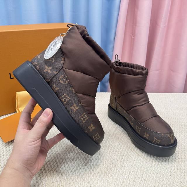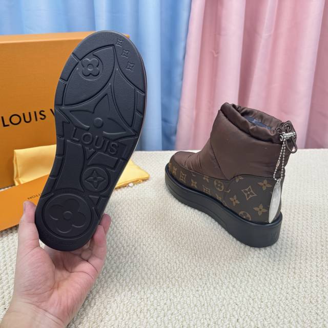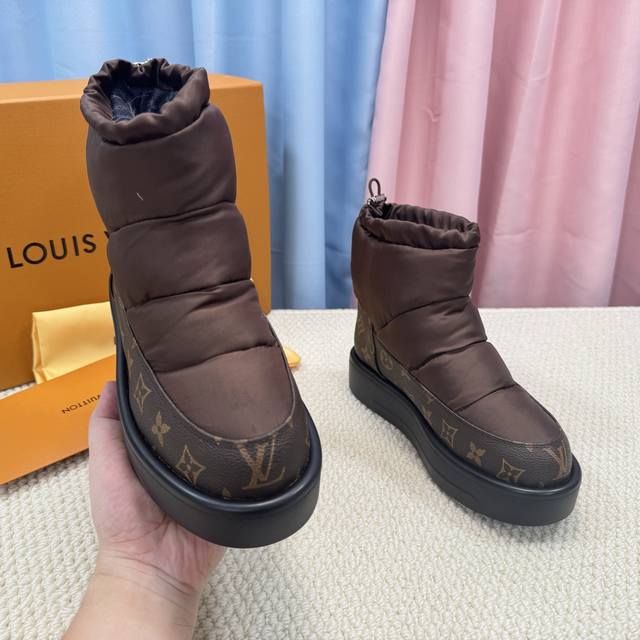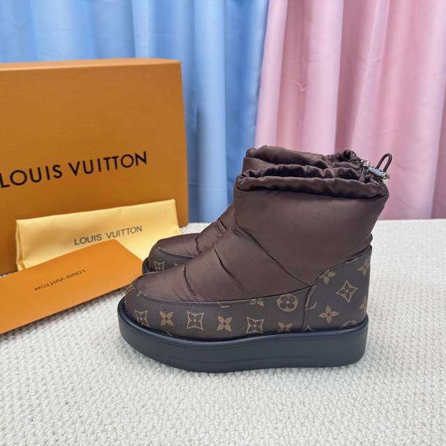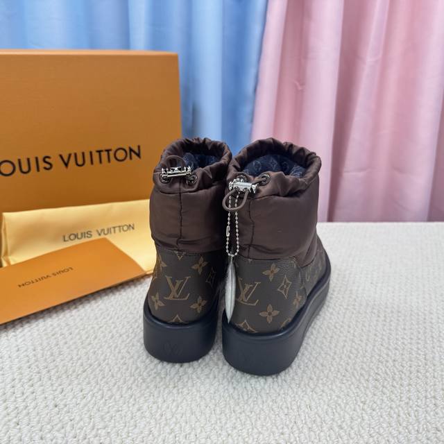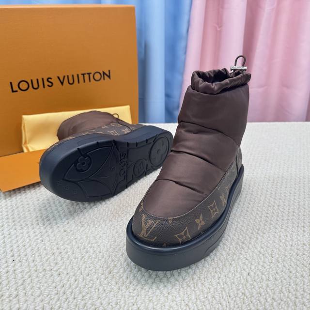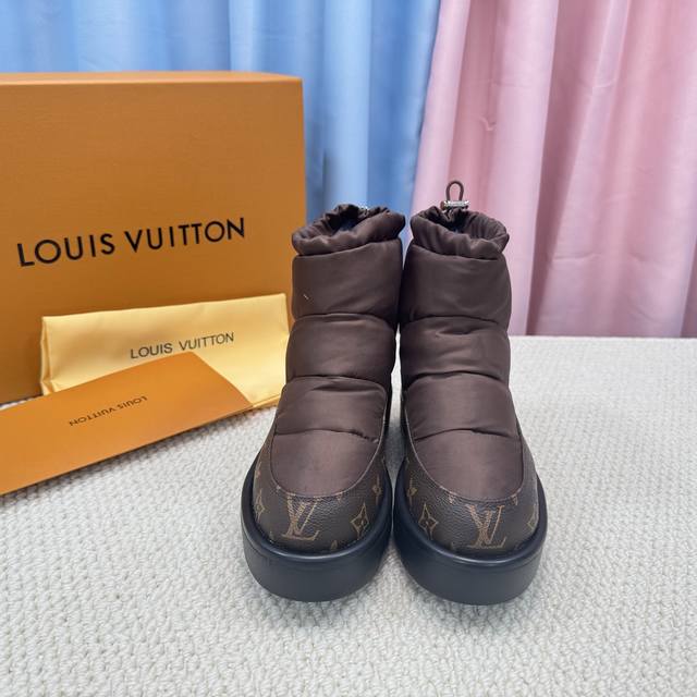 Autumn/Winter New Down Boots Louis Vuitton Import Quality LV Official Website Latest Runway Style Hot Launch! The super luxurious design subverts the traditional snow boot design, giving a completely new interpretation of the down concept. Personalized trendsetting, leading fashion, exquisite workmanship. Material: Imported waterproof down fabric, keeping your feet warm in the cold winter. Lining: Imported waterproof down fabric. Outsole: Original foam outsole, non-slip, wear-resistant, and comfortable. Packaging: Original full packaging. Sizes: 35-40 (standard sizes), 40, 41, 42 are custom-made and non-refundable.