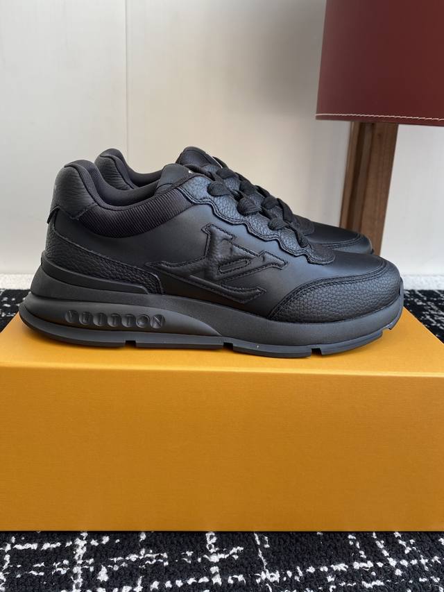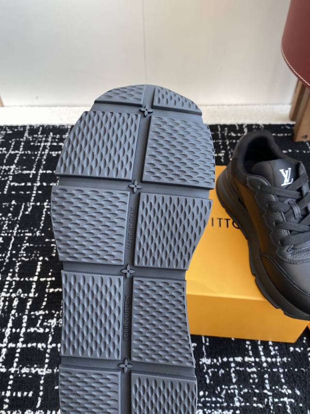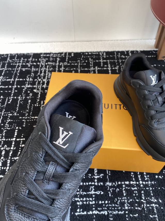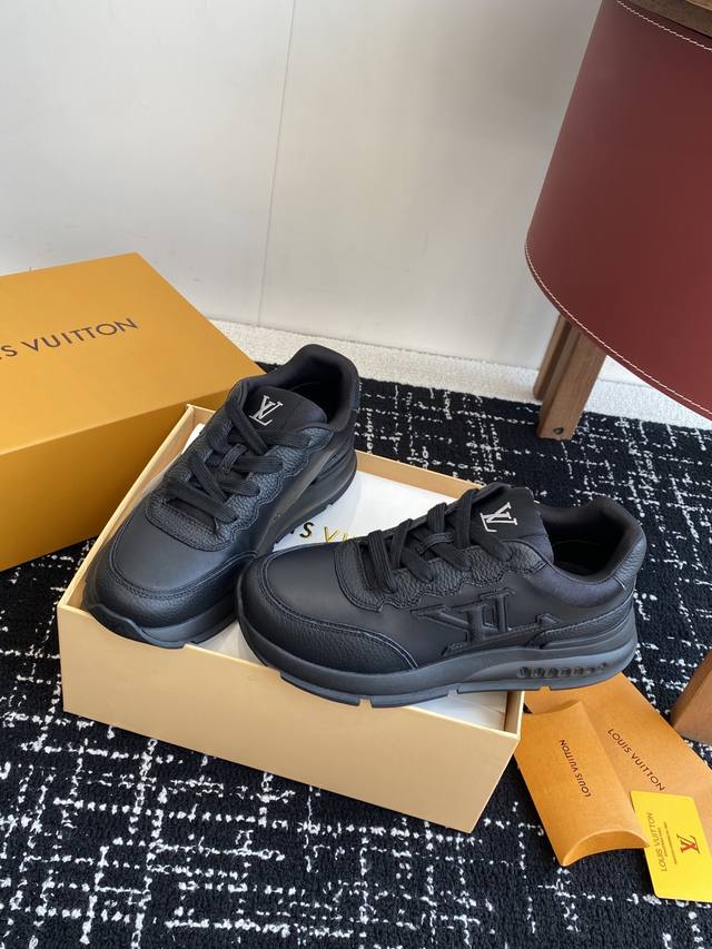 features striking Lv lettering on the side of the shoe, and a lightweight rubber outsole embellished with the Vuitton logo.