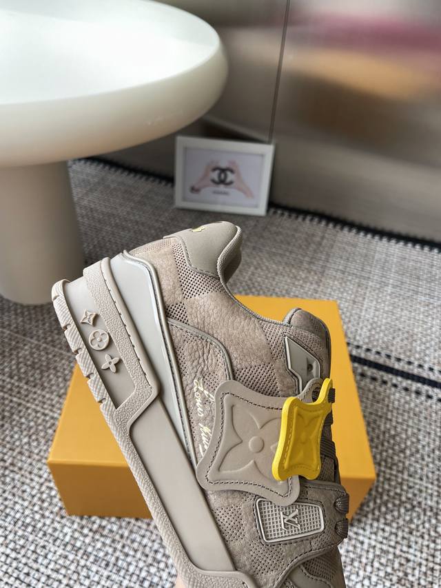 Originally purchased, developed, and crafted, this Lv Trainer sneaker features an intricate upper crafted from cowhide leather, requiring hours of meticulous sewing. The classic silhouette, designed by Virgil Abloh, reflects retro basketball shoe inspiration.