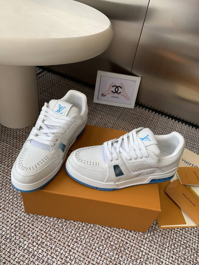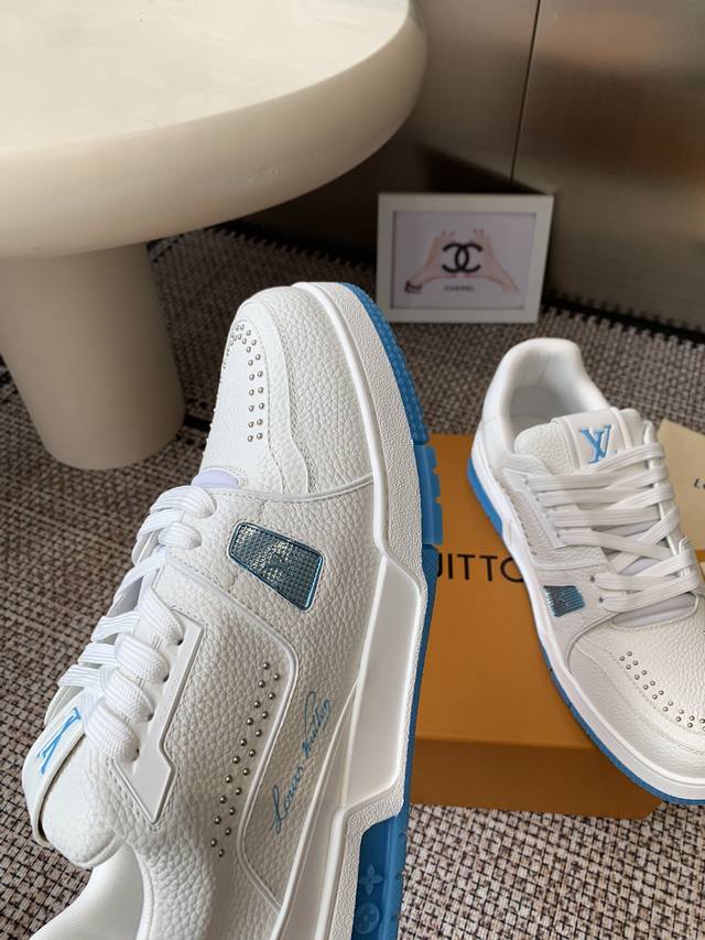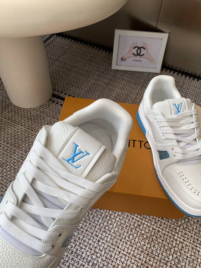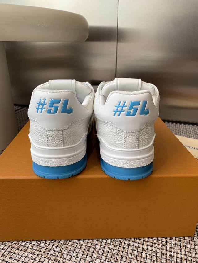 Originally purchased, developed, and crafted, this Lv Trainer sneaker features an intricate upper crafted from cowhide leather, requiring hours of meticulous sewing. The classic silhouette, designed by Virgil Abloh, reflects retro basketball inspiration.