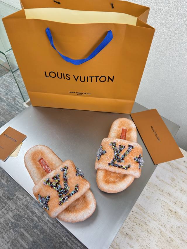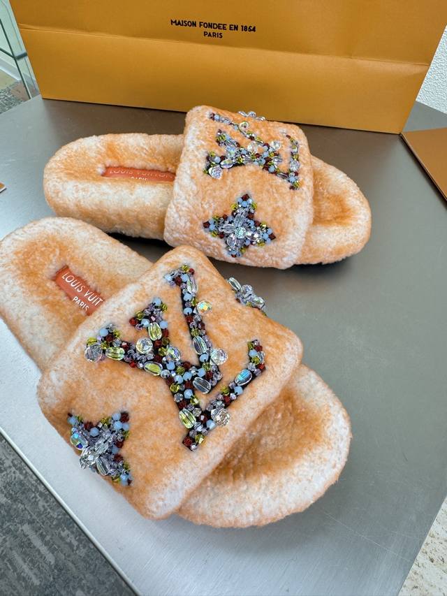 Colored Diamond Logo Hand-stitched Two-tone Lambswool Slippers Imported Lambswoo