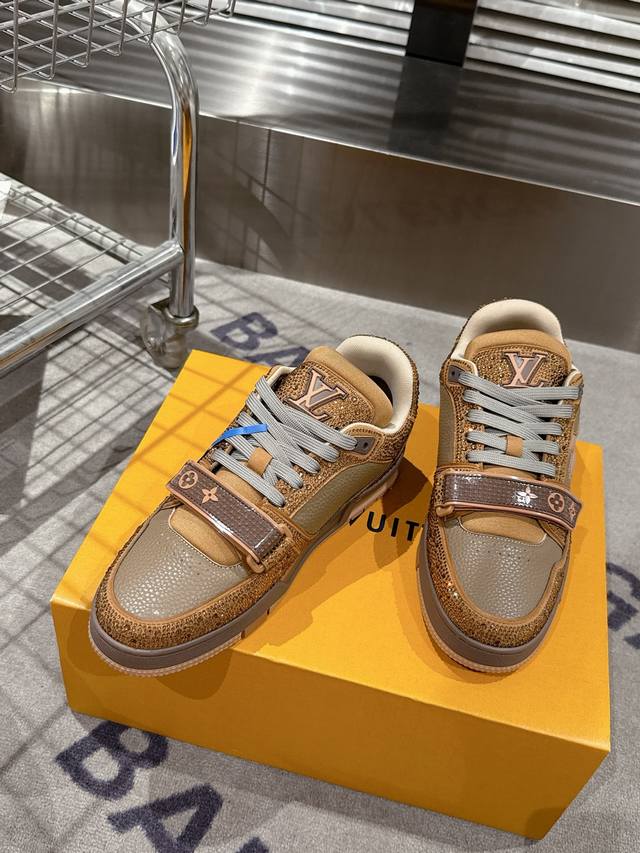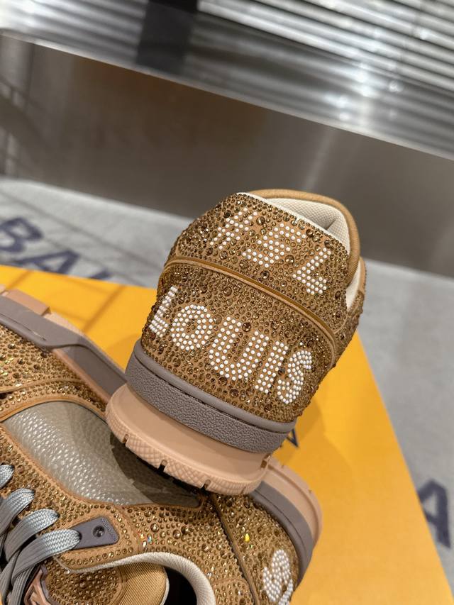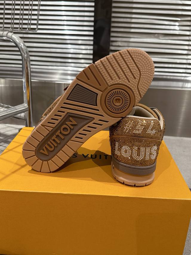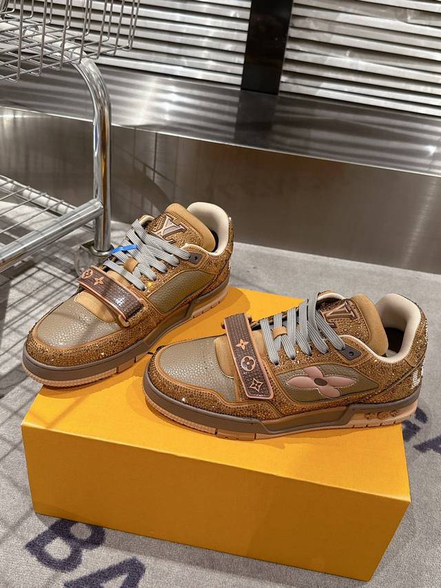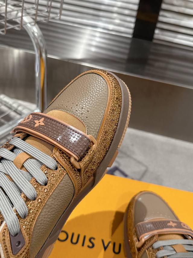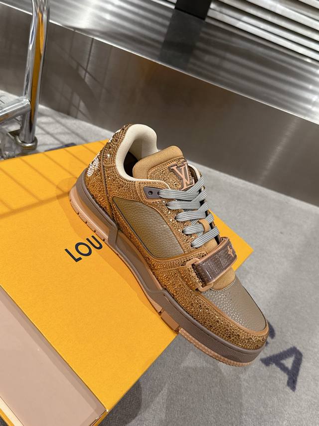Couple's Louis Vuitton Lv Trainer Limited Edition Bulingbuling Full Rhinestone Series Casual Sneakers - Top-Quality Replica! A revolutionary new creation from Louis Vuitton's Artistic Director Virgil Abloh, blending street style with footwear fashion for a more youthful and diverse look. Personalize your style with different socks! Original custom cowhide leather, specially printed denim upholstery, luxurious crystal rhinestones (won't fall off), Goodyear welt stitching, original TPU comfortable outsole, complete packaging with original gift box. Sizes 35-45 [Women's 40.41, Men's 45 custom-made].