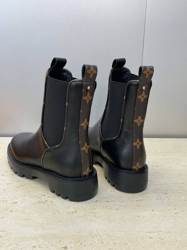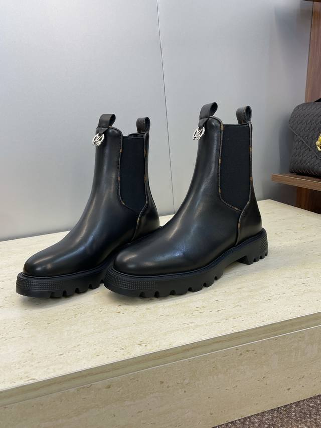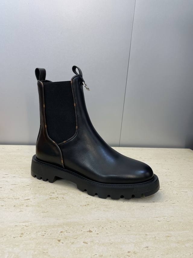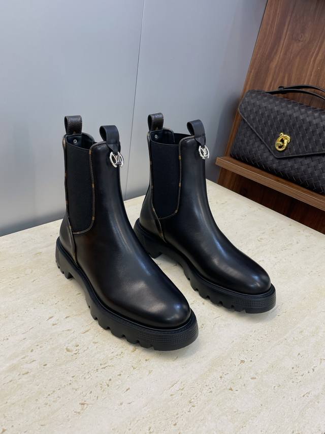 Factory direct price. Dongguan-made Louis Vuitton 2025 Autumn/Winter new Chelsea style elastic motorcycle ankle boots with Lv logo, hardware buckle, thick sole, low heel, color-blocked slip-on riding boots. Material: Imported calfskin upper + water-dyed cowhide lining + original mold Ip outsole. Size: Women's sizes 35-41, 40-41. Custom orders are non-refundable.