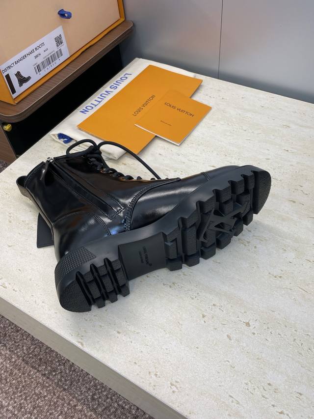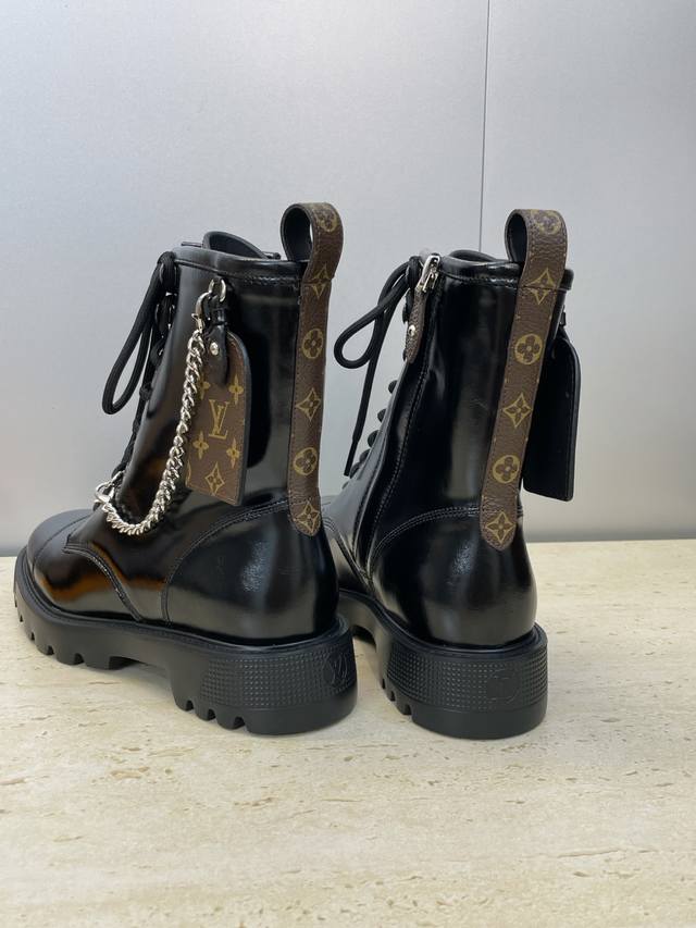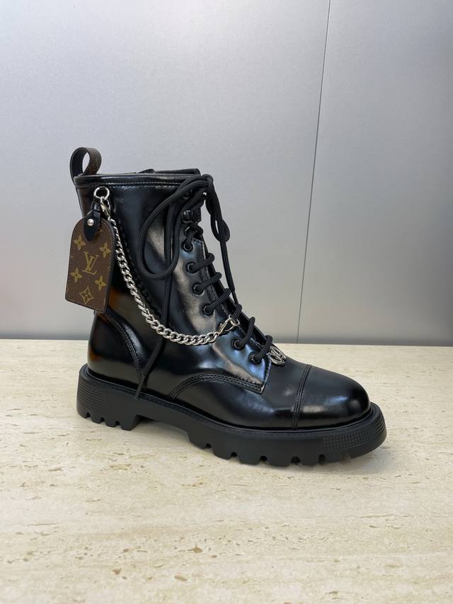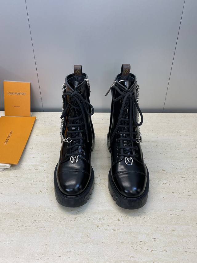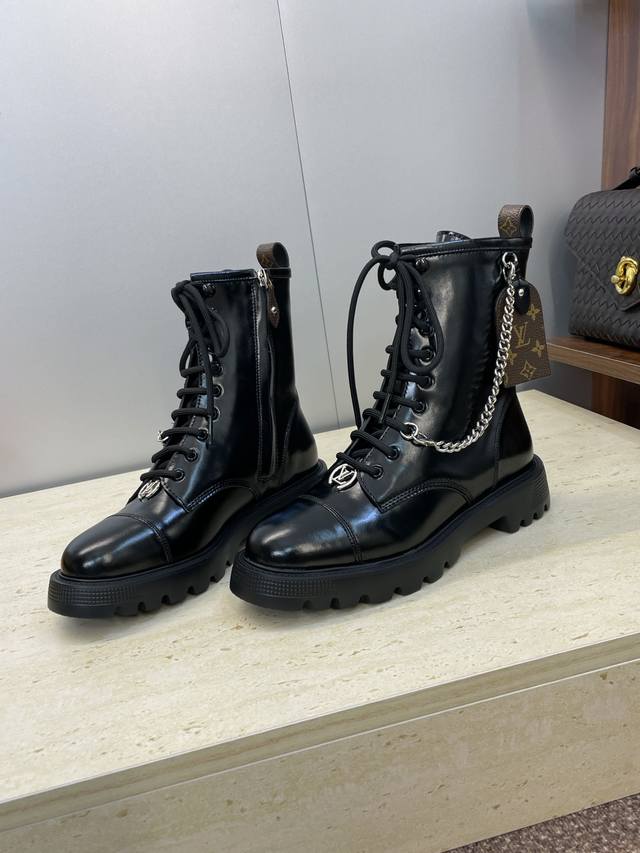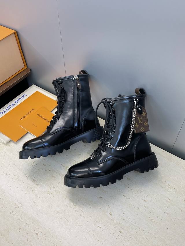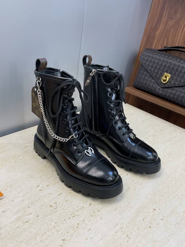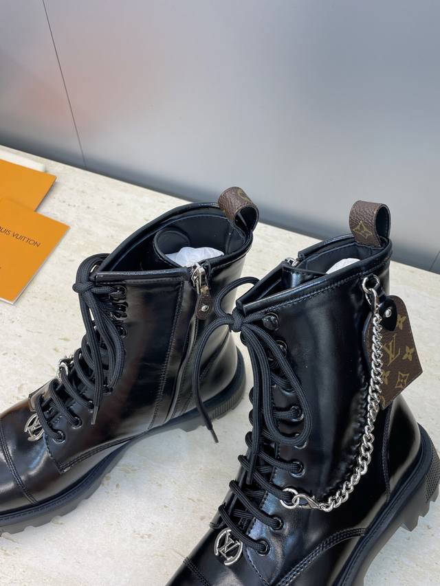 Factory direct price. Dongguan-made Louis Vuitton 2025 Autumn/Winter new punk style lace-up motorcycle ankle boots with Lv logo, hardware chain, badge buckle, thick sole, low heel, color-blocked side zipper riding boots. Material: Imported split-edge cowhide upper + water-dyed cowhide lining + original mold Ip outsole. Size: Women's sizes 35-41, 40-41. Custom orders are non-refundable.