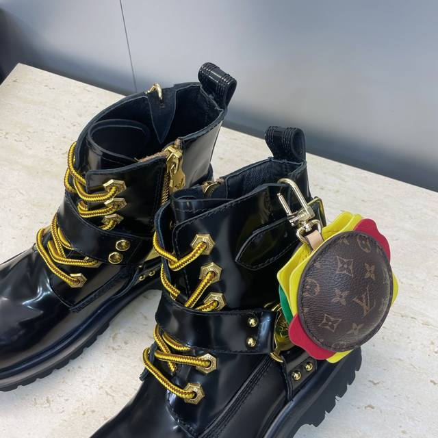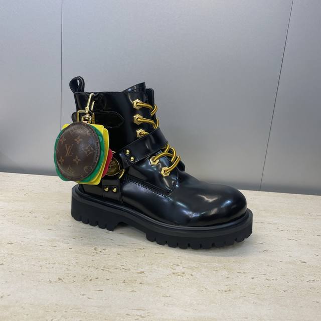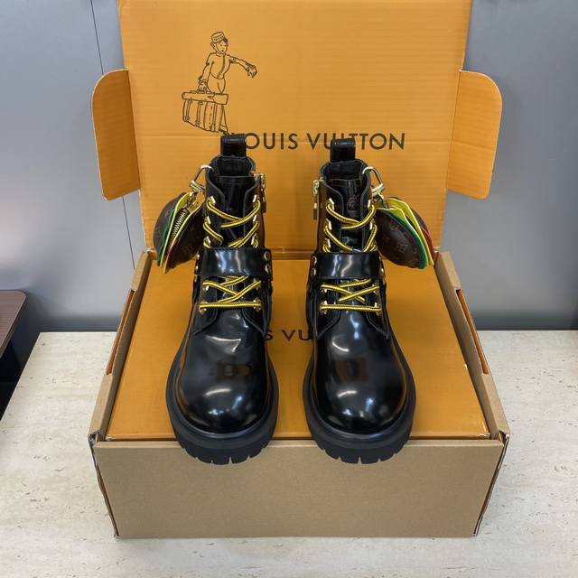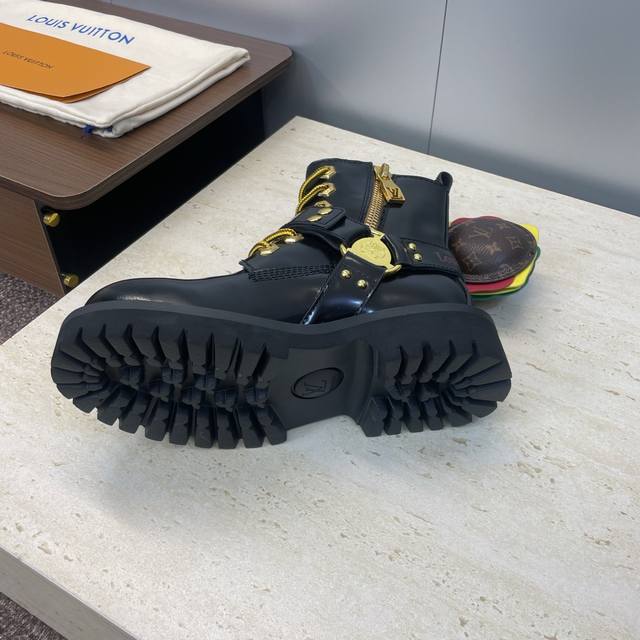 Factory direct price, no bag included. Louis Vuitton x Timberland collaboration 2025 Fall/Winter new style couple's nomadic style lace-up motorcycle ankle boots with Lv logo, hardware buckle, hamburger decoration, thick sole, color blocking, slip-on riding boots. Material: Imported silk cowhide upper, split-edge cowhide + water-dyed sheepskin lining + original molded outsole. Size: Women's sizes 35-41, 40, 41 (custom orders, no returns or exchanges); Men's sizes 39-44, 45 (custom orders, no returns or exchanges).