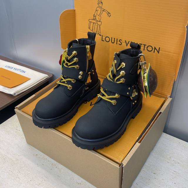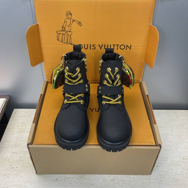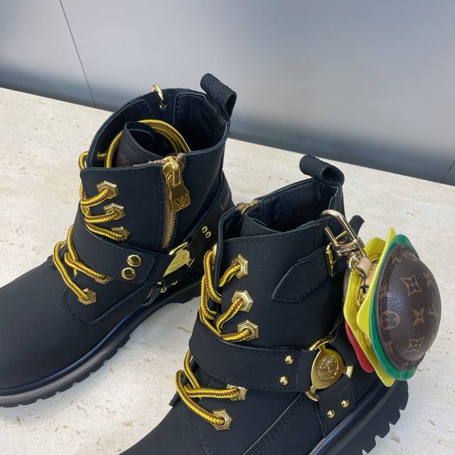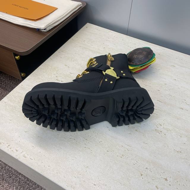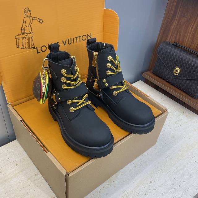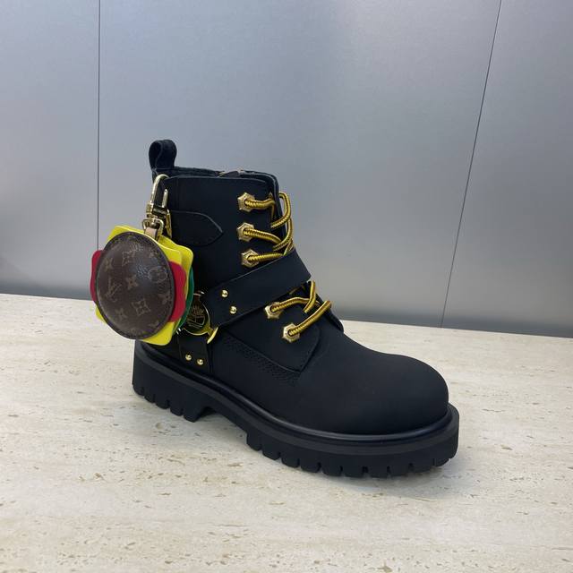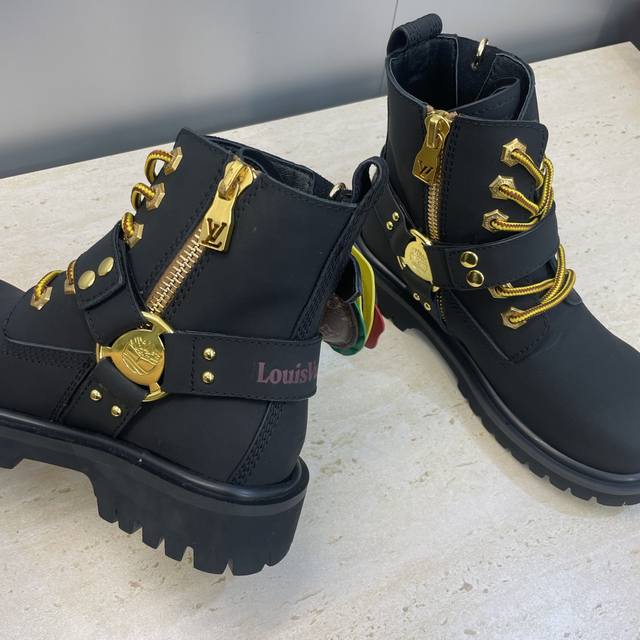 Factory direct price, no bag included. Louis Vuitton x Timberland collaboration 2025 Fall/Winter new style couple's nomadic style lace-up motorcycle ankle boots with Lv logo, metal buckle, hamburger decoration, thick sole, color blocking, slip-on riding boots. Material: Imported silk cowhide upper, split beaded cowhide + water-dyed sheepskin lining + original molded outsole. Size: Women's sizes 35-41, 40, 41 (custom orders, no returns or exchanges); Men's sizes 39-44, 45 (custom orders, no returns or exchanges).