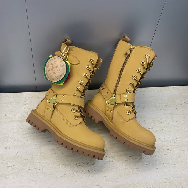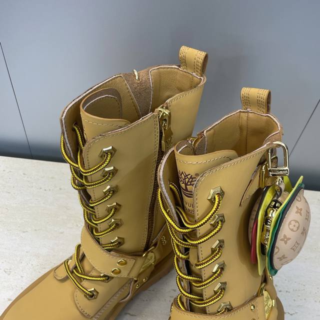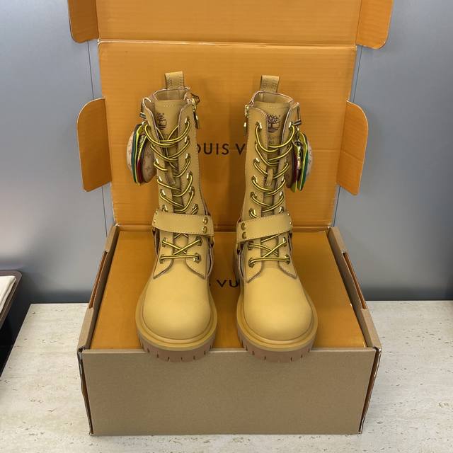 Factory direct price, no bag included. Louis Vuitton x Timberland collaboration 2025 Fall/Winter new style couple's nomadic style lace-up motorcycle ankle boots with Lv logo, metal buckle, hamburger decoration, thick sole, color blocking, slip-on riding boots. Material: Imported silk cowhide upper, split beaded cowhide + water-dyed sheepskin lining + original molded outsole. Size: Women's sizes 35-41, 40, 41 (custom orders, no returns/exchanges); Men's sizes 39-44, 45 (custom orders, no returns/exchanges).