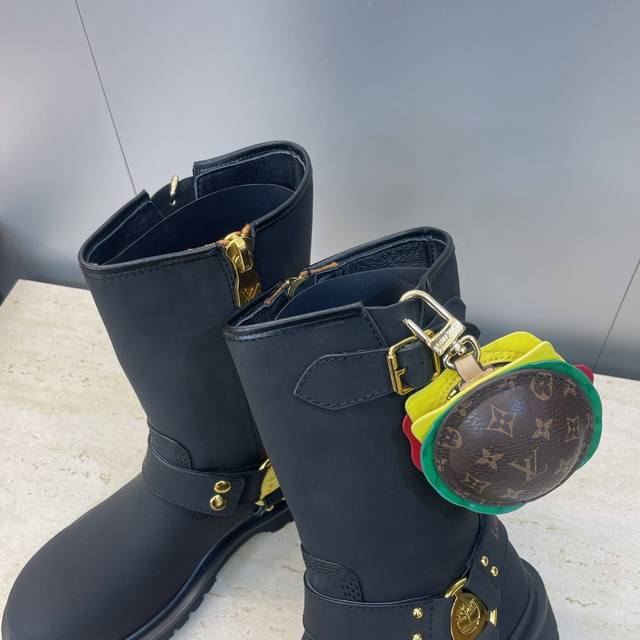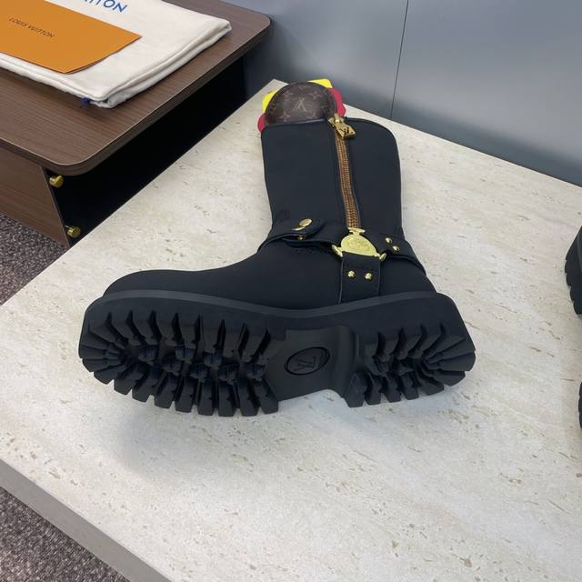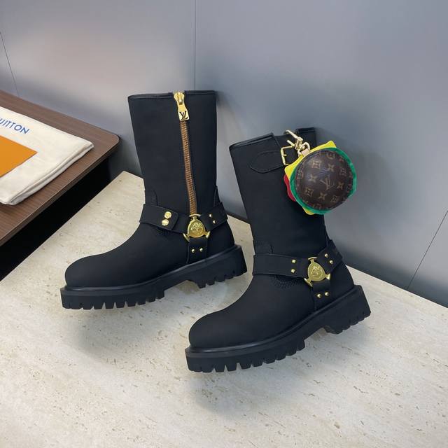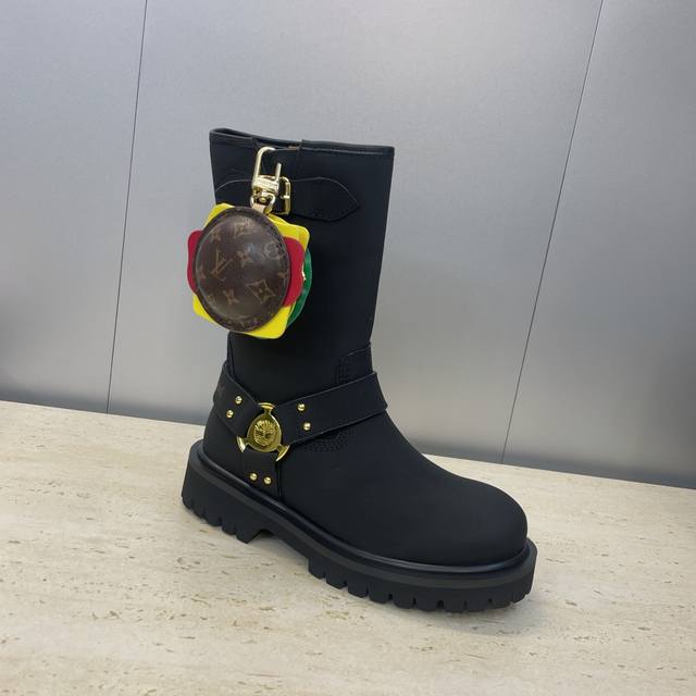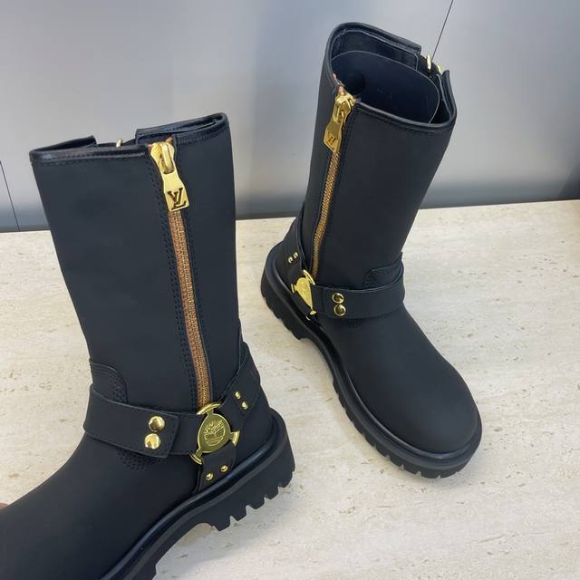 Factory direct price, no bag included. Louis Vuitton x Timberland collaboration 2025 Fall/Winter new style couple's nomadic style lace-up motorcycle ankle boots with Lv logo, metal buckle, hamburger decoration, thick sole, color blocking, slip-on riding boots. Material: Imported silk cowhide upper, split beaded cowhide + water-dyed sheepskin lining + original molded outsole. Size: Women's sizes 35-41, 40, 41 (custom orders, no returns/exchanges); Men's sizes 39-44, 45 (custom orders, no returns/exchanges).
