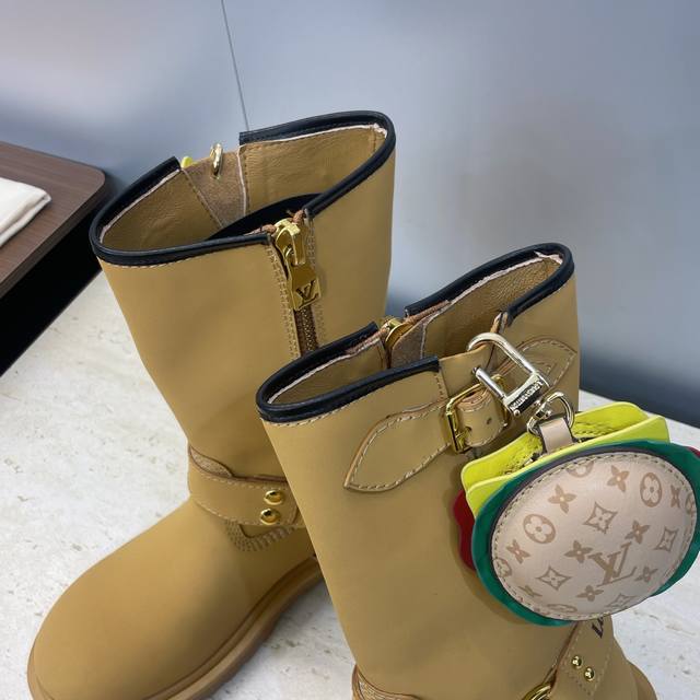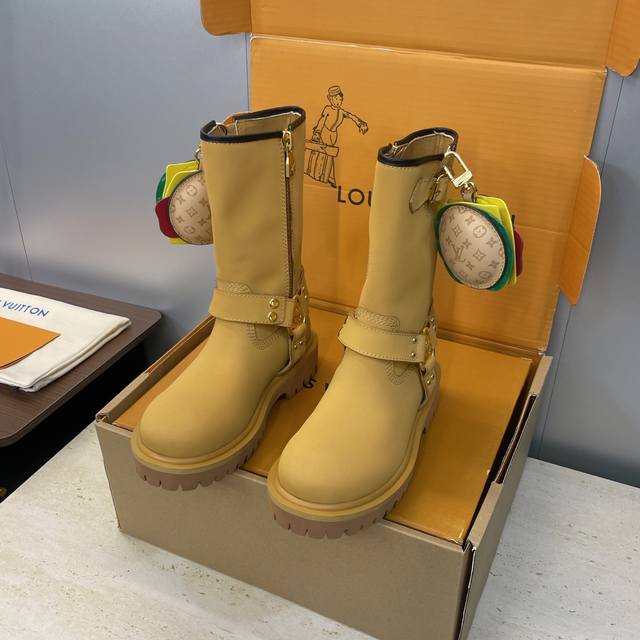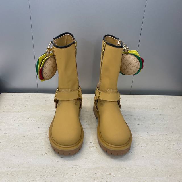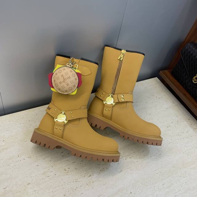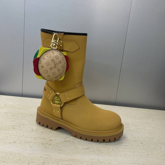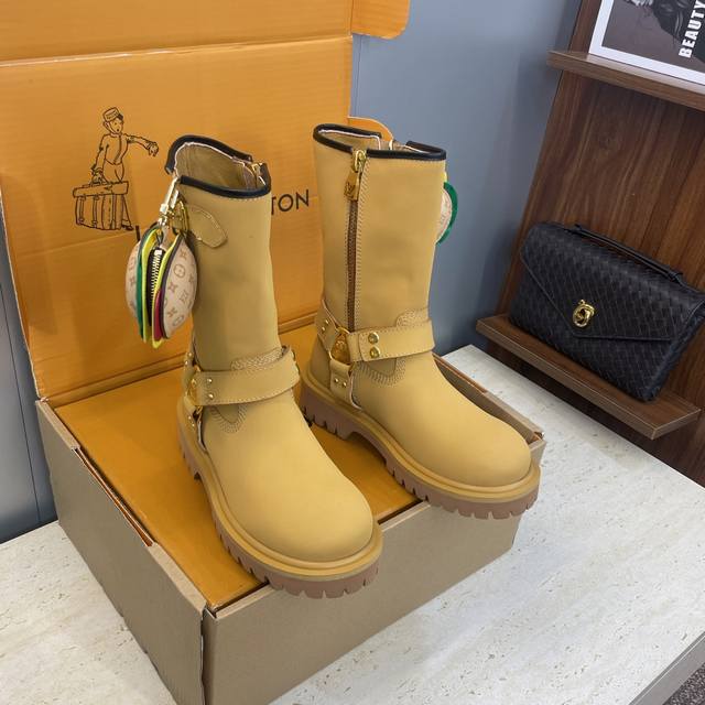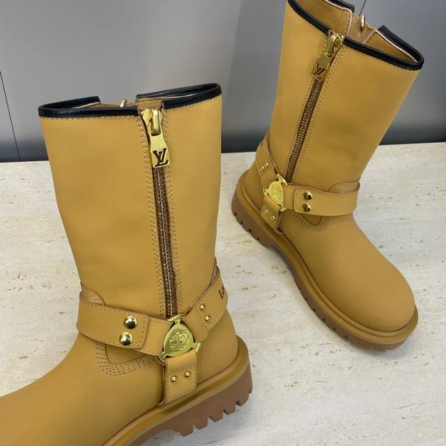 Factory direct price, no bag included. Louis Vuitton x Timberland collaboration 2025 Fall/Winter new style couple's nomadic style lace-up motorcycle ankle boots with Lv logo, hardware buckle, hamburger decoration, thick sole, color blocking, slip-on riding boots. Material: Imported silk cowhide upper, split beaded cowhide + water-dyed sheepskin lining + original molded outsole. Size: Women's sizes 35-41, 40, 41 (custom orders, no returns/exchanges); Men's sizes 39-44, 45 (custom orders, no returns/exchanges).