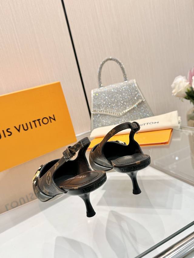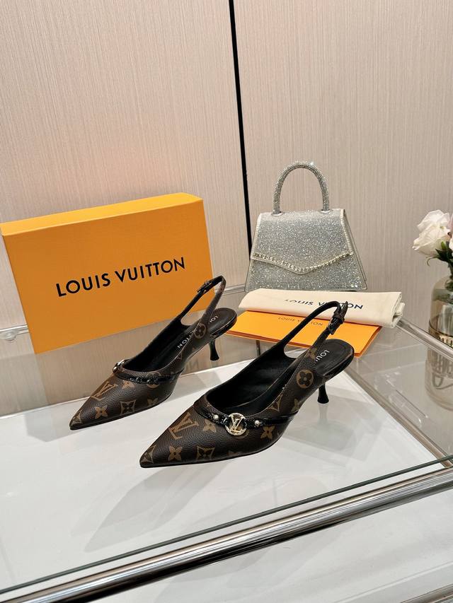 Factory direct wholesale: Louis Vuitton 2025 official website early spring collection! Perfect last, new pointed toe design, updated simultaneously with the official website. The pointed toe is paired with a hollowed-out leather strip and a small square buckle for adjustable tightness. The Lv hardware "Logo" adds a touch of detail, creating a visually stunning effect that perfectly embodies Lv's elegant temperament. Comfortable to wear and very feminine. New original molded last, perfect 1:1 shape, exquisite workmanship, imported high-end fabrics presenting a refined texture! Fabric: Imported lambskin, cow patent leather monogram denim; High-quality soft lambskin lining; Insole: Imported goatskin; Italian genuine leather outsole; 5.5 painted heel; Sizes: 34-41 (34.40, 41, custom orders are non-refundable and non-exchangeable).