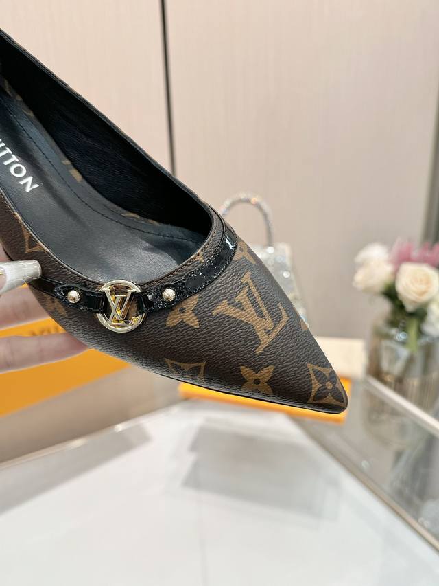 Factory direct wholesale: Louis Vuitton 2025 official website early spring collection! Perfect last, new pointed toe design, updated simultaneously with the official website. The pointed toe is paired with a hollowed-out leather strip and a small square buckle for adjustable tightness. The Lv hardware "Logo" adds a touch of detail, creating a visual feast that cannot conceal Lv's elegant temperament. Just right, comfortable to wear, and very feminine. New original molded last, perfect 1:1 shape, exquisite workmanship, imported high-end fabric presents a refined texture! Fabric: Imported lambskin, cow patent leather monogram denim; High-quality soft lambskin lining; Insole: Imported goatskin; Italian genuine leather outsole; 5.5 painted heel; Sizes: 34-41 (34.40, 41, custom orders are non-refundable and non-exchangeable).