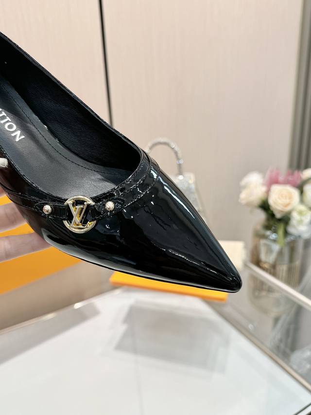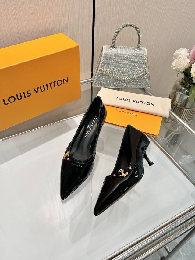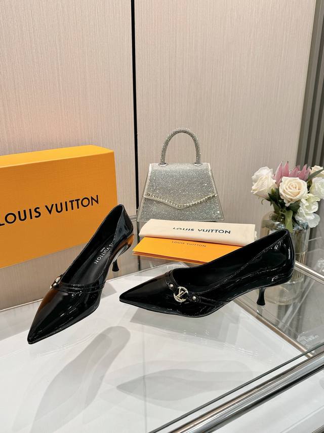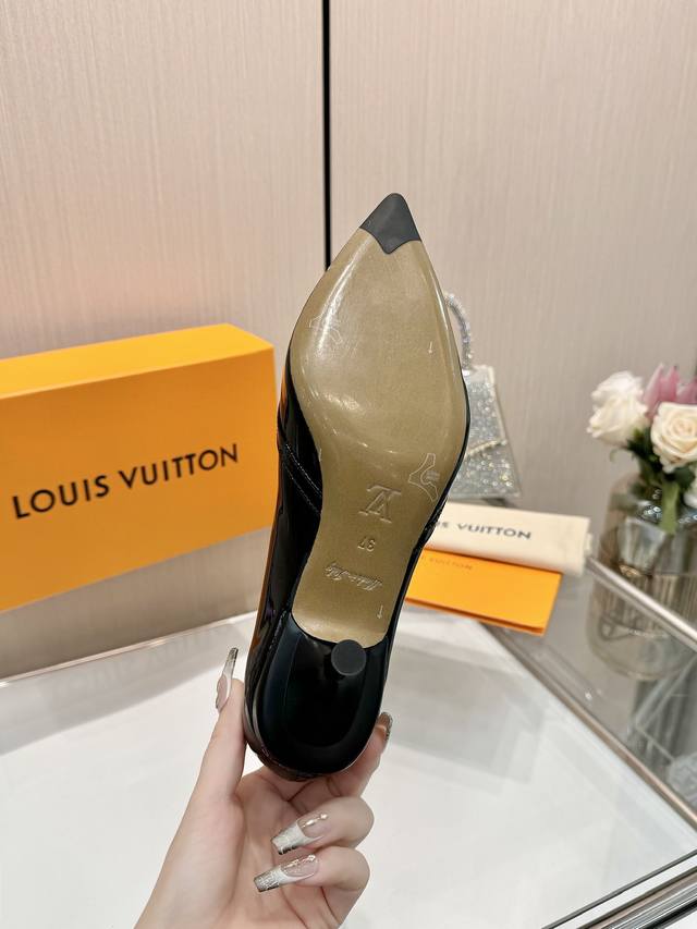 Factory direct wholesale: Louis Vuitton 2025 official website early spring collection! Perfect last, new pointed toe design, updated simultaneously with the official website. The pointed toe is paired with a hollowed-out leather strip and a small square buckle for adjustable tightness. The Lv hardware "Logo" adds a touch of detail, creating a visually stunning effect that perfectly embodies Lv's elegant temperament. Comfortable to wear and very feminine. New original molded last, perfect 1:1 shape, exquisite workmanship, imported high-end fabrics presenting a refined texture! Fabric: Imported lambskin, cow patent leather monogram denim; High-quality soft lambskin lining; Insole: Imported goatskin; Italian genuine leather outsole; 5.5 painted heel; Sizes: 34-41 (34.40, 41, custom orders are non-refundable and non-exchangeable).