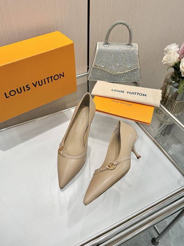 Factory direct wholesale: Louis Vuitton 2025 official website early spring collection! Perfect last, new pointed toe design, updated simultaneously with the official website. The pointed toe is paired with a hollowed-out leather strip and a small square buckle for adjustable tightness. The Lv hardware "Logo" adds a touch of detail, creating a visual feast that cannot conceal Lv's elegant temperament. Just right, comfortable to wear, and very feminine. New original molded last, perfect 1:1 shape, exquisite workmanship, imported high-end fabric presents a refined texture! Fabric: Imported lambskin, cow patent leather monogram denim; High-quality soft lambskin lining; Insole: Imported goatskin; Italian genuine leather outsole; 5.5 painted heel; Sizes: 34-41 (34.40, 41, custom orders are non-refundable and non-exchangeable).