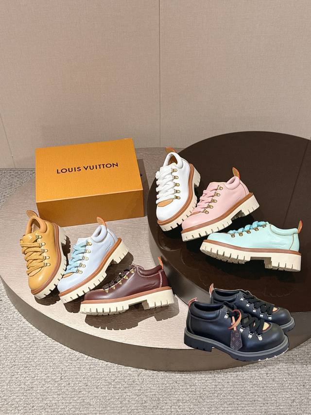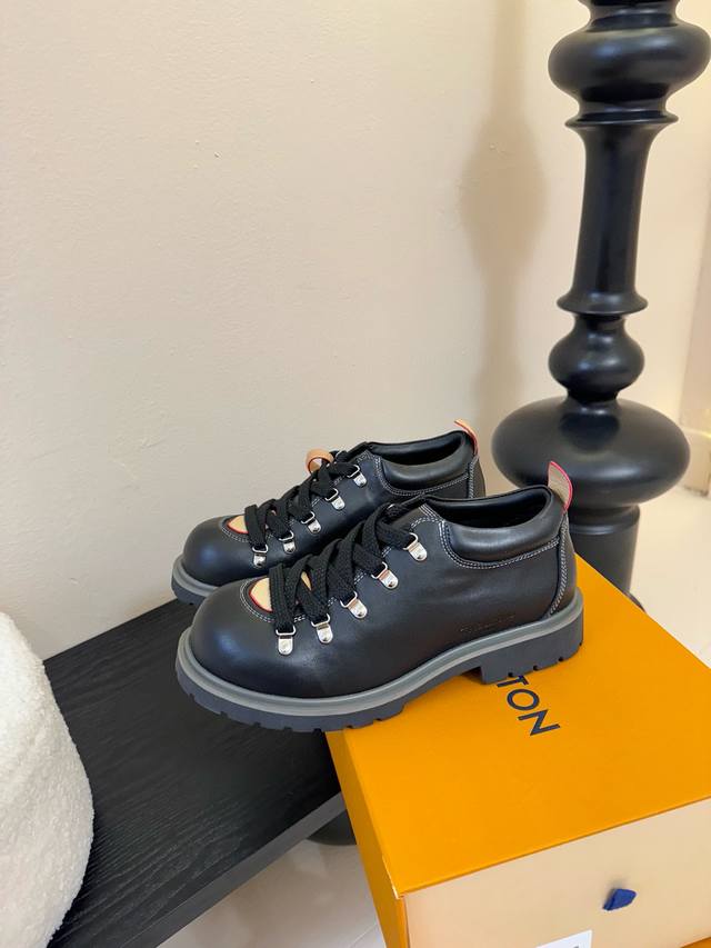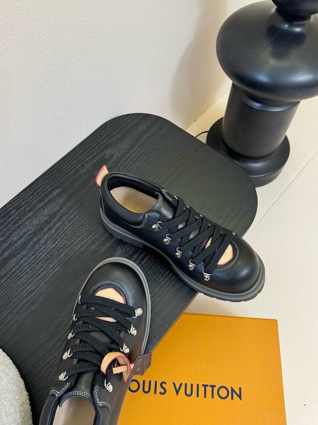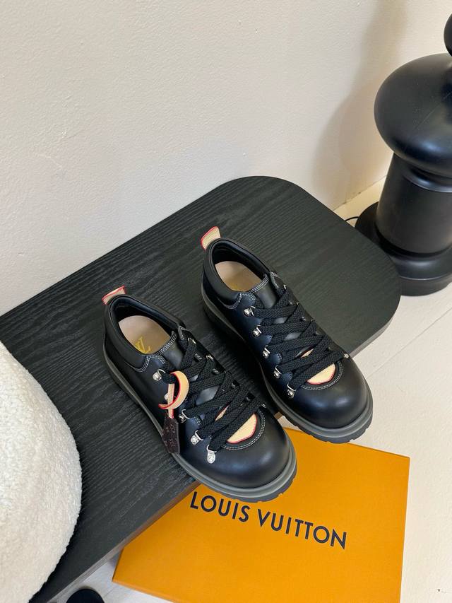 Lv Remix Derby. Donkey's new Derby shoe draws inspiration from the classic hiking boot, reimagining its proportions for a sleek, fashion-forward silhouette. The upper incorporates thick laces and a hook emblazoned with monogrammed flowers. Details are taken from Louis Vuitton leather goods, particularly the monogrammed canvas key ring and the natural leather back label with yellow stitching. The shoe features a thick rubber outsole. Sizes: 35-46. Men's 45-46 custom