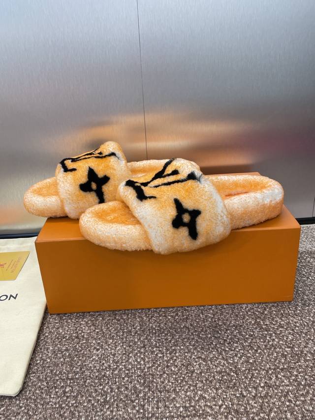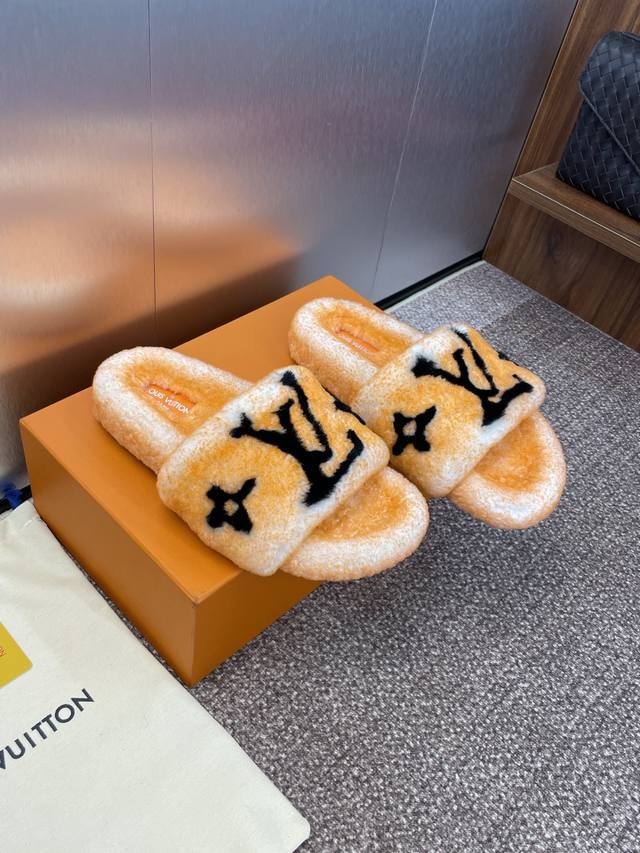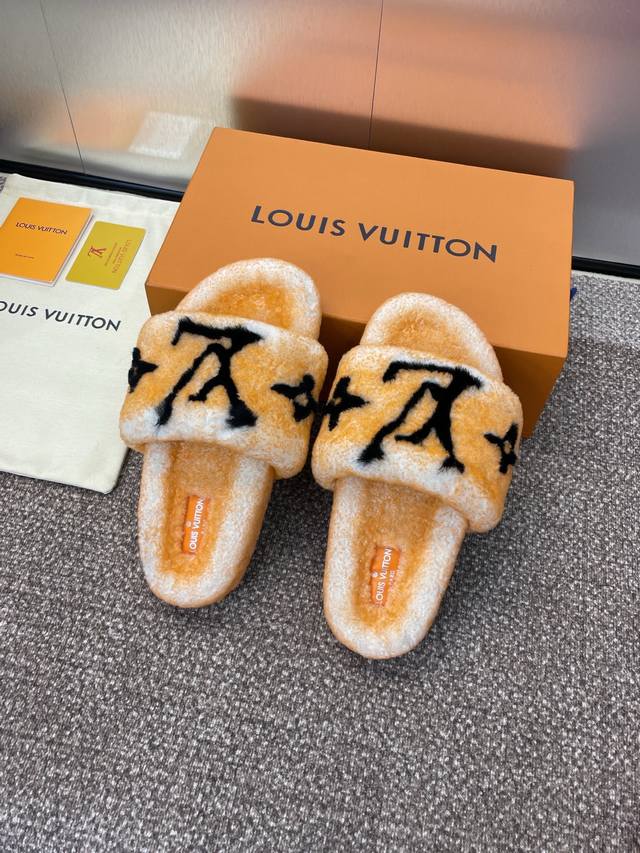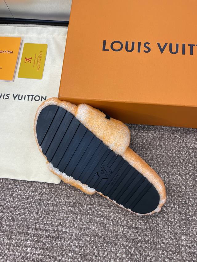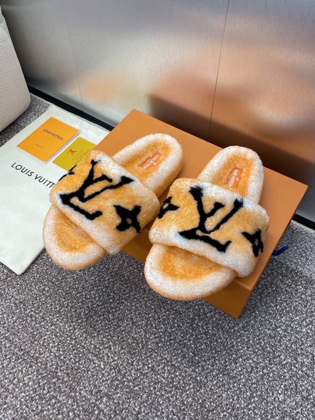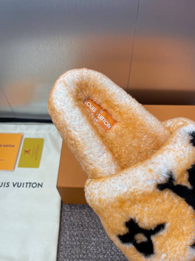 Louis Vuitton 2025 autumn and winter new fashion versatile lambswool women's slippers Lv letter logo flat bottom round head color matching open toe home shoes