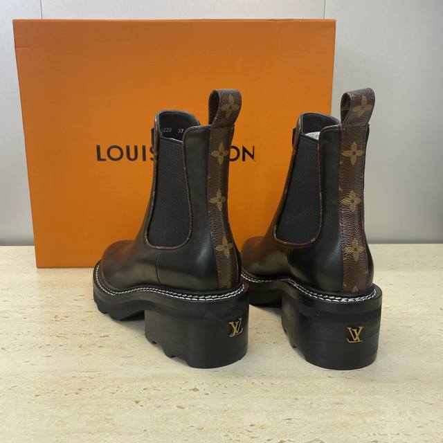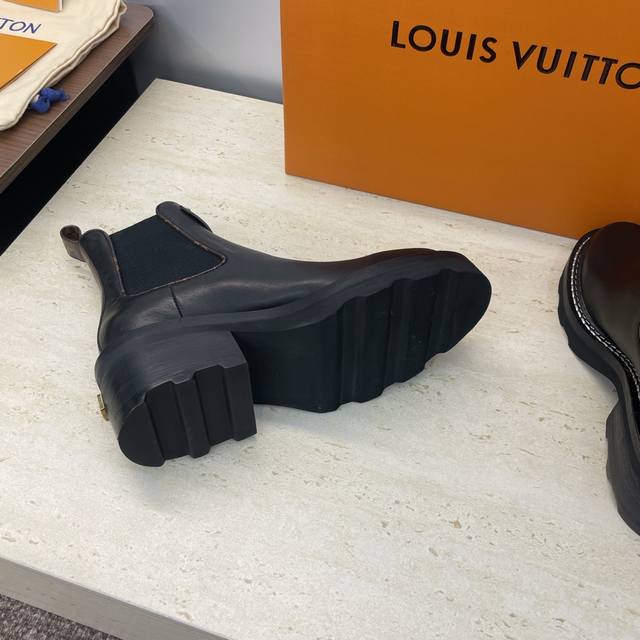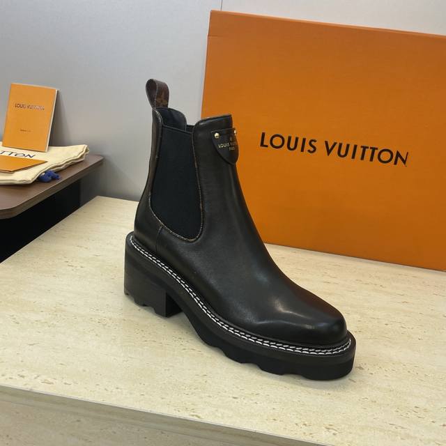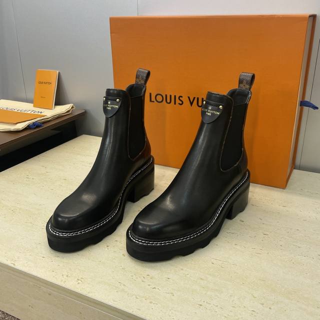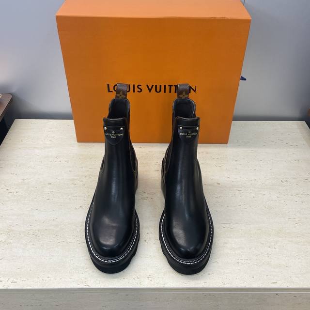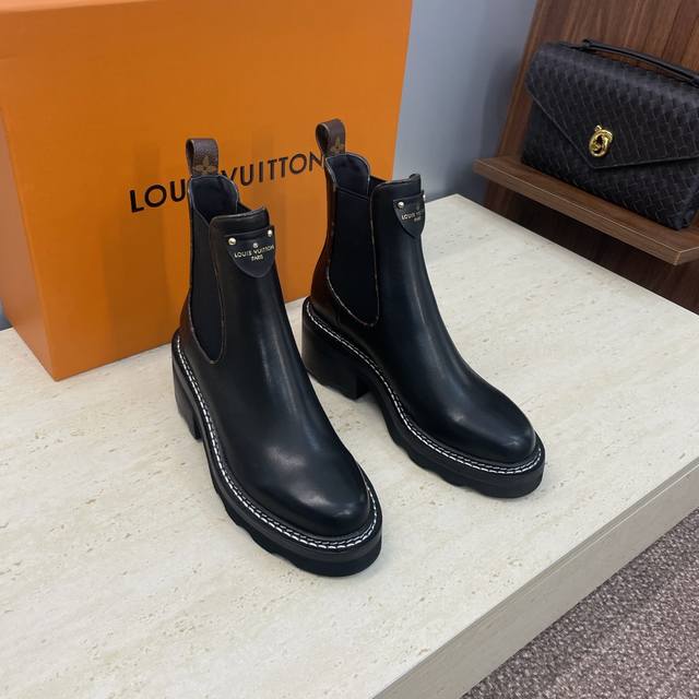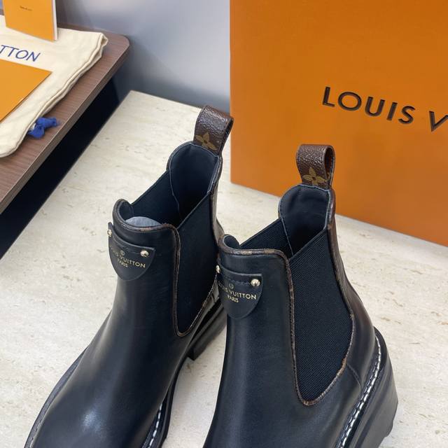 Factory price DDD Louis Vuitton* 2025 Autumn/Winter New Chelsea Style Stretch Motorcycle Ankle Boots LV Logo Hardware Buckle Thick Sole Low Heel Color Block Slip-on Riding Boots DDD Material: Upper: Imported calfskin, imported monogram leather, imported suede + water-dyed cowhide lining + original mold genuine leather welt combination outsole DDD Heel height: 5.5Cm DDD Size: Women's sizes 35-42 42 custom sizes are non-refundable DDD