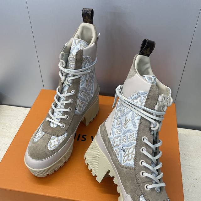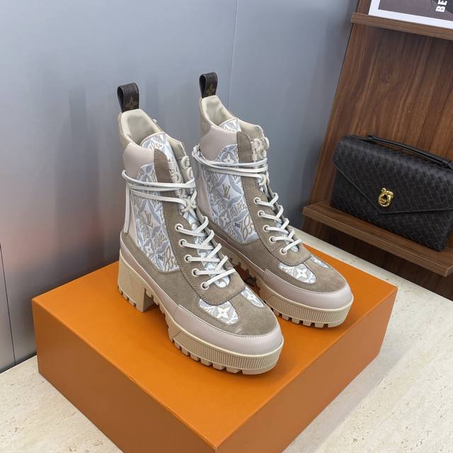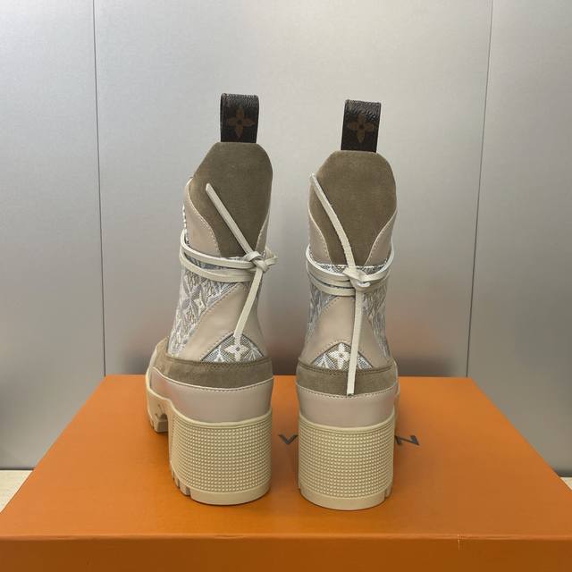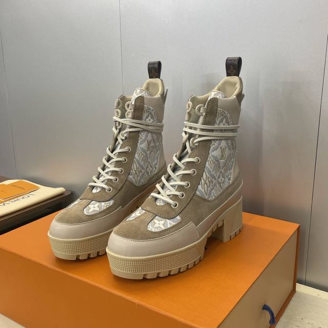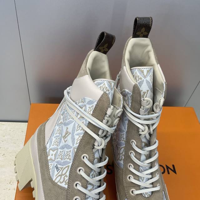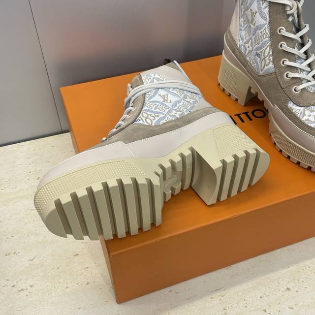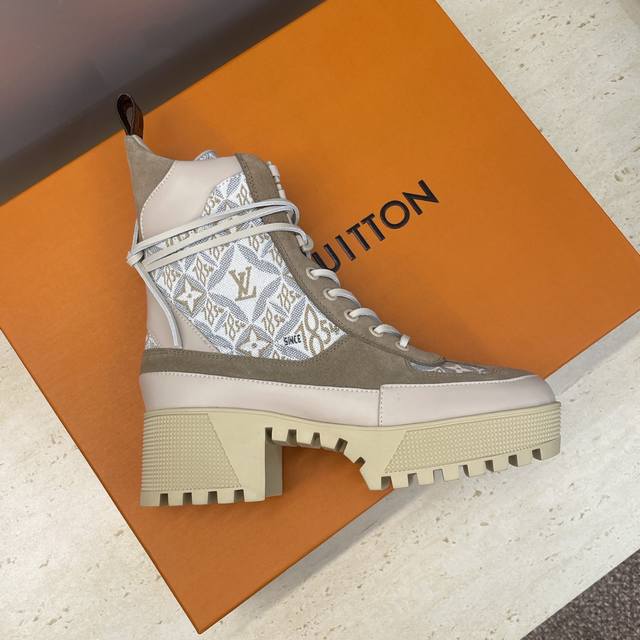 Factory Price DDD Louis Vuitton* 2025 Autumn/Winter New Lace-up Motorcycle Ankle Boots Lv Logo Thick Sole Low Heel Waterproof Platform Color Block Riding Boots DDD Material: Imported calfskin upper, imported monogram leather, imported suede, imported environmentally friendly breathable technical fabric + water-dyed cowhide lining + original molded outsole DDD Heel height: 6cm DDD Size: Women's sizes 35-42, size 42 is custom-made and non-refundable DDD