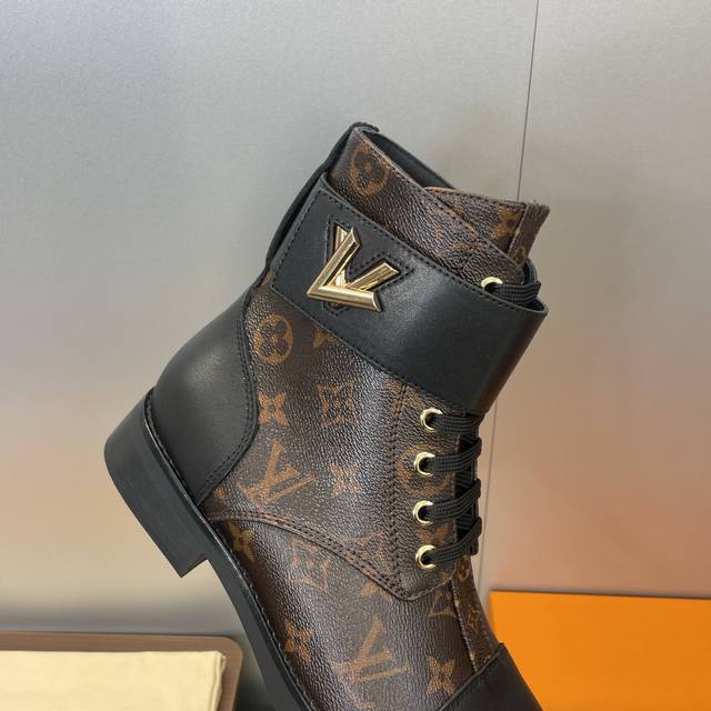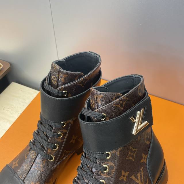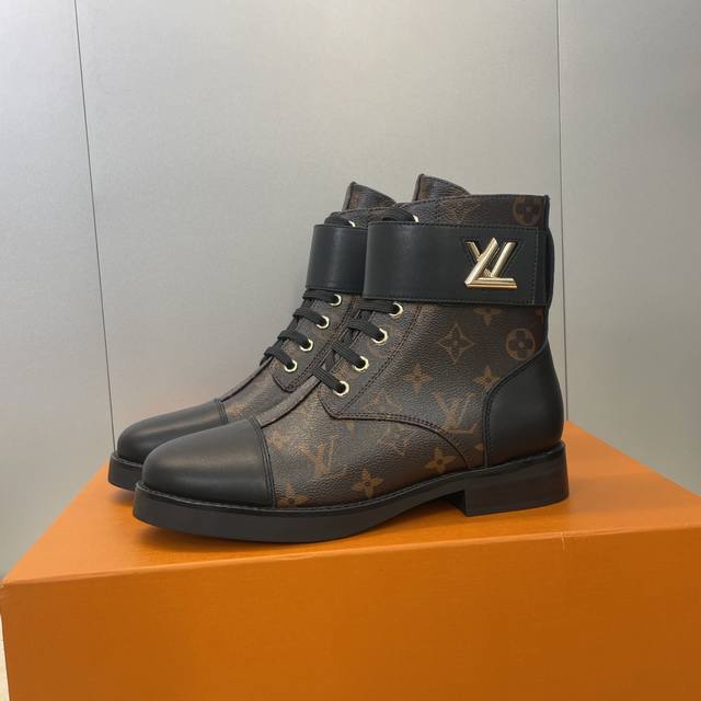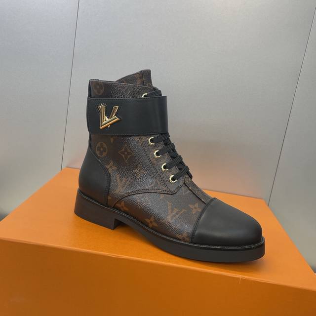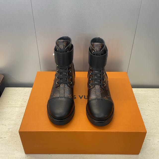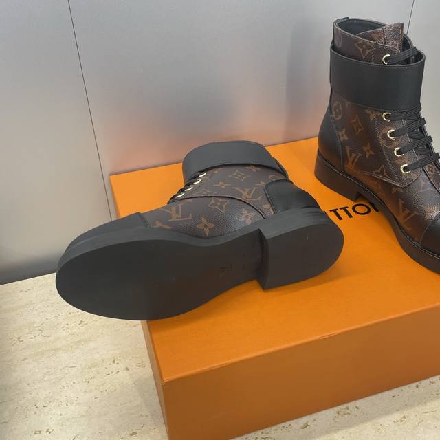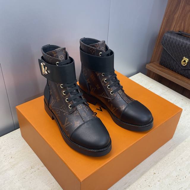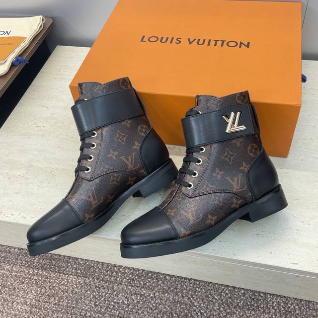 Factory price DDD Louis Vuitton* 2025 Autumn/Winter New Punk Style Lace-up Motorcycle Ankle Boots LV Logo Hardware Buckle Low Heel Color Block Riding Boots DDD Material: Imported split-edge cowhide upper, imported monogram leather + water-dyed cowhide lining + original molded outsole DDD Size: Women's sizes 35-42 42 custom sizes are non-refundable DDD