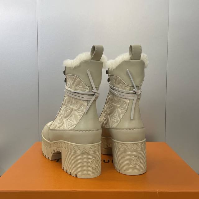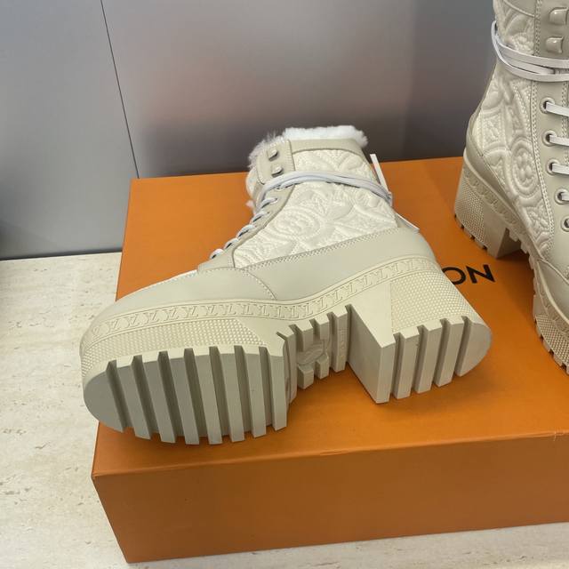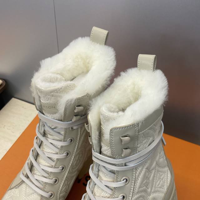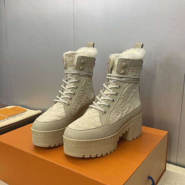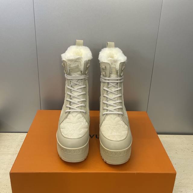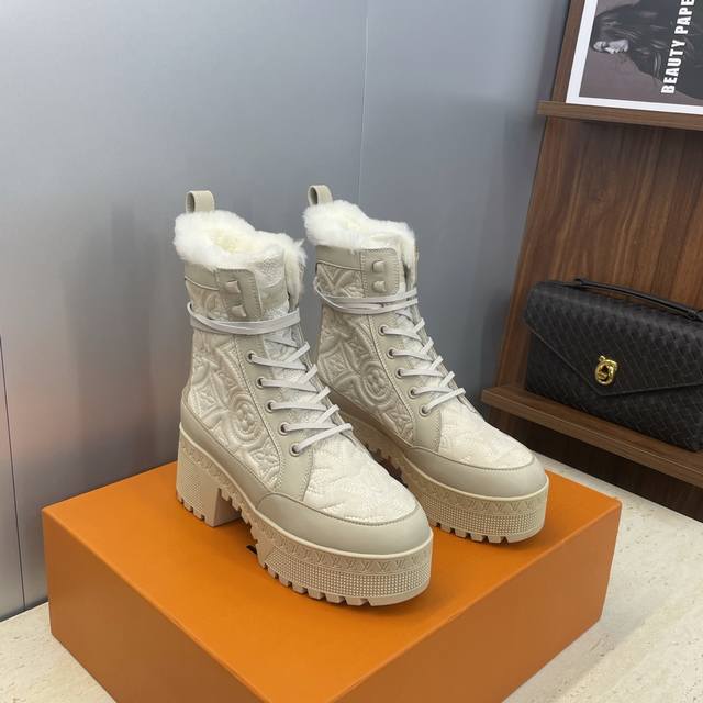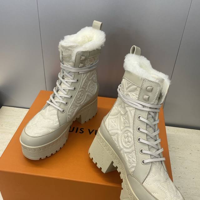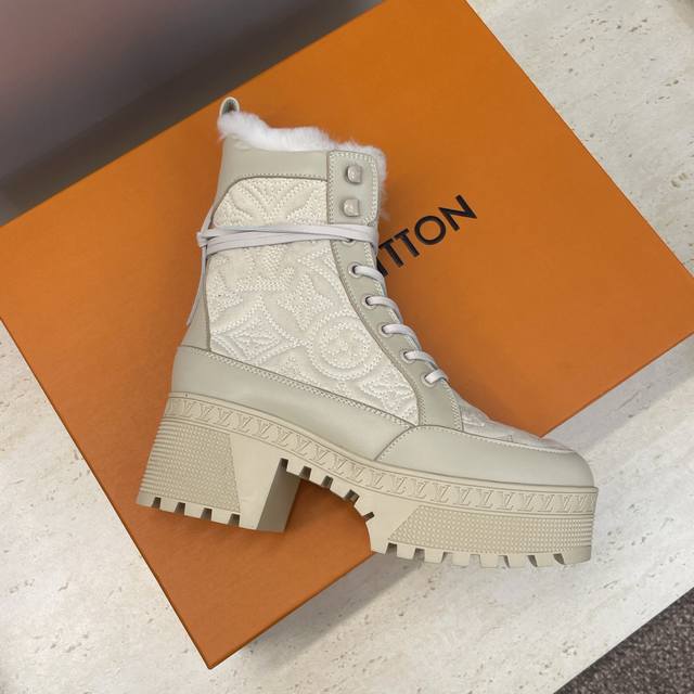 Factory Price DDD Louis Vuitton* 2025 Autumn/Winter New Style Cold-proof Warm Lambswool Lace-up Motorcycle Embroidered Ankle Boots LV Logo Thick Sole Low Heel Waterproof Platform Color Block Riding Boots DDD Material: Imported calfskin upper, imported environmentally friendly breathable embroidered technical fabric + lambswool lining + original molded outsole DDD Heel height: 6cm DDD Size: Women's sizes 35-42 42 custom sizes are non-refundable DDD