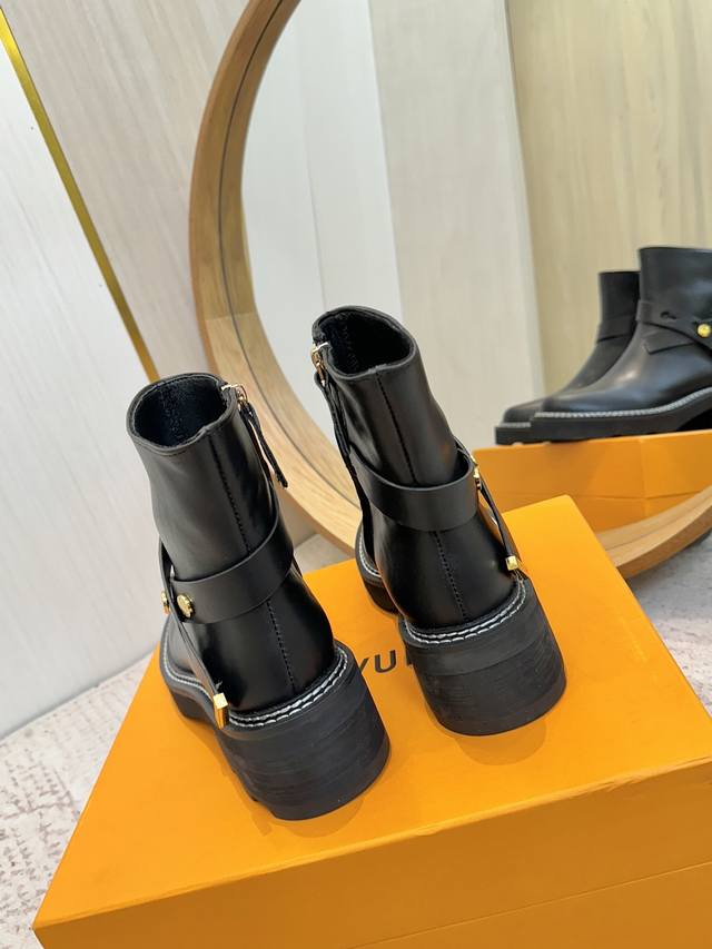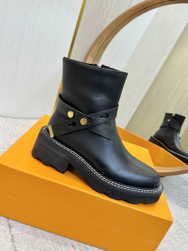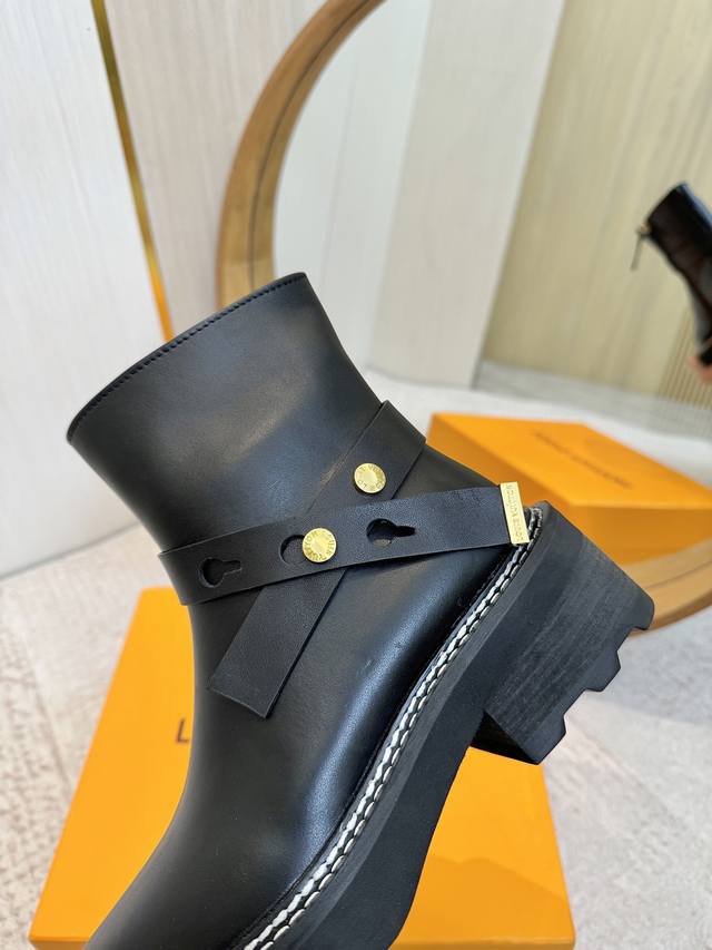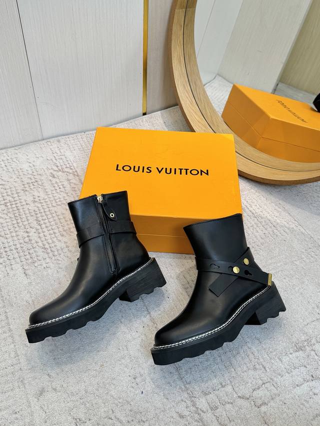 Louis Vuitton 2025 Fall/Winter High-End Custom-Made Boots, a classic design worn by numerous celebrities and influencers on runway shows. Exquisite craftsmanship, comfortable fit, and easy on and off with a side zipper. This Beaubourg ankle boot is crafted from smooth cowhide leather, featuring delicate straps and engraved buckles, highlighting a relaxed biker style. A chunky heel and lightweight micro-outsole accentuate the contrasting stitching. Outer material: Full-grain cowhide. Lining: Cowhide. Buckles: Original mold. Outsole: Original mold. Colors: Black, Brown. Sizes: 35-42.