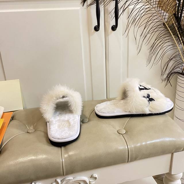 Factory Price P, Louis Vuitton*Lv New Mink Fur Slippers, Mink Fur Embroidered Logo Upper, Wool Insole, Rubber Sole, Sizes 35-39, 40-42, Custom Made, No Returns or Exchanges
